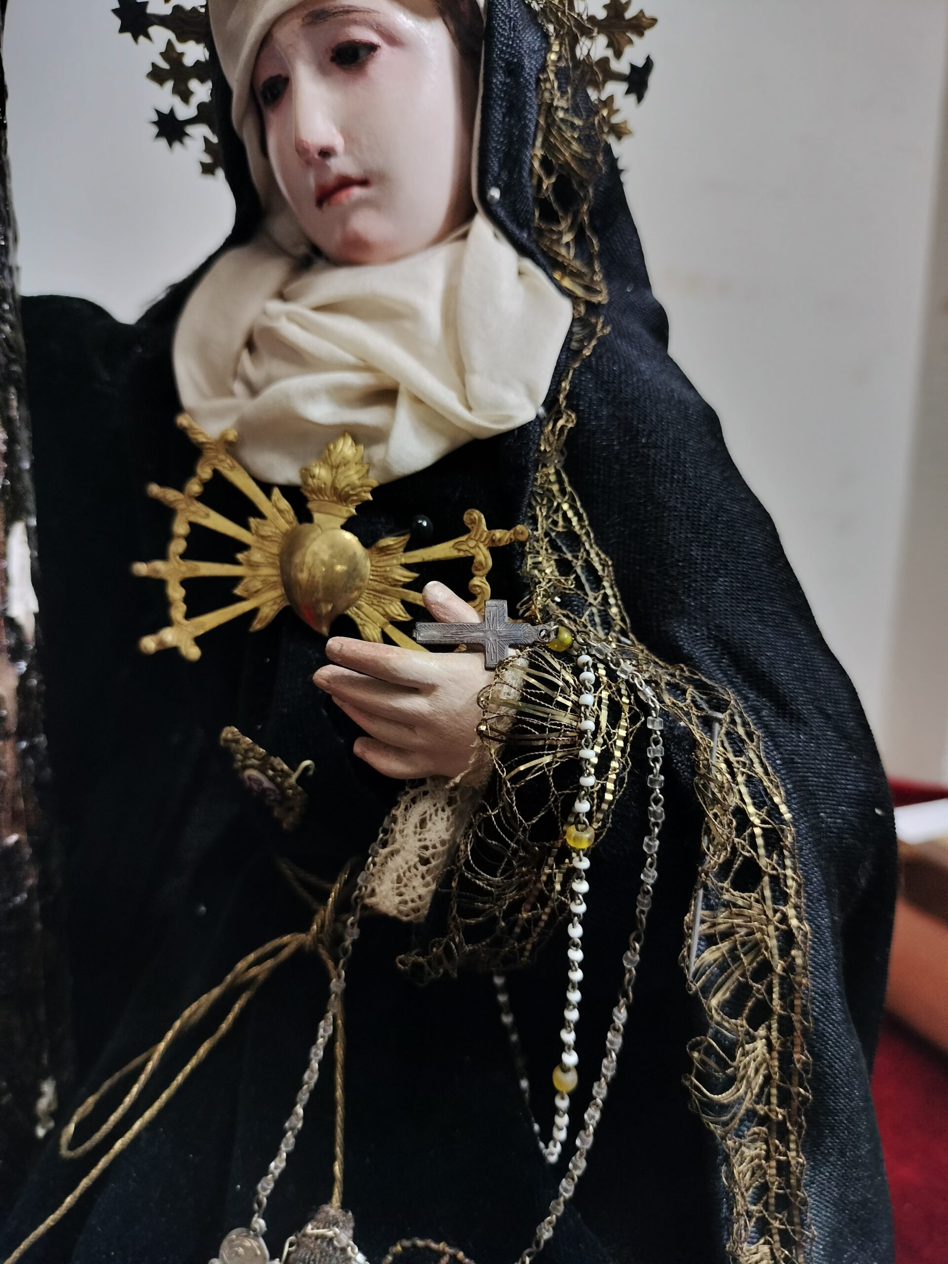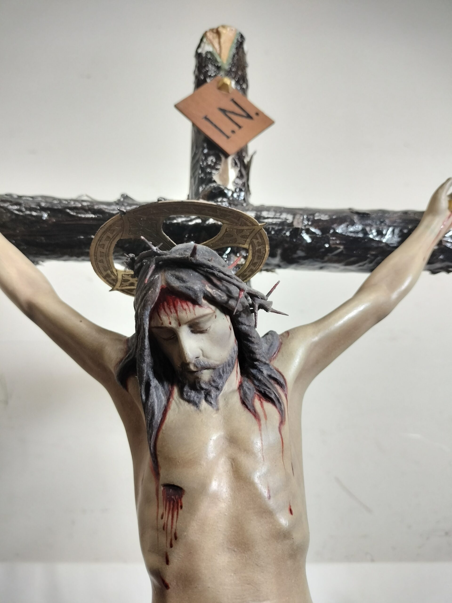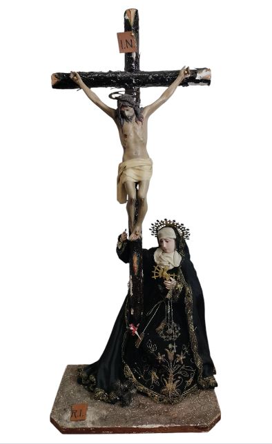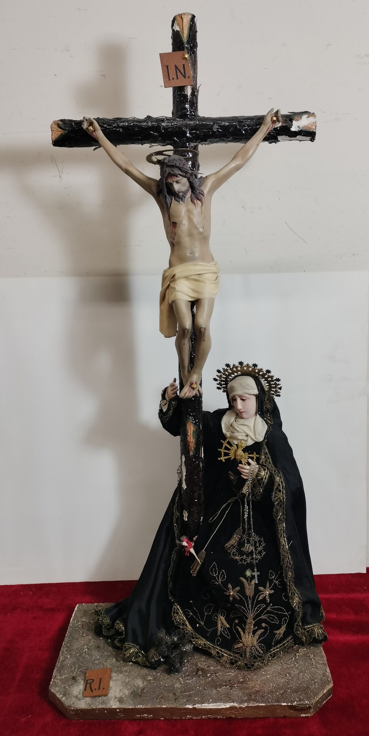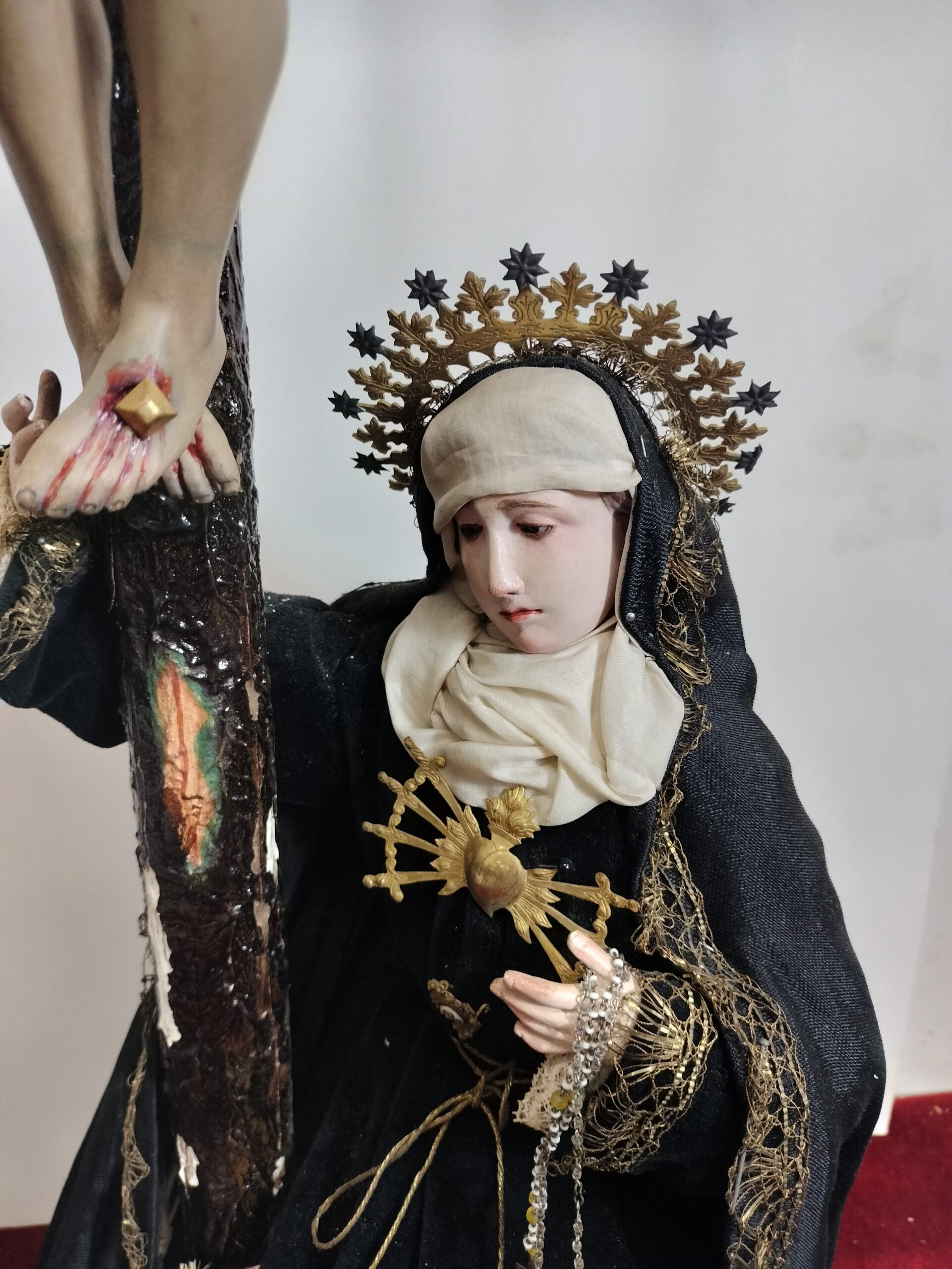 VER IMÁGENES PARA COMPROBAR EL ESTADO REAL. LAS IMÁGENES FORMAN PARTE DE LA DESCRIPCIÓN. CONJUNTO DE EL CALVARIO EN EL GÓLGOTA. CRISTO CRUCIFICADO Y LA VIRGEN DE LOS DOLORES. TALLA EN MADERA POLICROMADA. CRUZ BARNIZADA, CON IMPORTANTES PÉRDIDAS DE LA CAPA PICTÓRICA SUPERIOR. APLIQUES DE METAL: CORONAS, CLAVOS, CORAZÓN CON SIETE PUÑALES Y ROSARIO. EL CARTEL ‘INRI’, EN MADERA, SE ENCUENTRA ROTO. CONSERVAMOS LA OTRA MITAD. VESTIDO DE LA VIRGEN EN TERCIOPELO, ORNADO CON BORDES EN HILO METÁLICO E IMITACIÓN DE PEDRERÍA. MANTO EN TEJIDO RASO. CONJUNTO DE GRAN EXPRESIVIDAD. PRESENTA NOTABLES DESGASTES. IMPORTANTES PÉRDIDAS DE LA CAPA PICTÓRICA. ESPECIALMENTE EN LA CRUZ Y LA BASE. LIGERAS ROTURAS.