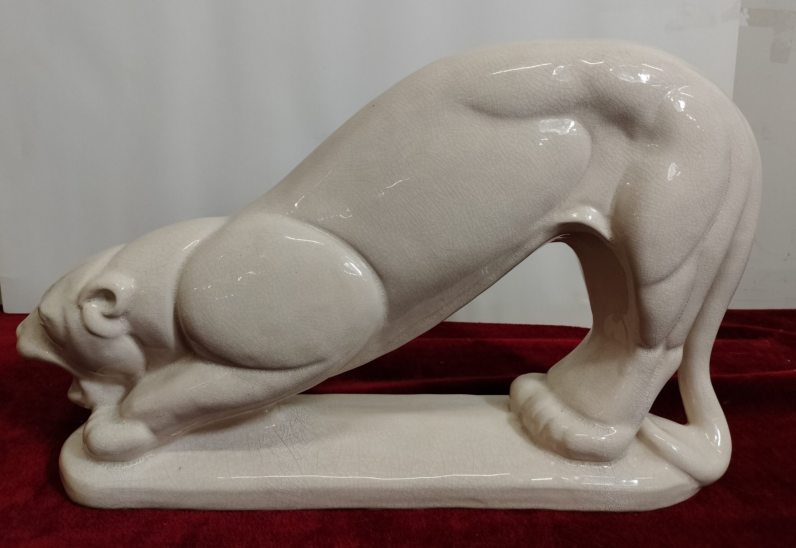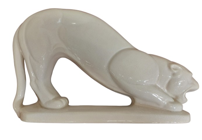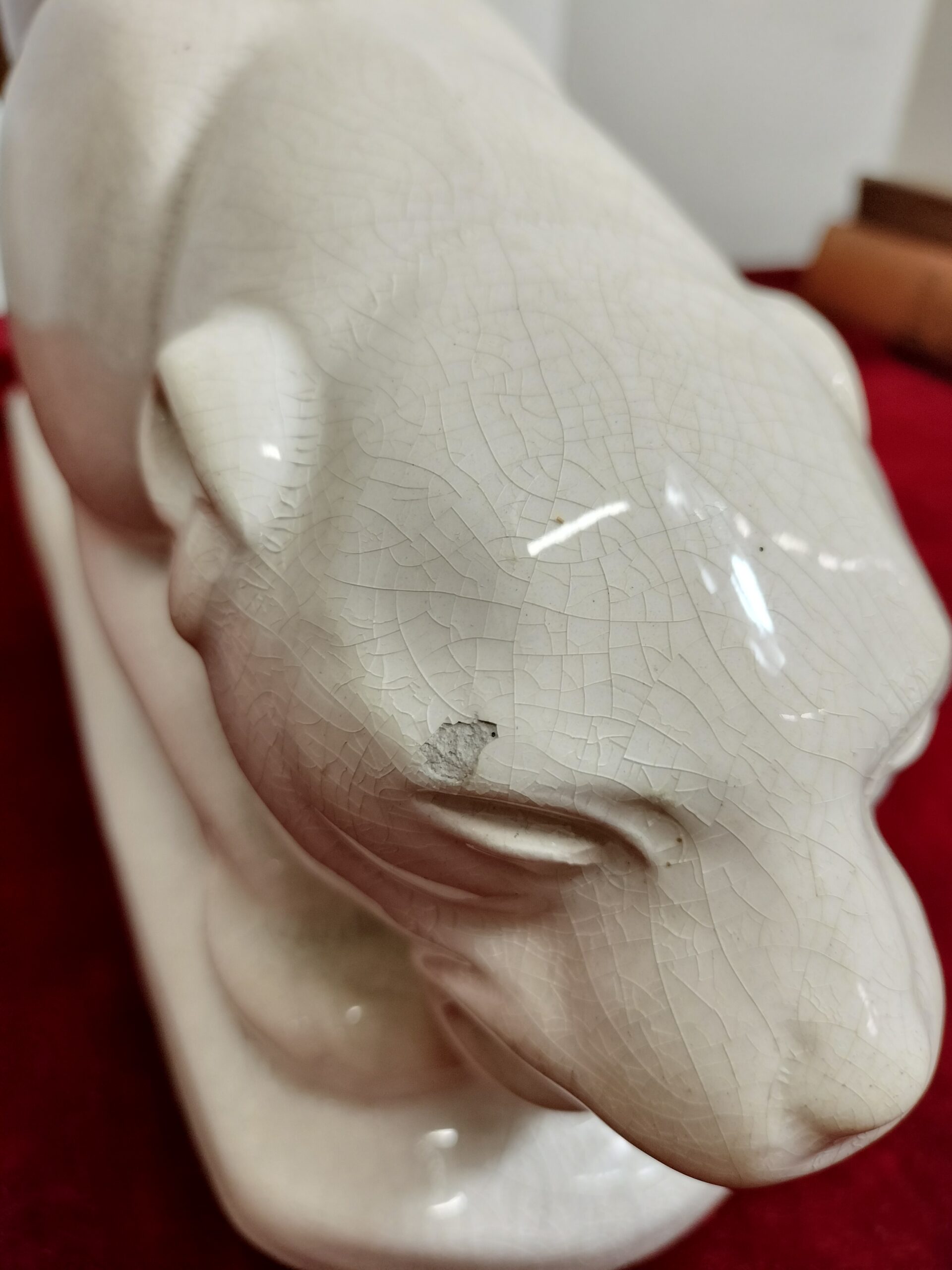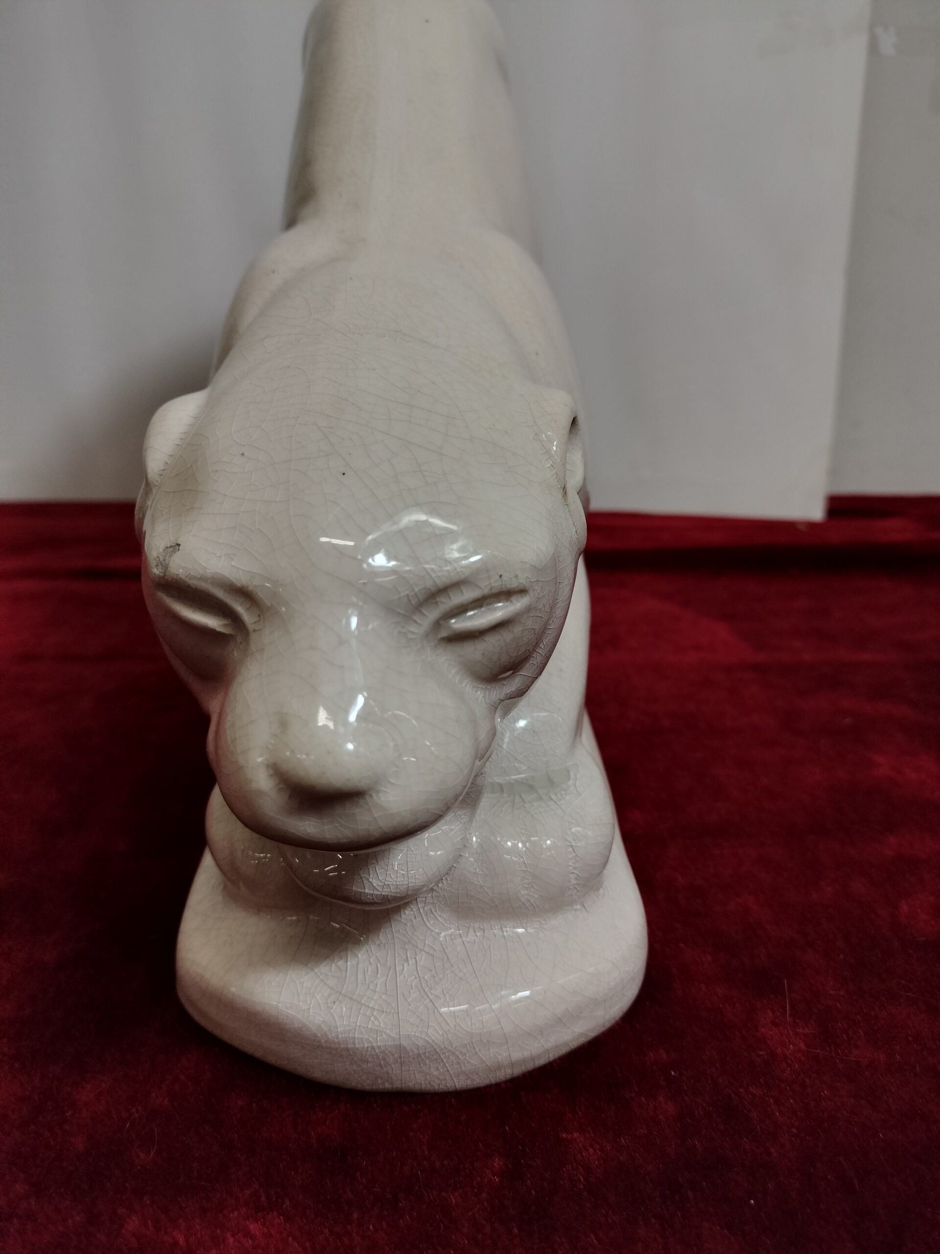 VER IMÁGENES PARA COMPROBAR EL ESTADO REAL.  LAS IMÁGENES FORMAN PARTE DE LA DESCRIPCIÓN.  ESCULTURA DE PANTERA. CERÁMICA VIDRIADA.  ESTILO ART DÉCO.  MARCA DE FABRICANTE EN LA BASE.  PRESENTA LIGERAS EROSIONES, PRINCIPALMENTE EN EL ROSTRO. PEQUEÑAS MANCHAS.