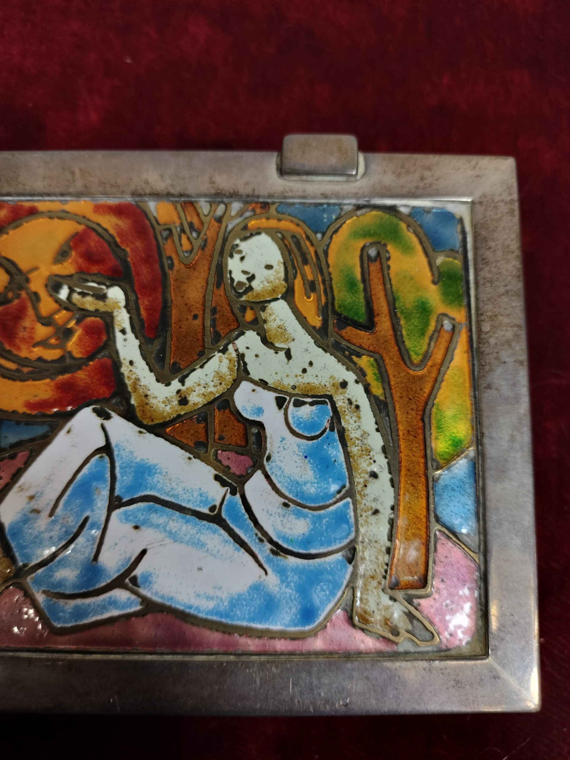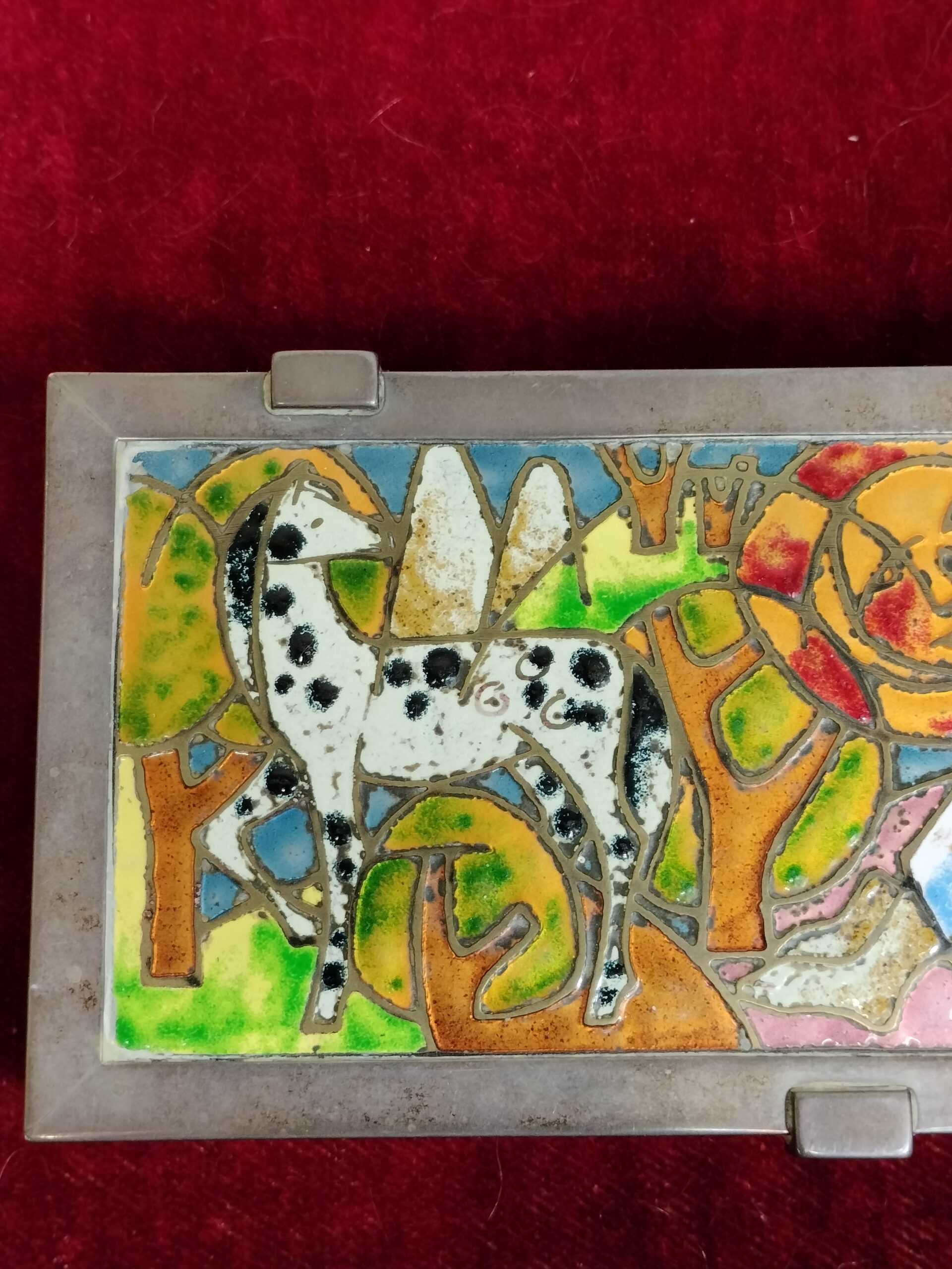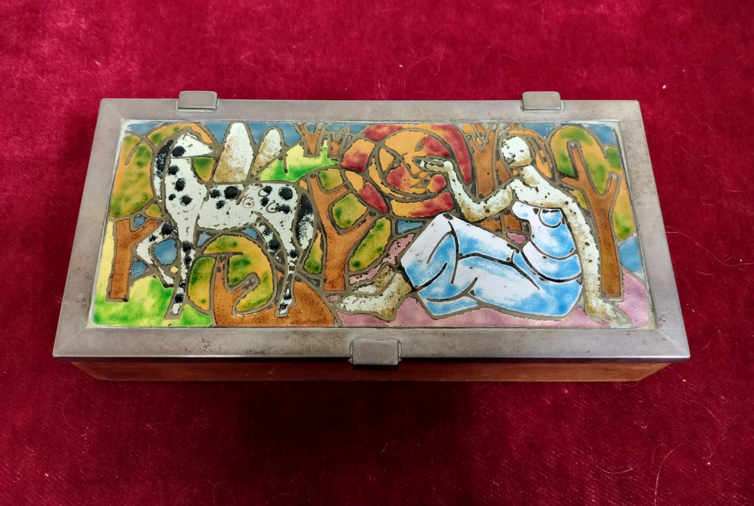VER IMÁGENES PARA COMPROBAR EL ESTADO REAL. LAS IMÁGENES FORMAN PARTE DE LA DESCRIPCIÓN. CAJA DE MADERA. TAPA DE PLATA, ESMALTADA CON LA ESCENA DE UN CABALLO CON UNA MUJER. ESTILO ART NOUVEAU. SIN PUNZÓN APARENTE. PRESENTA IMPORTANTES EROSIONES EN EL ESMALTE. LIGEROS RESTOS DE ÓXIDO.
