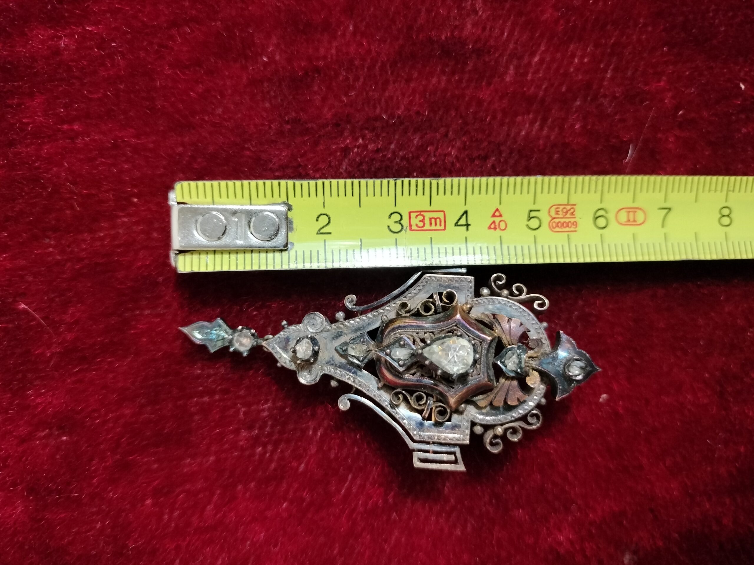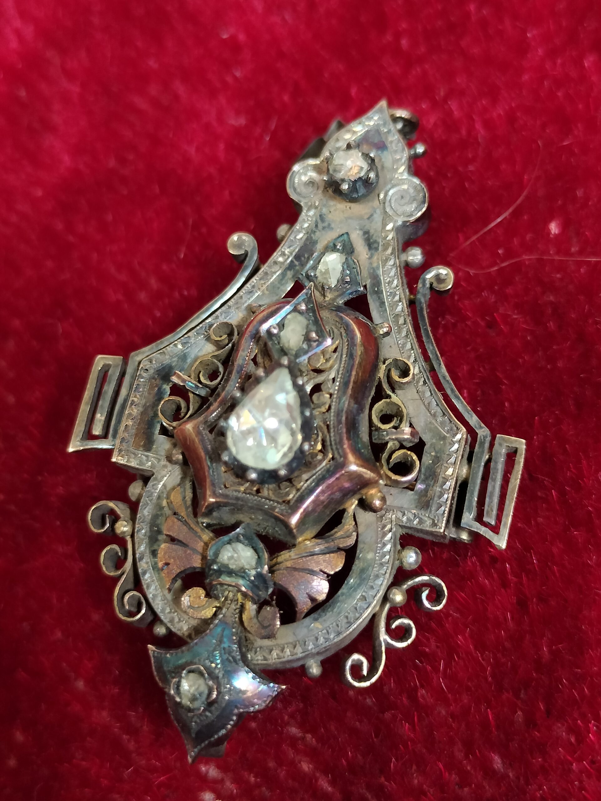 VER IMÁGENES PARA COMPROBAR EL ESTADO REAL.  LAS IMÁGENES FORMAN PARTE DE LA DESCRIPCIÓN.  COLGANTE O BROCHE ALFONSINO.  EN ORO Y DIAMANTES.  SIN FIRMA NI MARCA DE AUTOR.  ORLADO CON FORMAS LOBULADAS, VOLUTAS Y UN BORDE TALLADO CON UNA CENEFA DENTELLADA. 9,01 GRAMOS.  3 X 4,6 APROX.  BUEN ESTADO GENERAL, CON PEQUEÑAS EROSIONES Y SUCIEDAD.