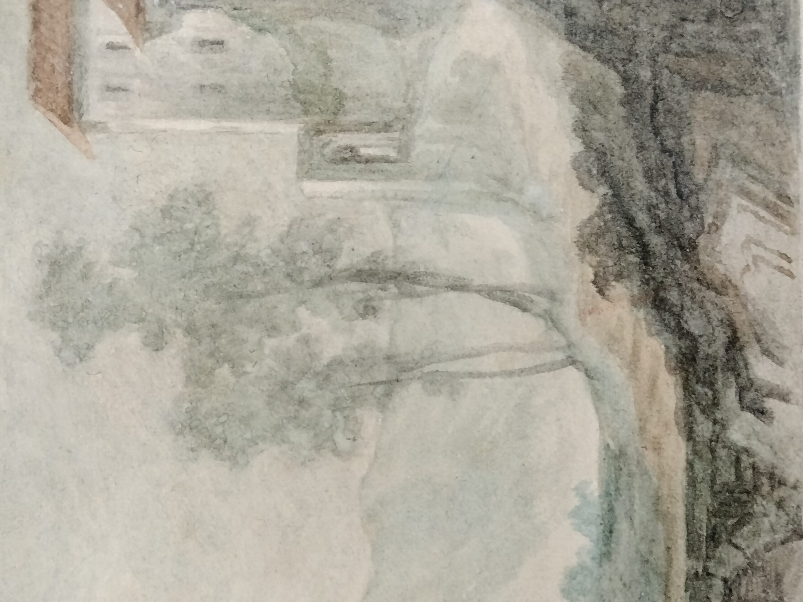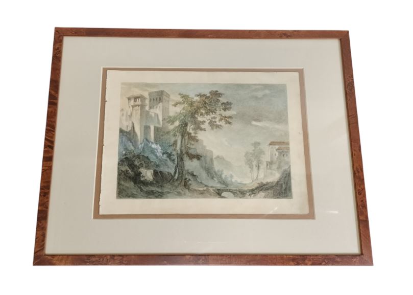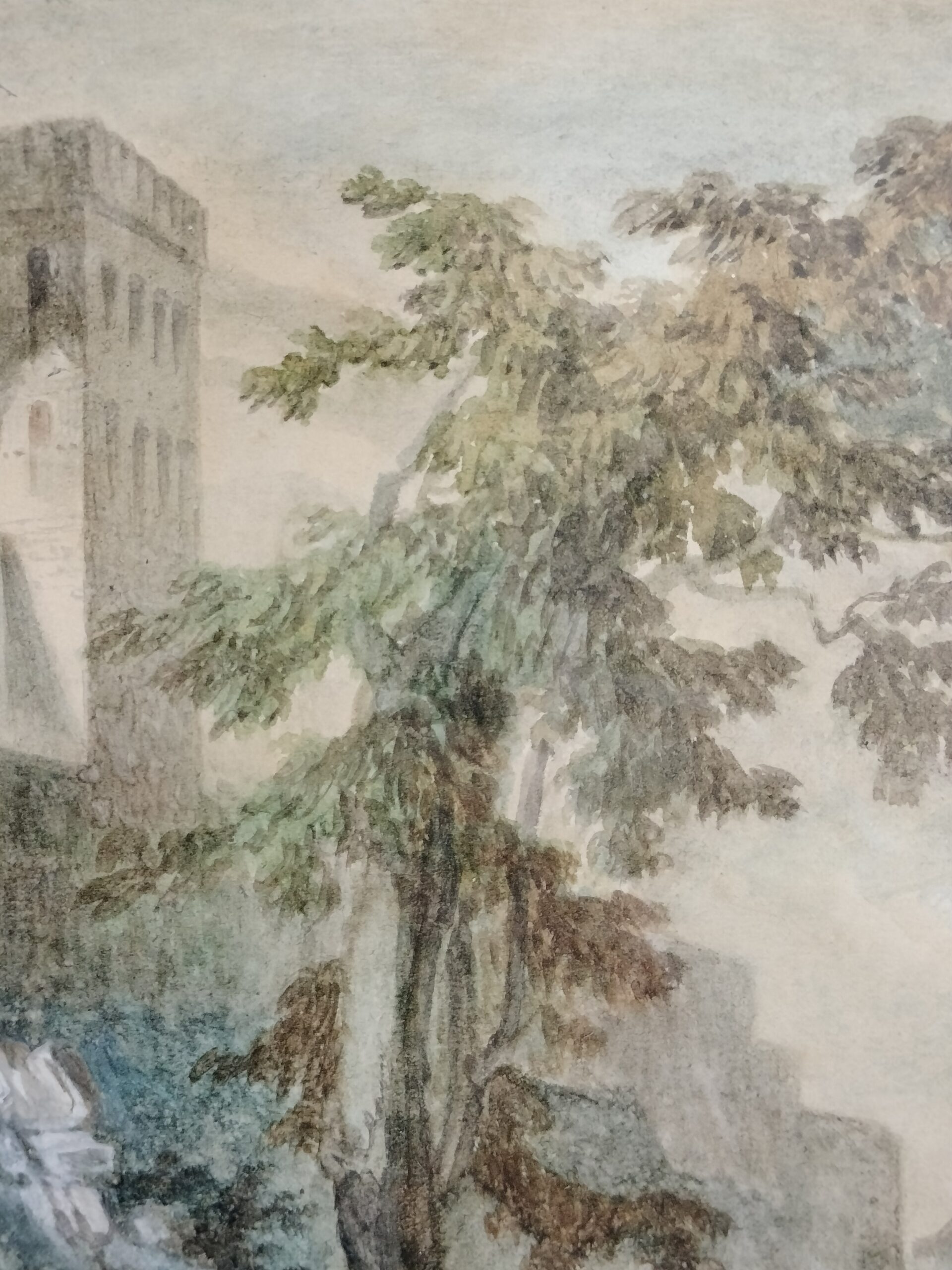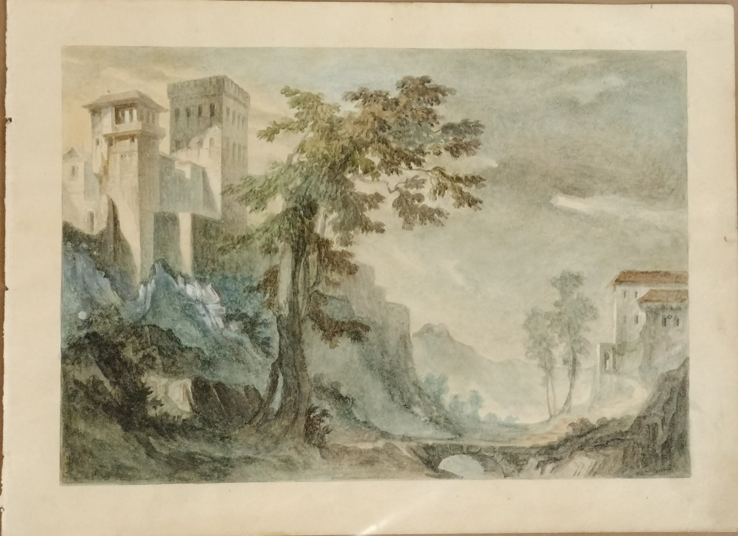 PAISAJE ESCARPADO CON TORREÓN. ACUARELA Y LÁPIZ. EUROPA. PRINCIPIOS DEL SIGLO XIX.