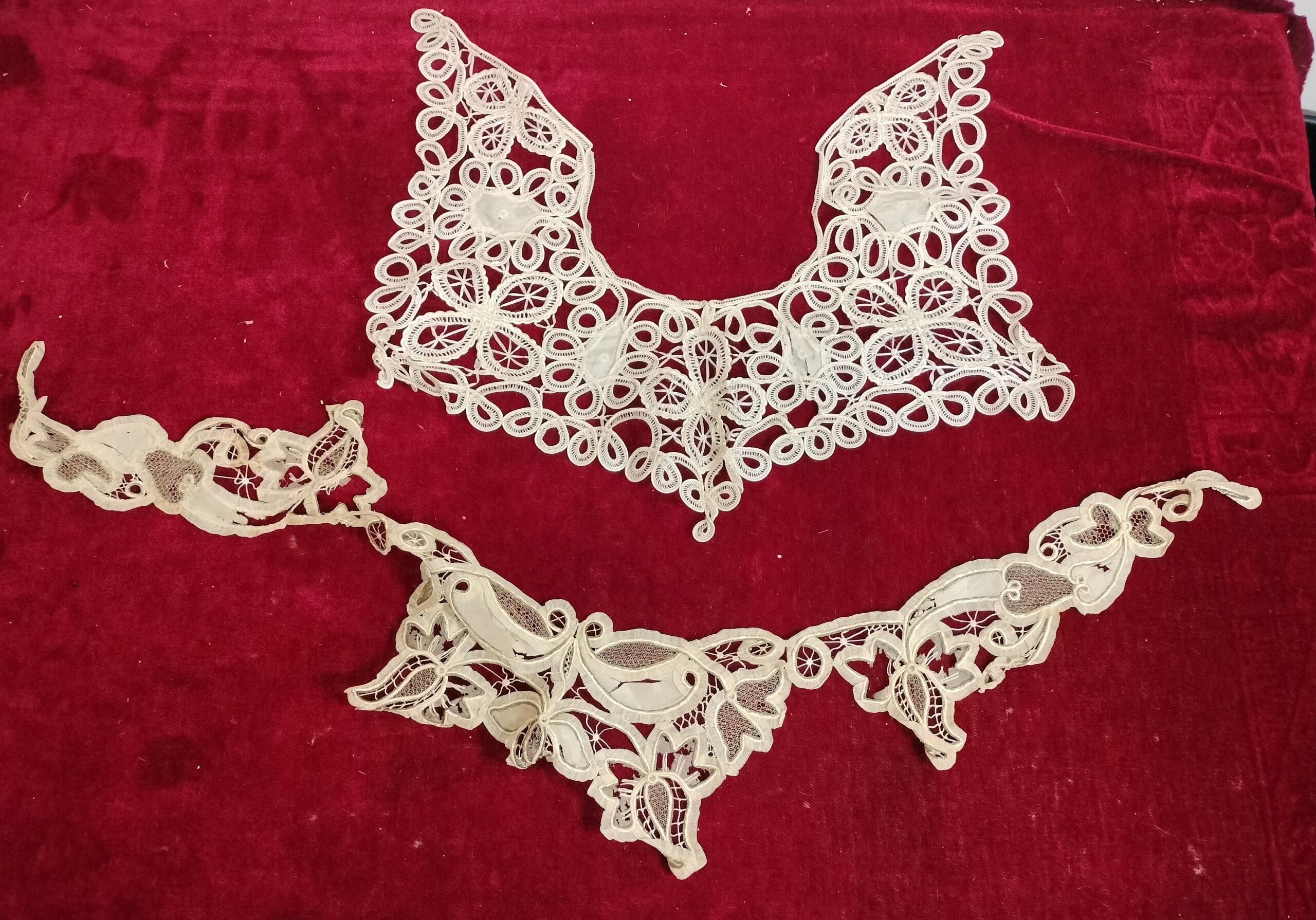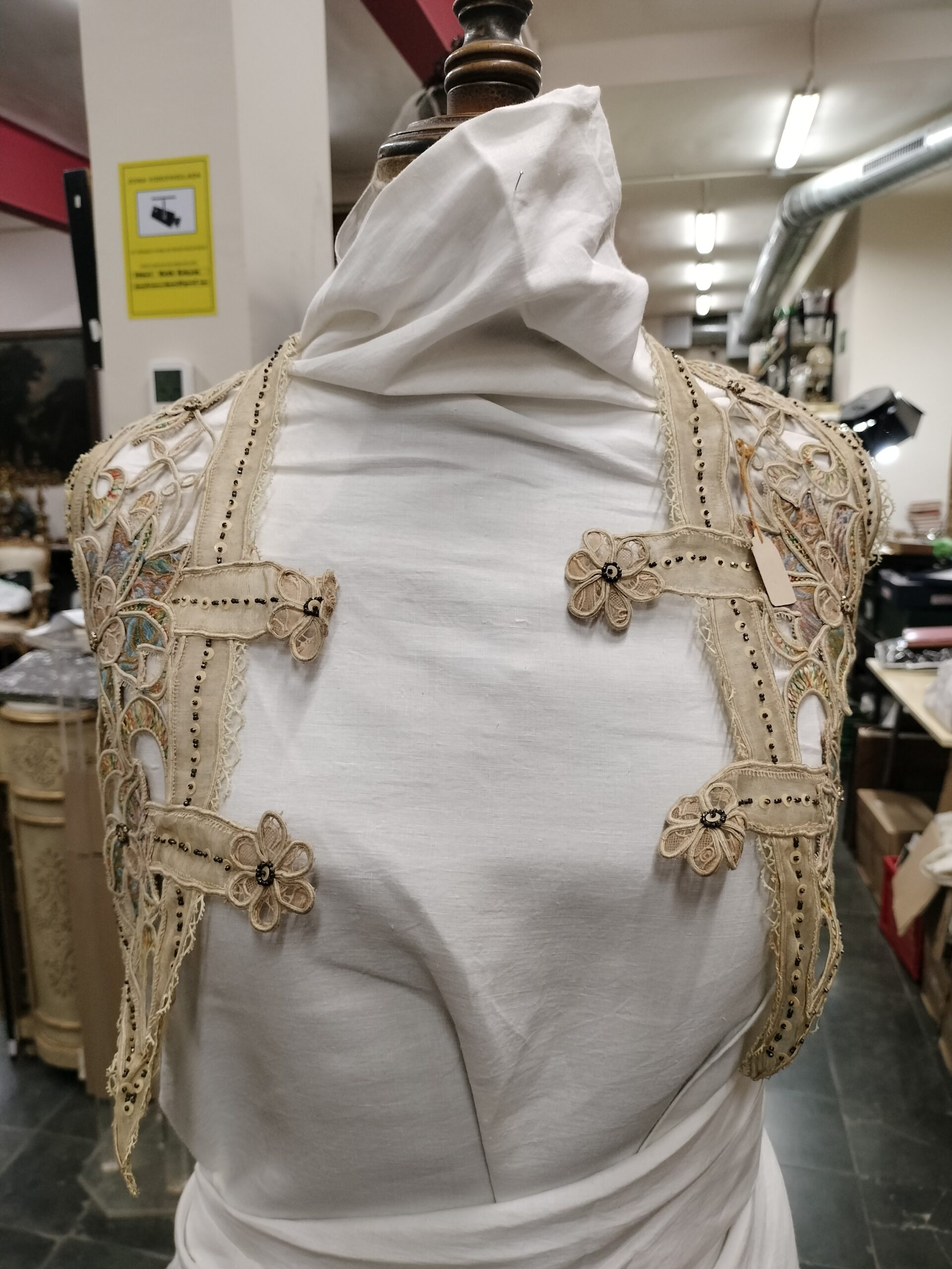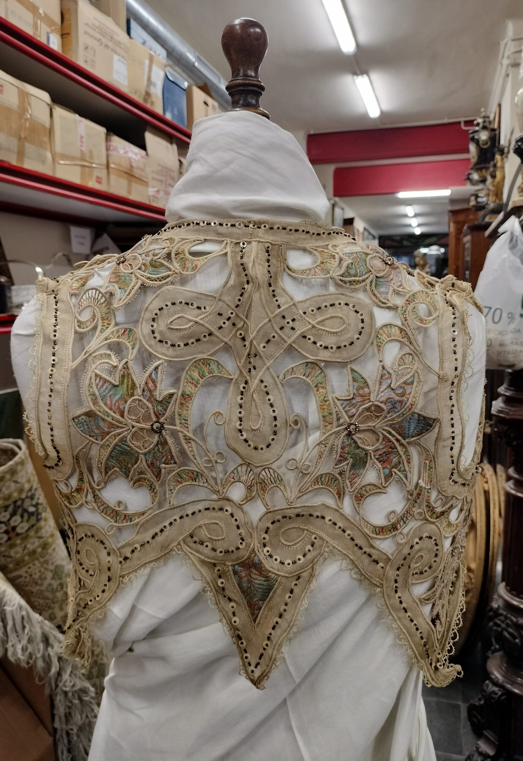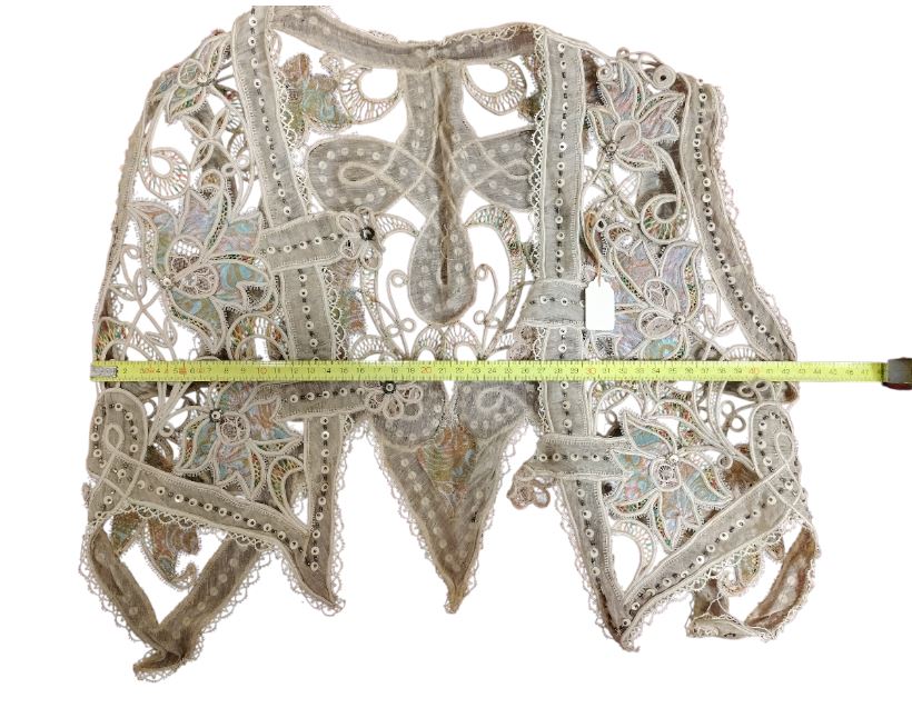 VER IMÁGENES PARA COMPROBAR EL ESTADO REAL. LAS IMÁGENES FORMAN PARTE DE LA DESCRIPCIÓN. CHAQUETA O ARMILLA EN ENCAJE, SEDA Y GASA. CON PEQUEÑA PEDRERÍA. COLORES BIEN CONSERVADOS, BORDES LIGERAMENTE DESILACHADOS. TEJIDO VIEJO, LIGERAMENTE AMARILLO. SE RECOMIENDA LIMPIEZA. EL LOTE INCLUYE DOS ABALORIOS. UNO, EL MÁS LARGO, PRESENTA IMPORTANTES DESGASTES: MANCHAS, DESILACHADOS Y ROTURAS. SE TRATA DE PIEZAS ORNAMENTALES O DECORATIVAS, SEGURAMENTE PARA CUELLO.