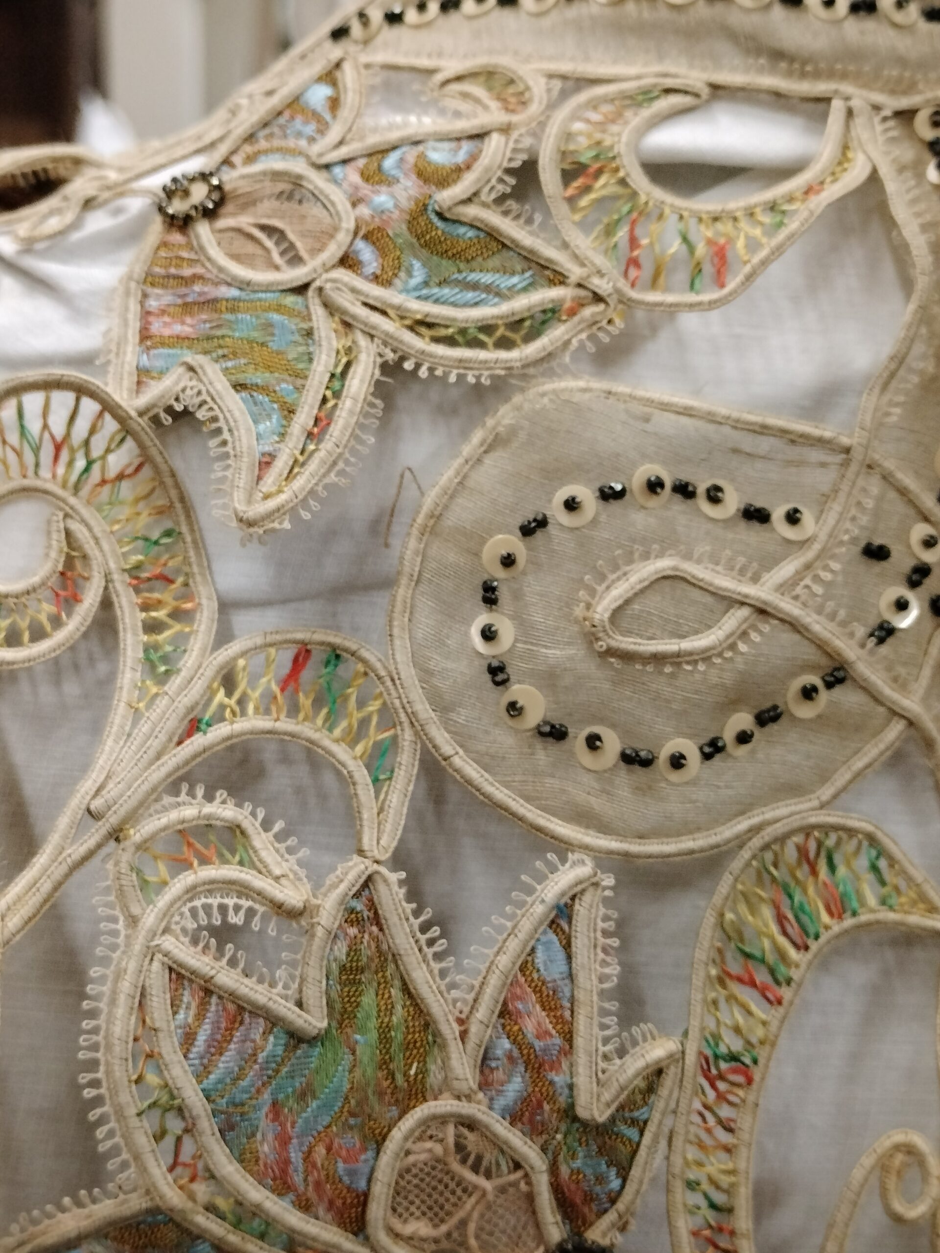 CHAQUETA O ARMILLA Y ABALORIOS. SEDA, GASA Y ENCAJE. ESPAÑA. SIGLO XIX.