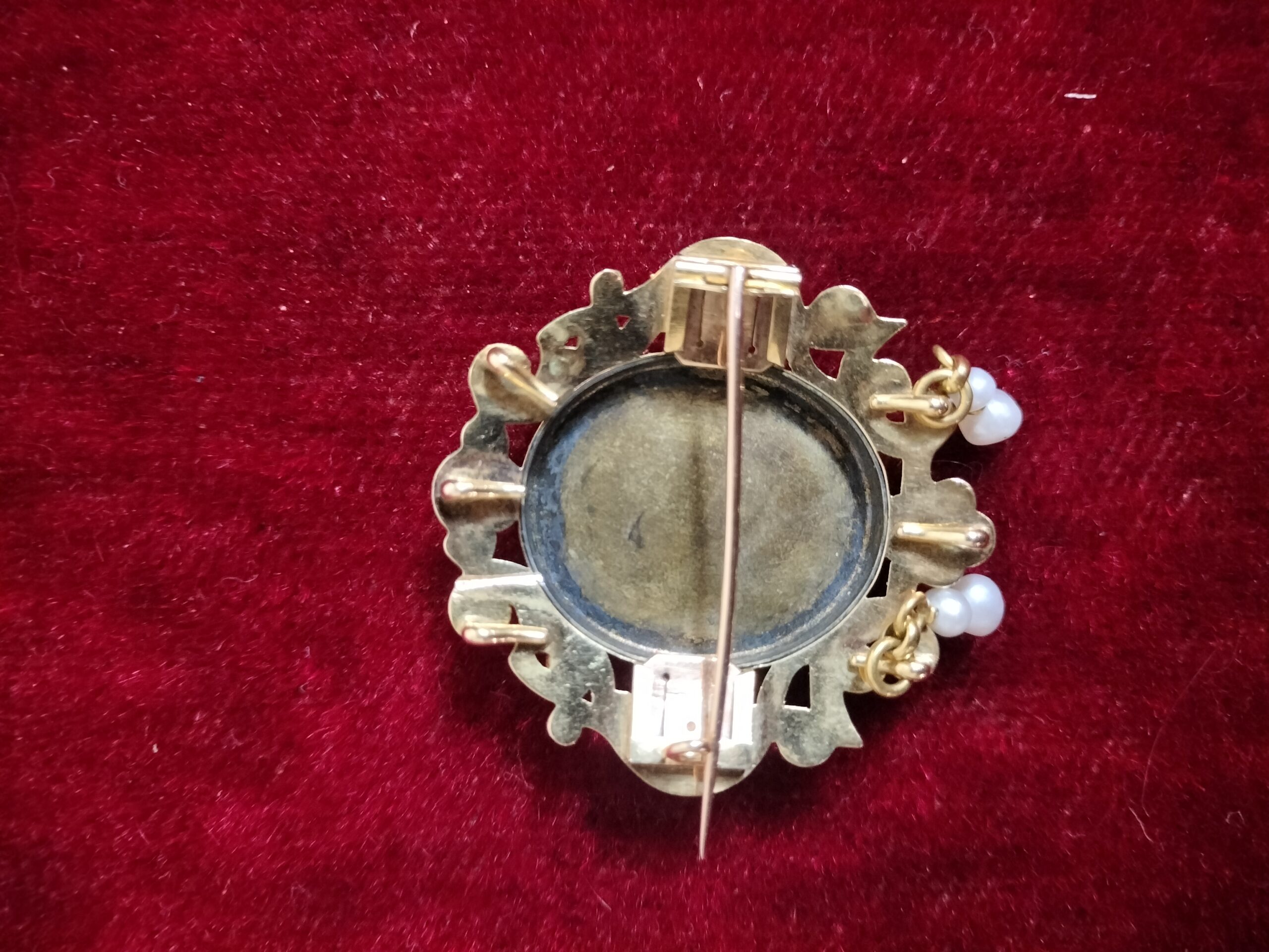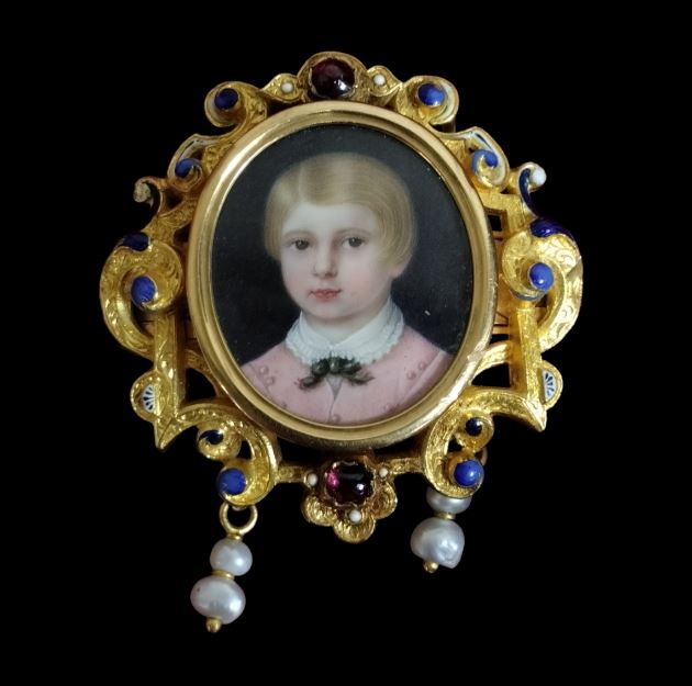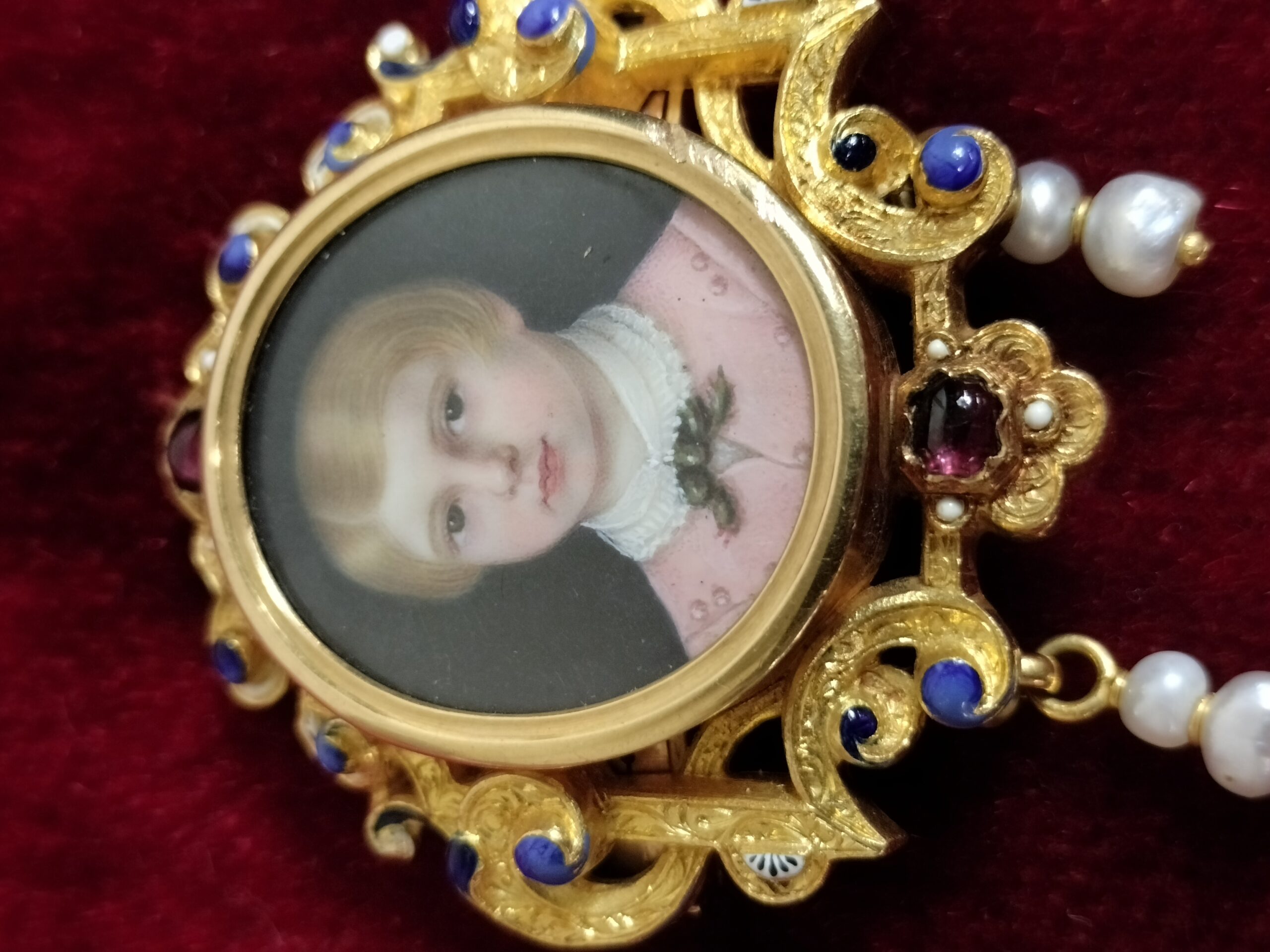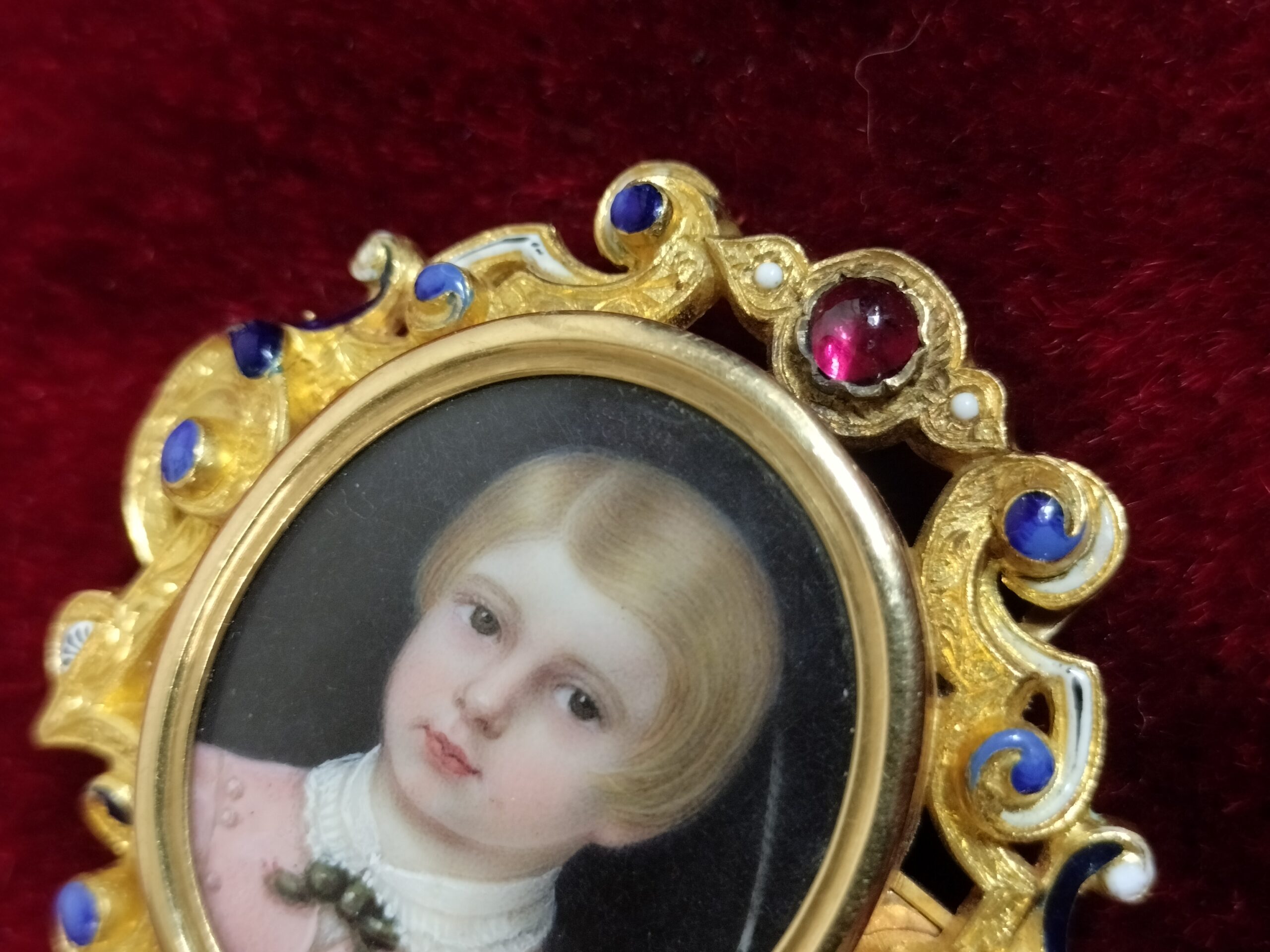 VER IMÁGENES PARA COMPROBAR EL ESTADO REAL.  LAS IMÁGENES FORMAN PARTE DE LA DESCRIPCIÓN.  BROCHE O COLGANTE.  ORO 18K Y RUBÍES CABUJÓN.  ESTILO HISTORICISTA, NEORENACENTISTA.  ORNAMENTADO CON EL RETRATO EN MINIATURA DE UN NIÑO, EN ESMALTE.  27,06 GRAMOS.  BUEN ESTADO GENERAL, ALGUNAS EROSIONES EN LA PARTE POSTERIOR.
