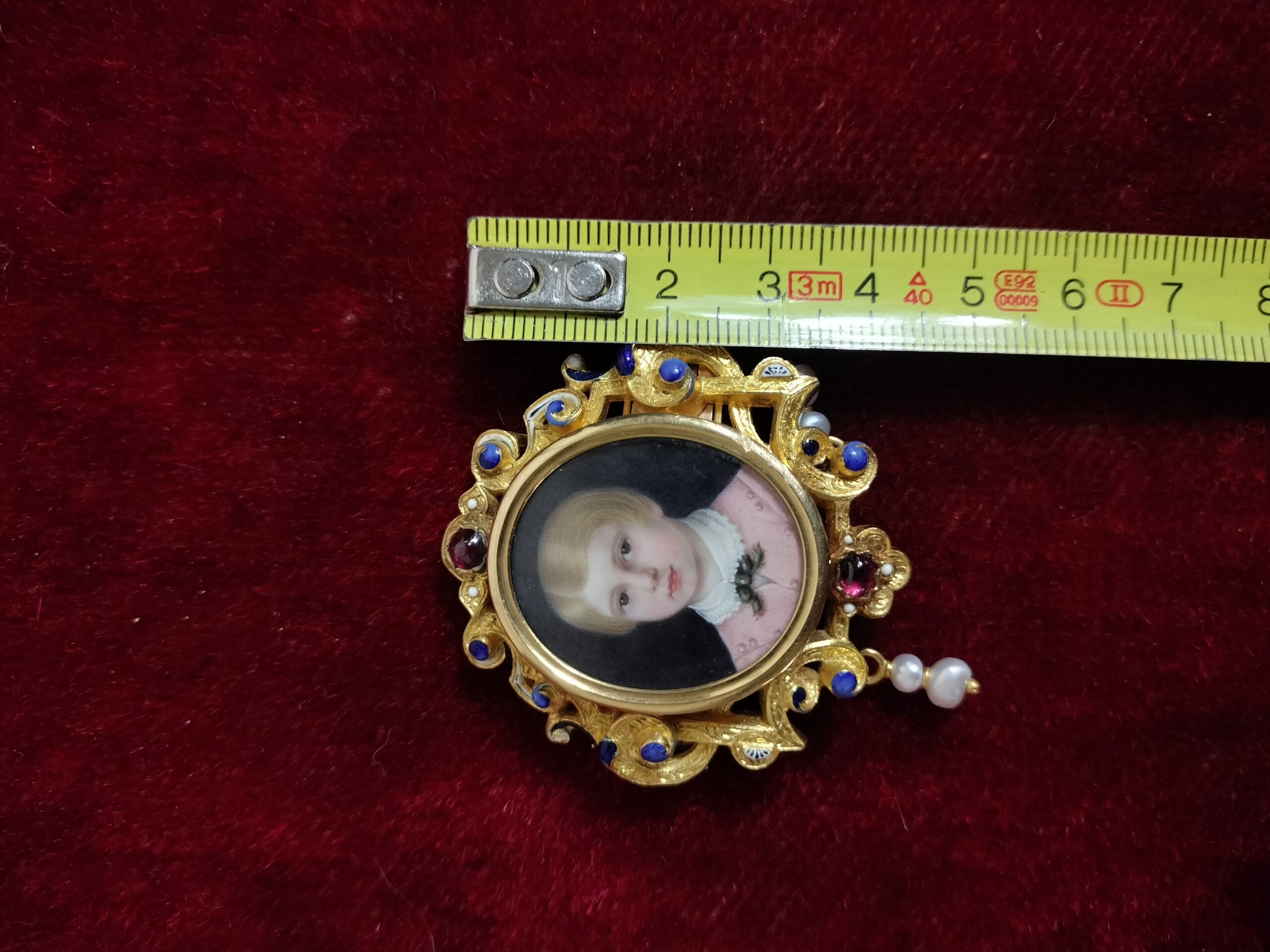 BROCHE O COLGANTE NEORENACENTISTA. RETRATO EN ESMALTE, ORO Y RUBÍES. NORTE DE EUROPA. XIX.