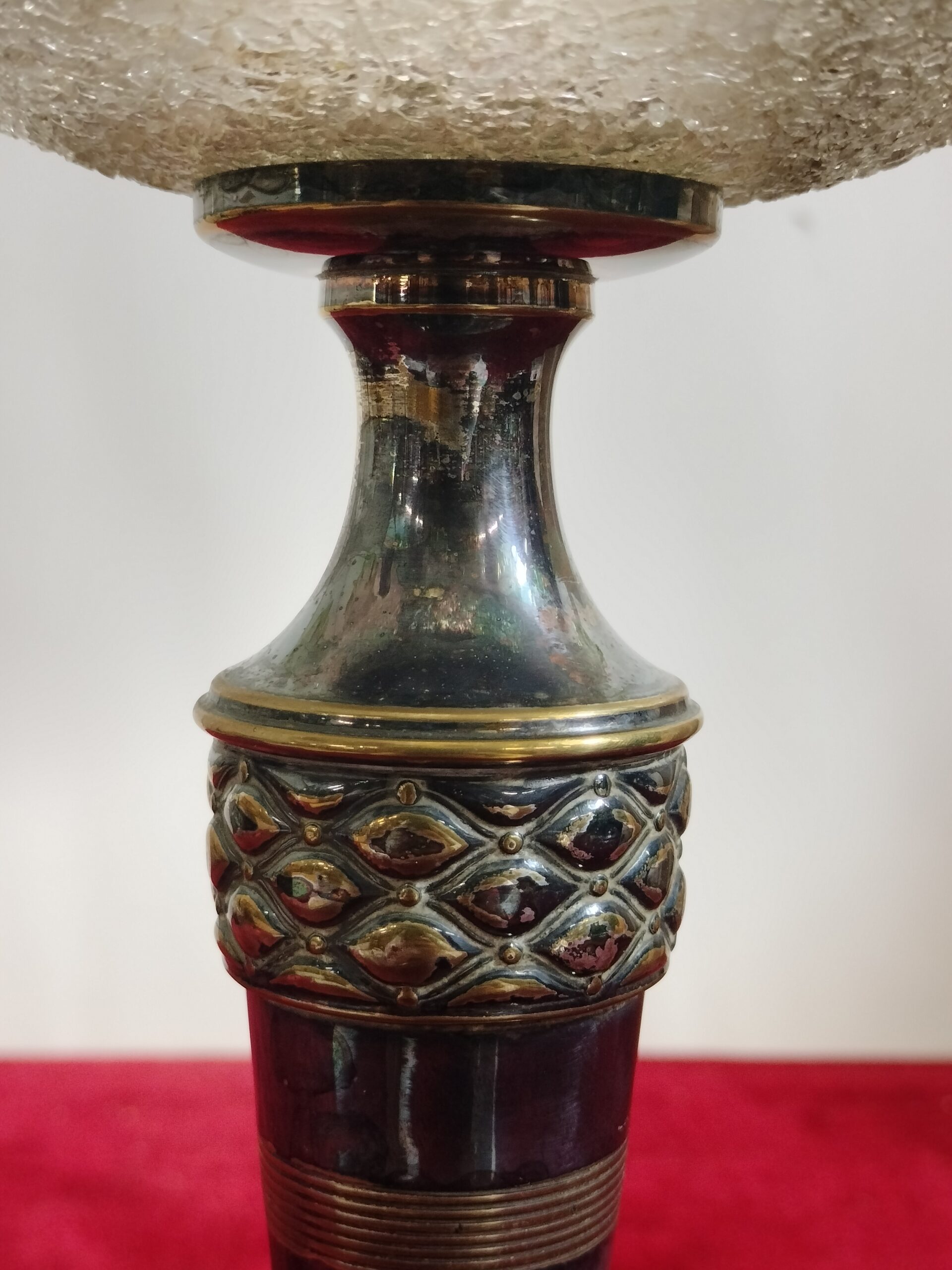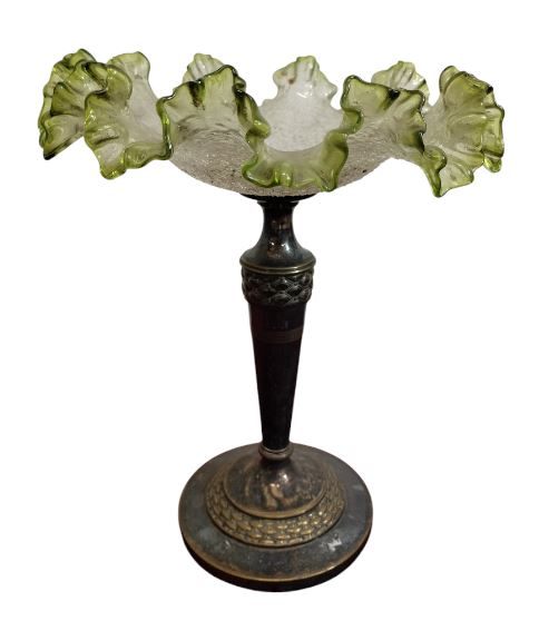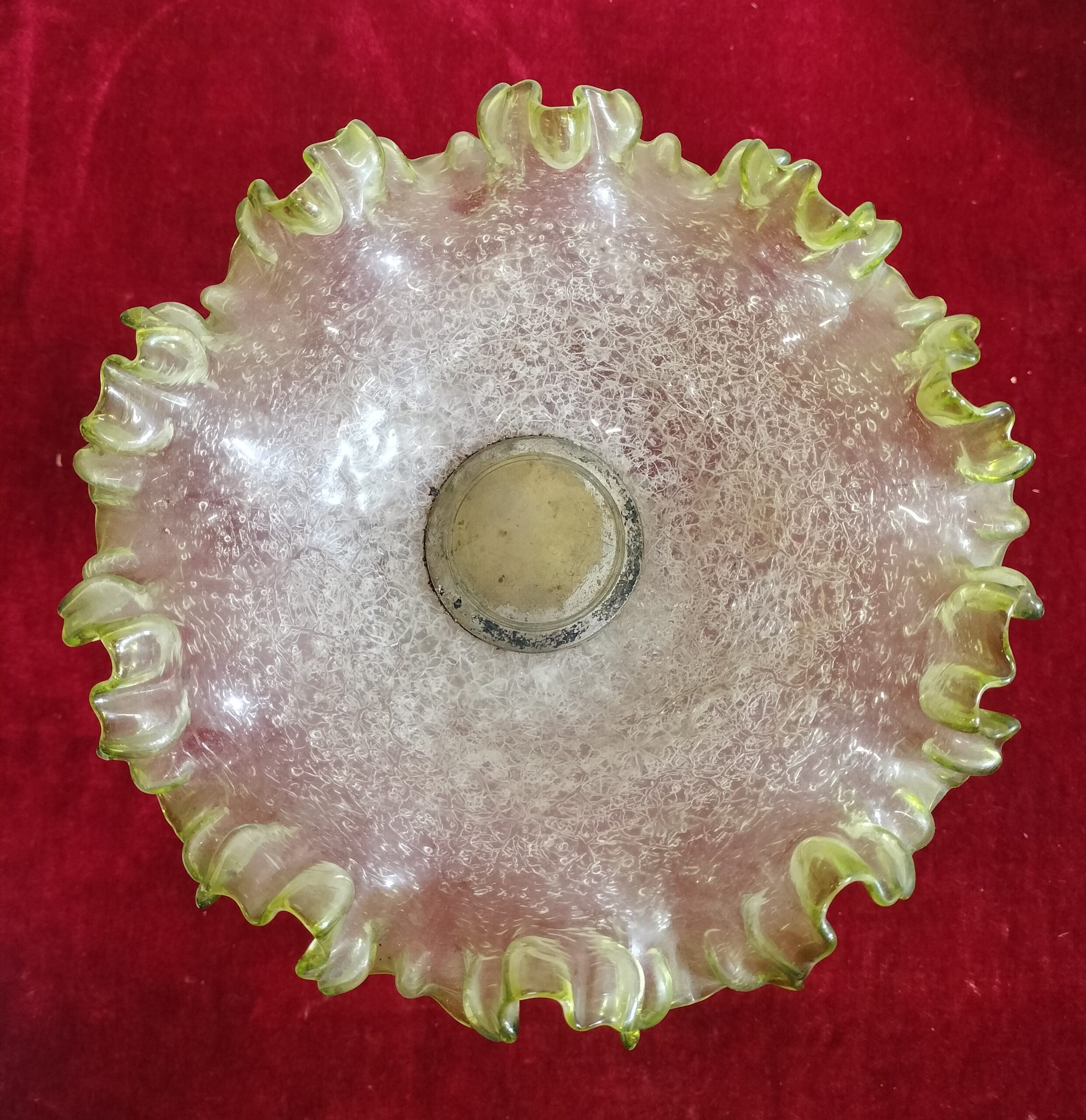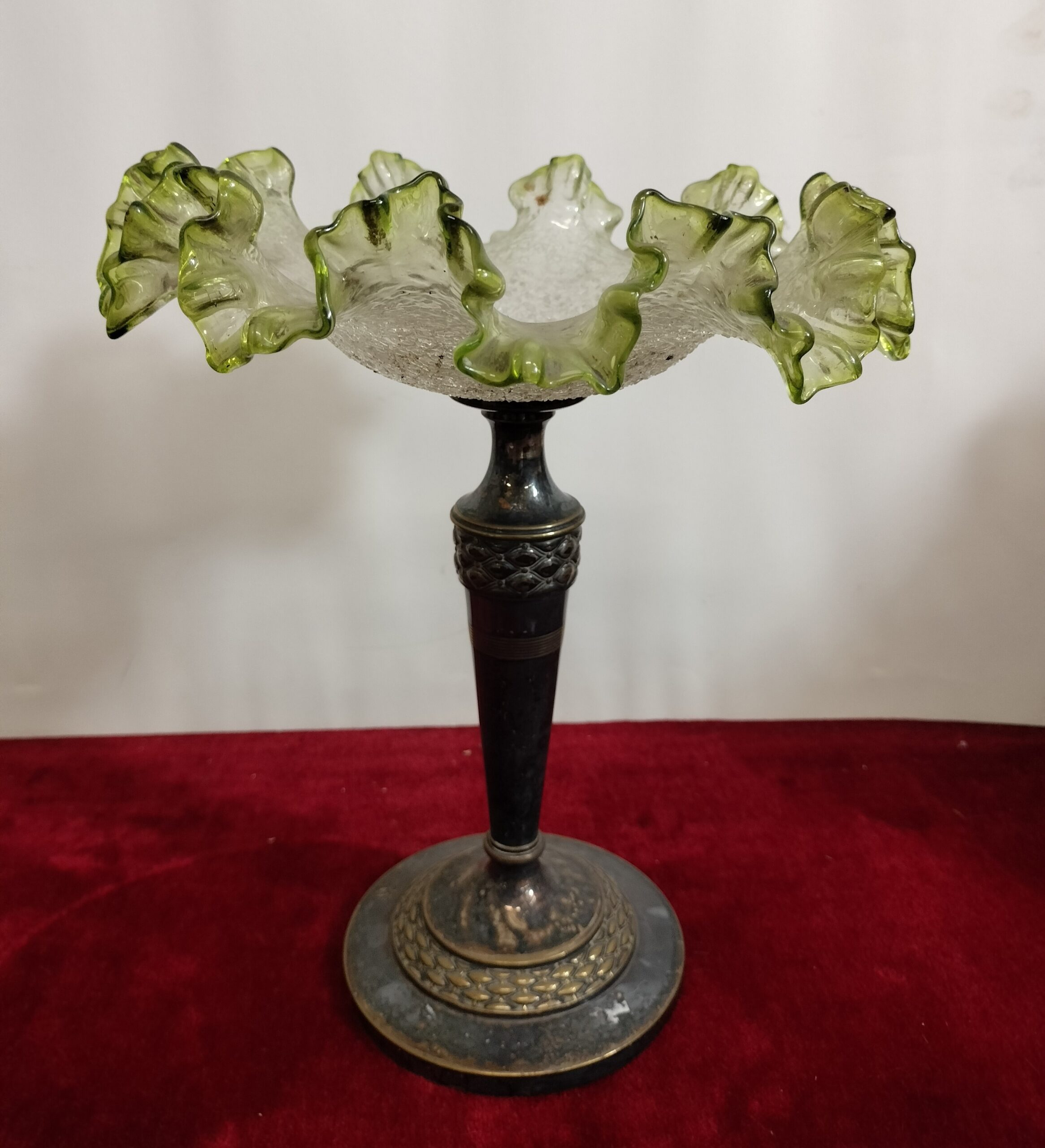 VER IMÁGENES PARA COMPROBAR EL ESTADO REAL. LAS IMÁGENES FORMAN PARTE DE LA DESCRIPCIÓN. CENTRO DE MESA DE ESTILO ART NOUVEAU. BASE Y FUSTE EN METAL PLATEADO, CON DESGASTES Y RASGUÑOS DEBIDO AL USO. PARTE SUPERIOR DE CRISTAL, BORDES ONDULADOS O RIZADOS. CRISTAL CON CRAQUELLE. MEDIDAS APROX: BOCA: 25 X 25 BASE: 13 X 13