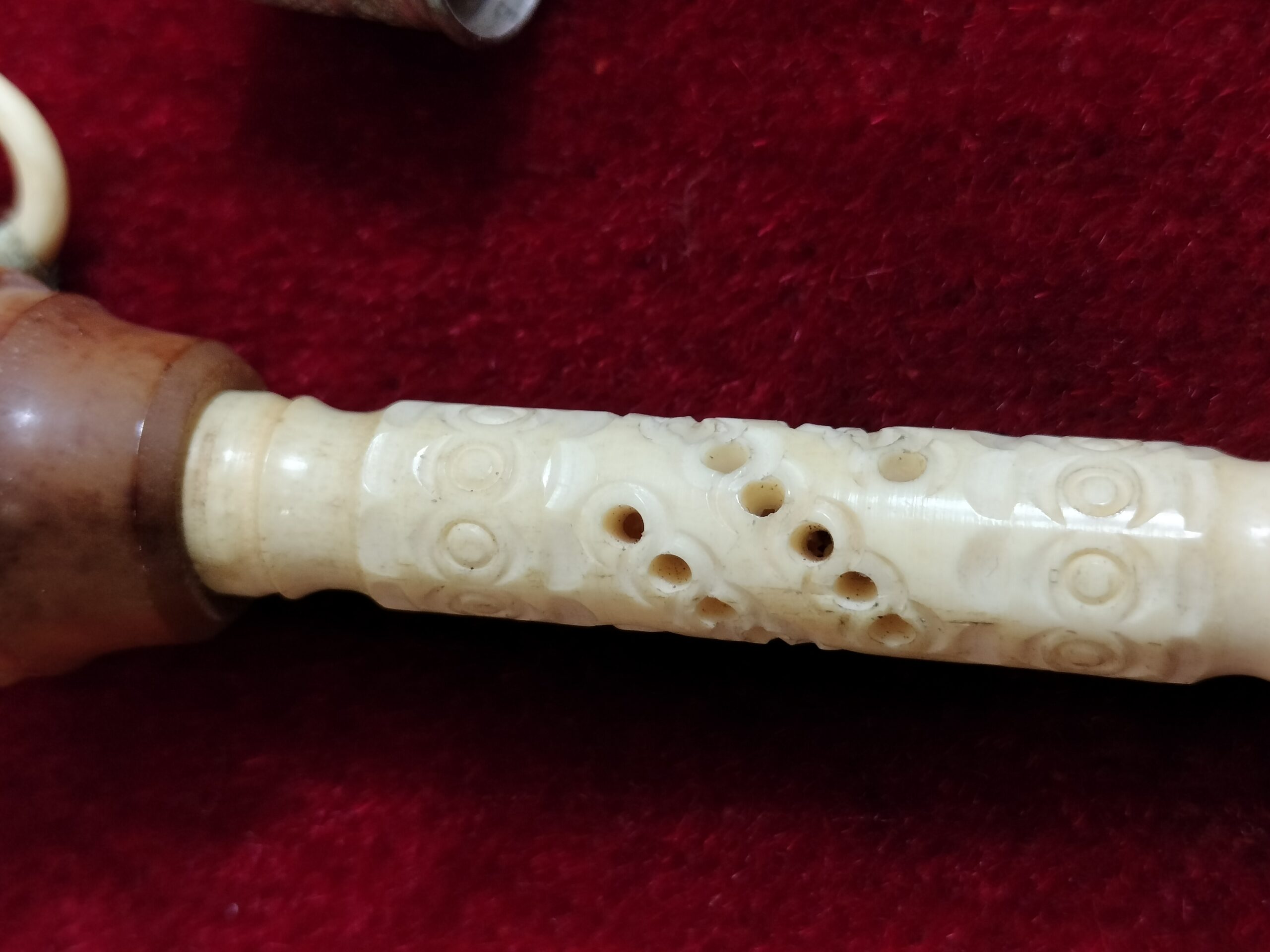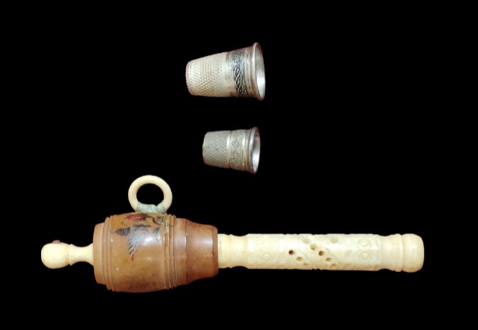 ANTIGUA CINTA MÉTRICA DE MADERA Y DOS DEDALES DE PLATA. ESPAÑA. SIGLOS XIX-XX