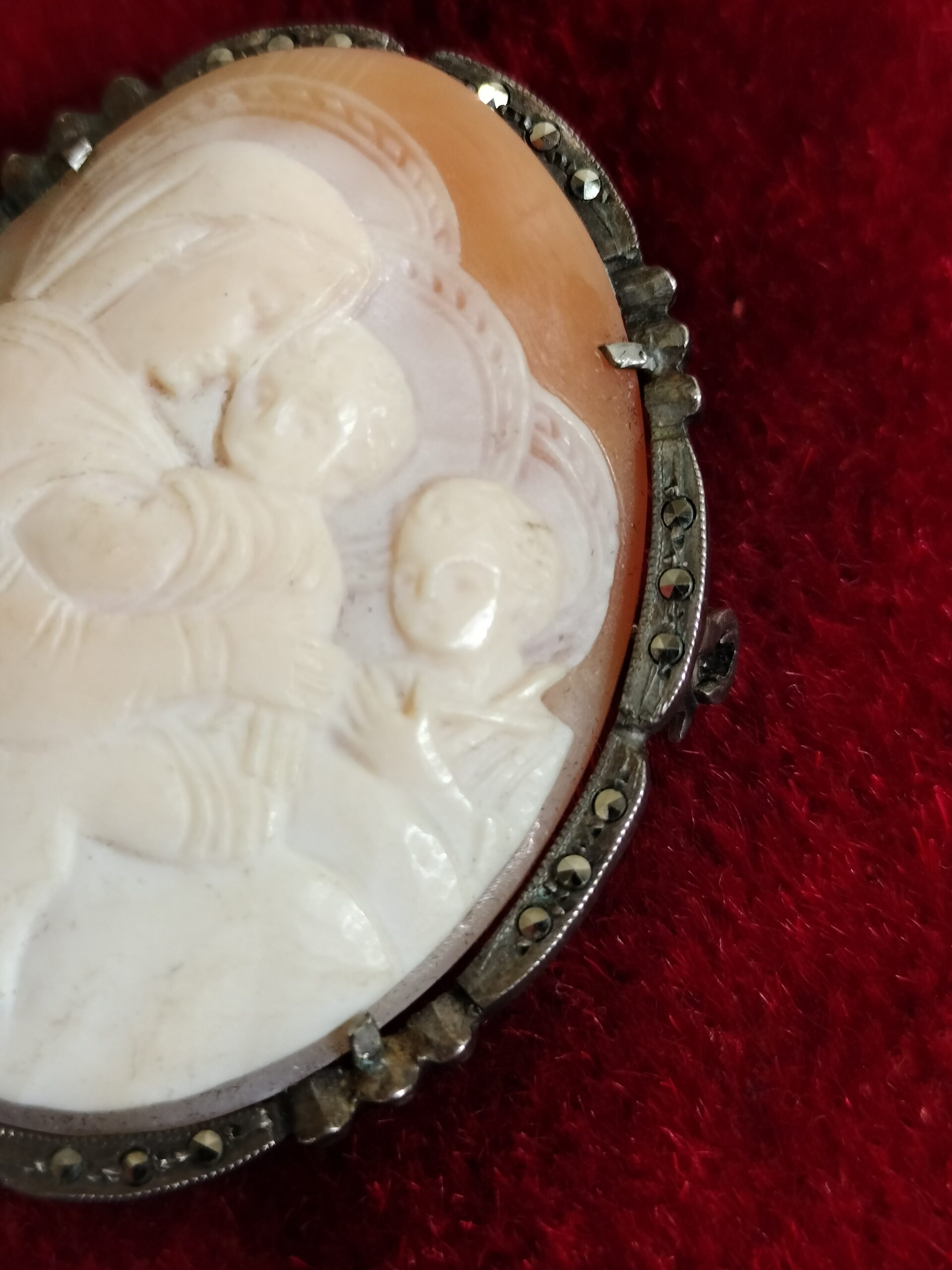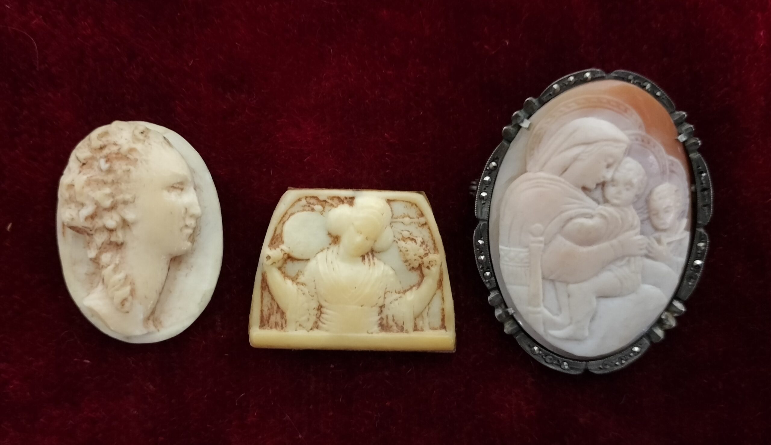 VER IMÁGENES PARA COMPROBAR EL ESTADO REAL.  LAS IMÁGENES FORMAN PARTE DE LA DESCRIPCIÓN.  CONJUNTO DE TRES PIEZAS.  EL LOTE INCLUYE:  – UN CAMAFEO DE NÁCAR, CON LA FIGURA DE LA VIRGEN Y EL NIÑO. ESTRUCTURA DE PLATA CON MARCASITAS INCRUSTADAS.  4 X 3,5 CM.  – UN PEQUEÑO RETRATO FEMENINO EN HUESO TALLADO. SIN ESTRUCTURA Y SIN FIRMA. PEQUEÑAS EROSIONES.  3 X 2,7 CM.  – UNA PEQUEÑA MEDALLA O FRAGMENTO CON BUSTO DE MUJER (FIGURA ORIENTAL) EN HUESO TALLADO.  PEQUEÑAS EROSIONES. MARCA EN LA PARTE POSTERIOR Y FECHA: 8-9-22.