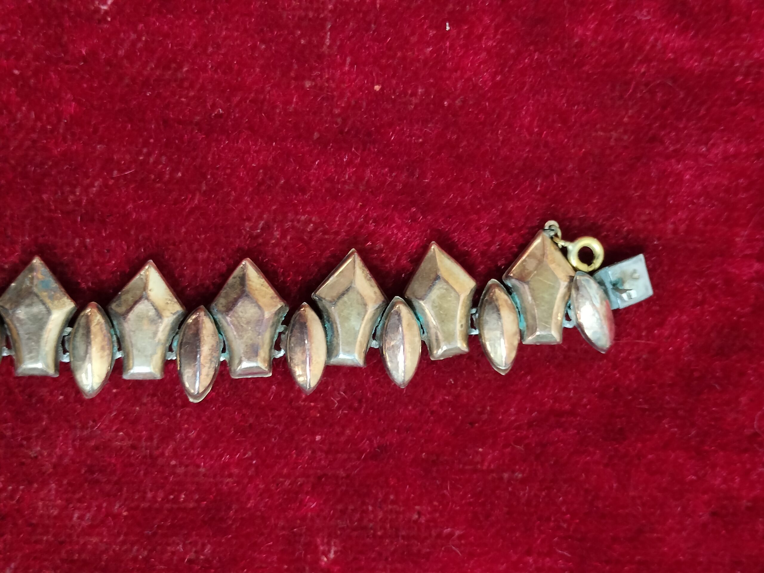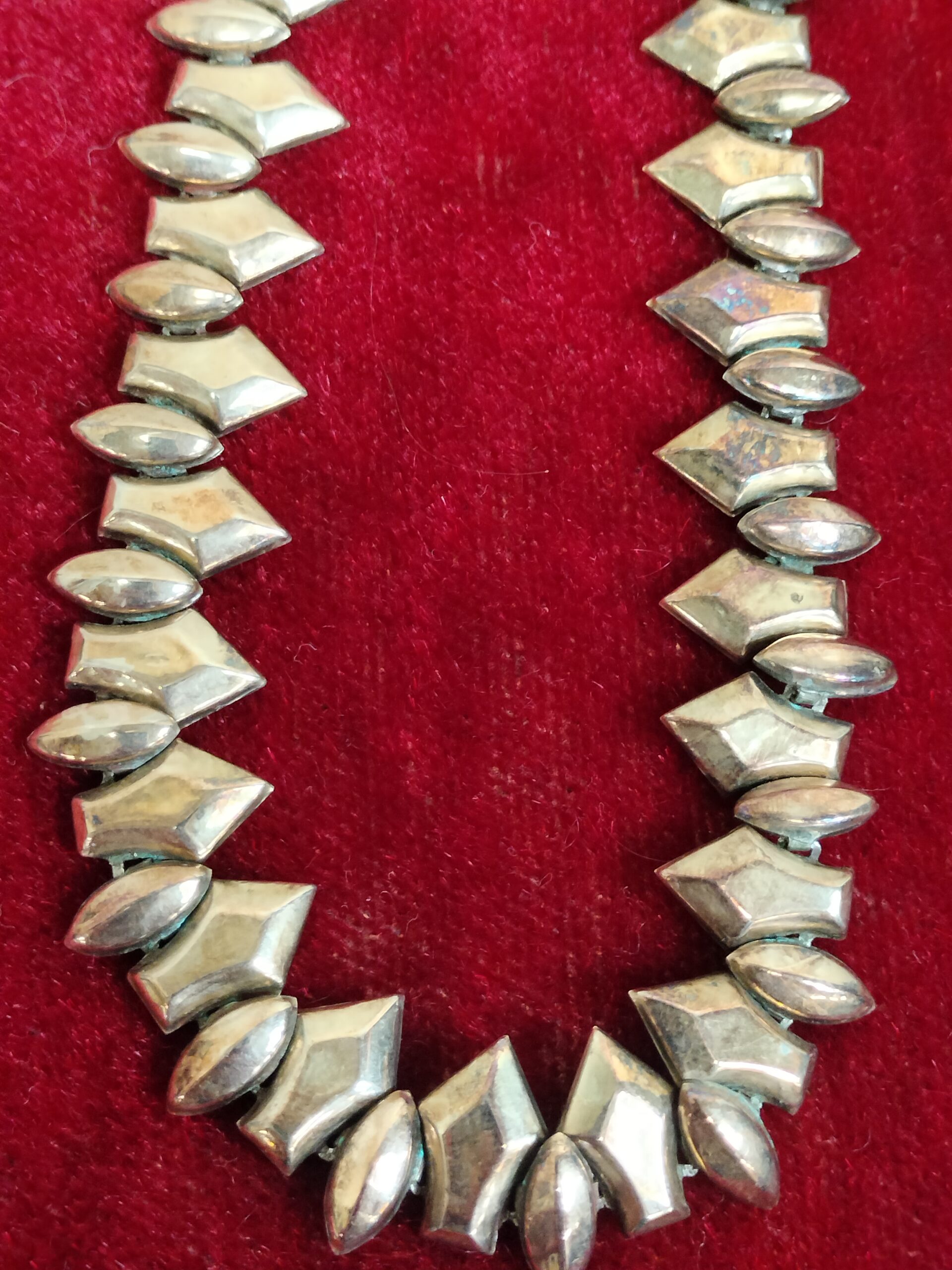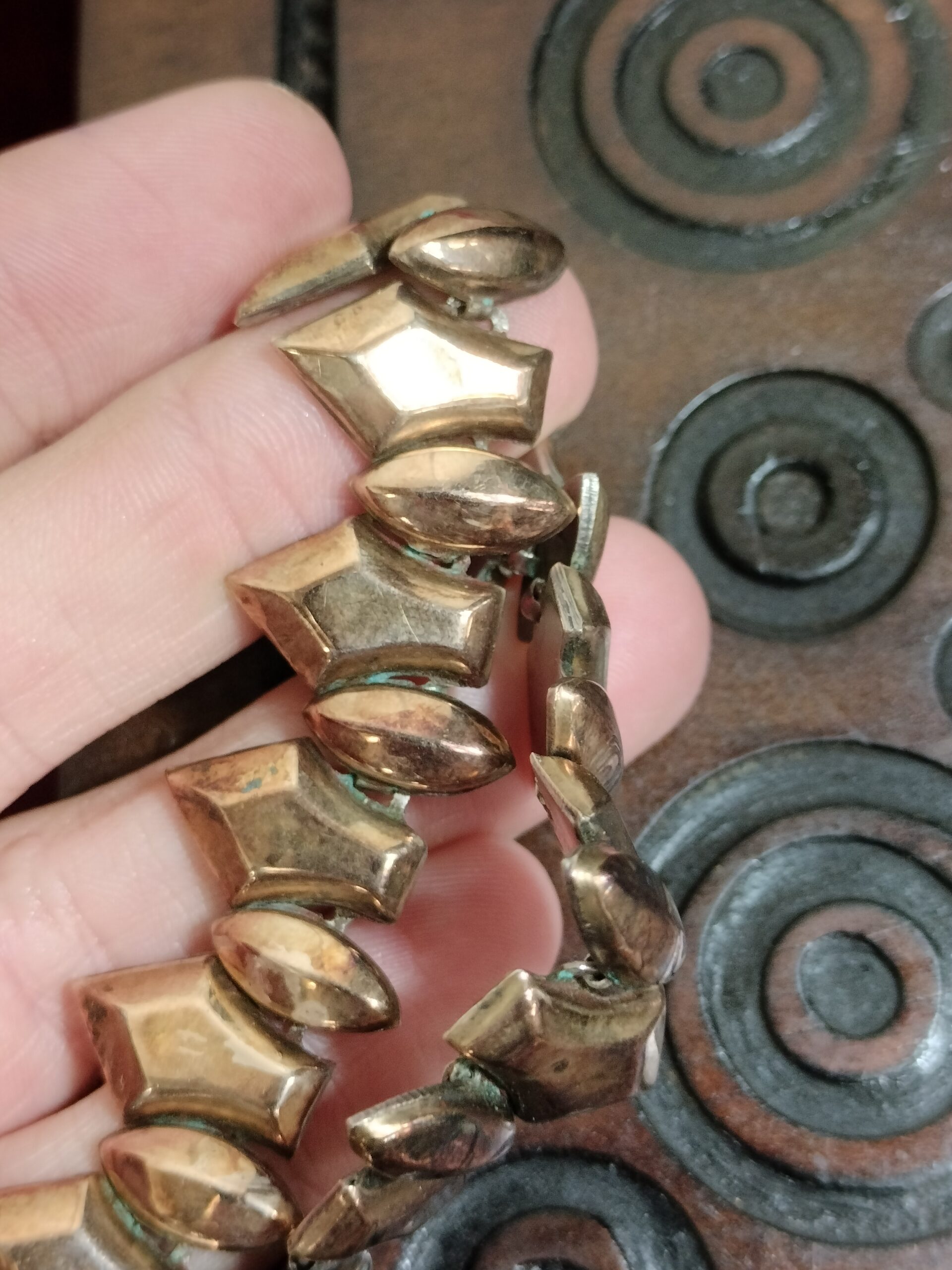 VER IMÁGENES PARA COMPROBAR EL ESTADO REAL. LAS IMÁGENES FORMAN PARTE DE LA DESCRIPCIÓN. COLLAR DE ESTILO VINTAGE. PLATA Y ACABADO EN ORO, TONO DORADO-COBRIZO. SIN MARCA DE AUTOR. CADENA Y CIERRE DORADO. 42,5 CM DE LARGO. 60 GRAMOS. PRESENTA LIGERAS EROSIONES. RESTOS DE ÓXIDO VERDOSO. PÉRDIDA DE PÁTINA.