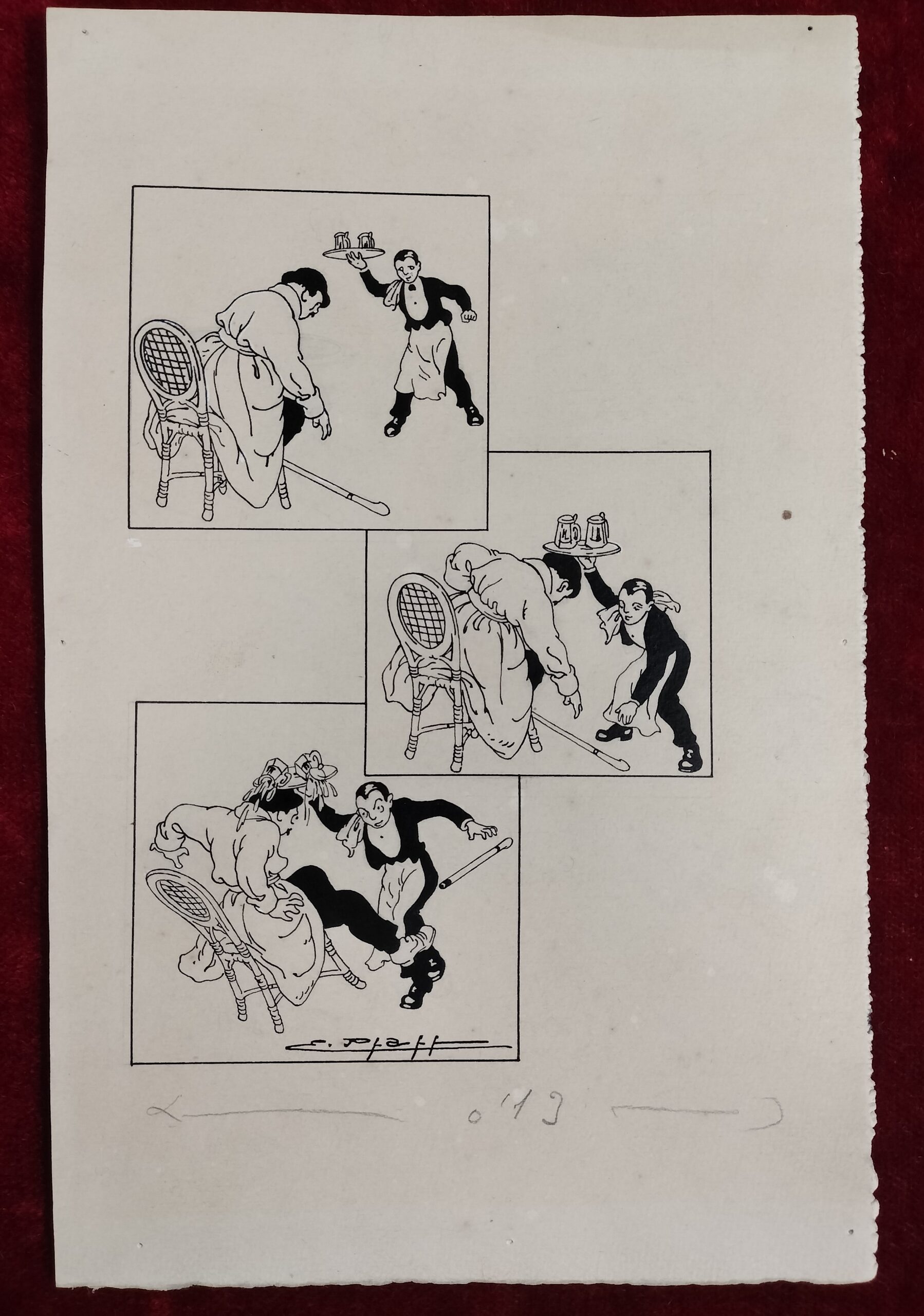 VER IMÁGENES PARA COMPROBAR EL ESTADO REAL. LAS IMÁGENES FORMAN PARTE DE LA DESCRIPCIÓN. TRES VIÑETAS PARA ILUSTRACIÓN. TINTA SOBRE PAPEL. FIRMADO EN LA ESQUINA INFERIOR DERECHA: E. PIAFF. BOCETO EN EL ANVERSO: «UNA DUCHA IMPENSADA», «NO ME MOLESTE SEÑORITO». BUEN ESTADO GENERAL, BORDES CON LIGERAS RASGADURAS.