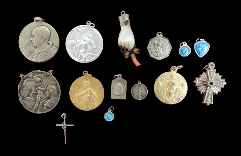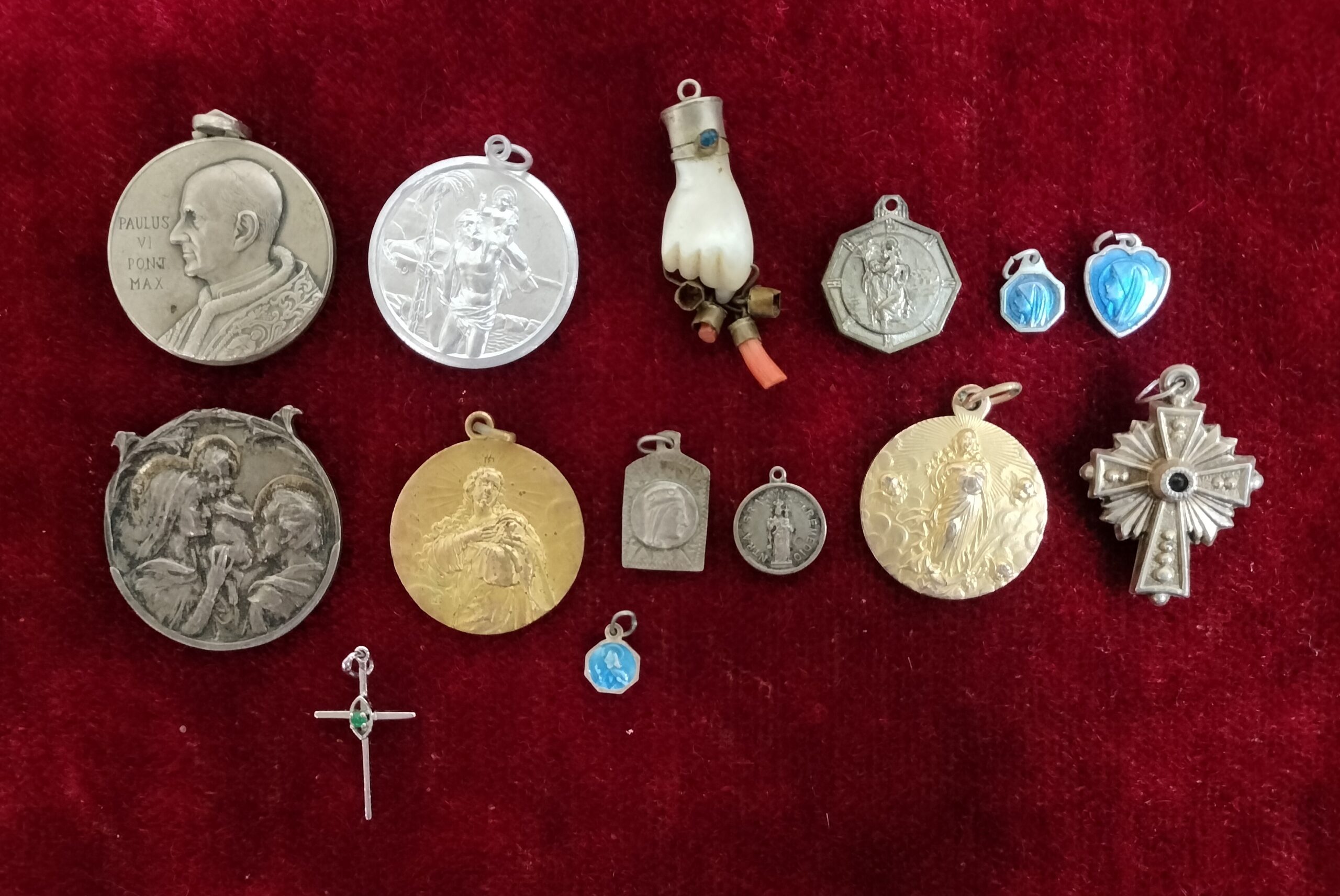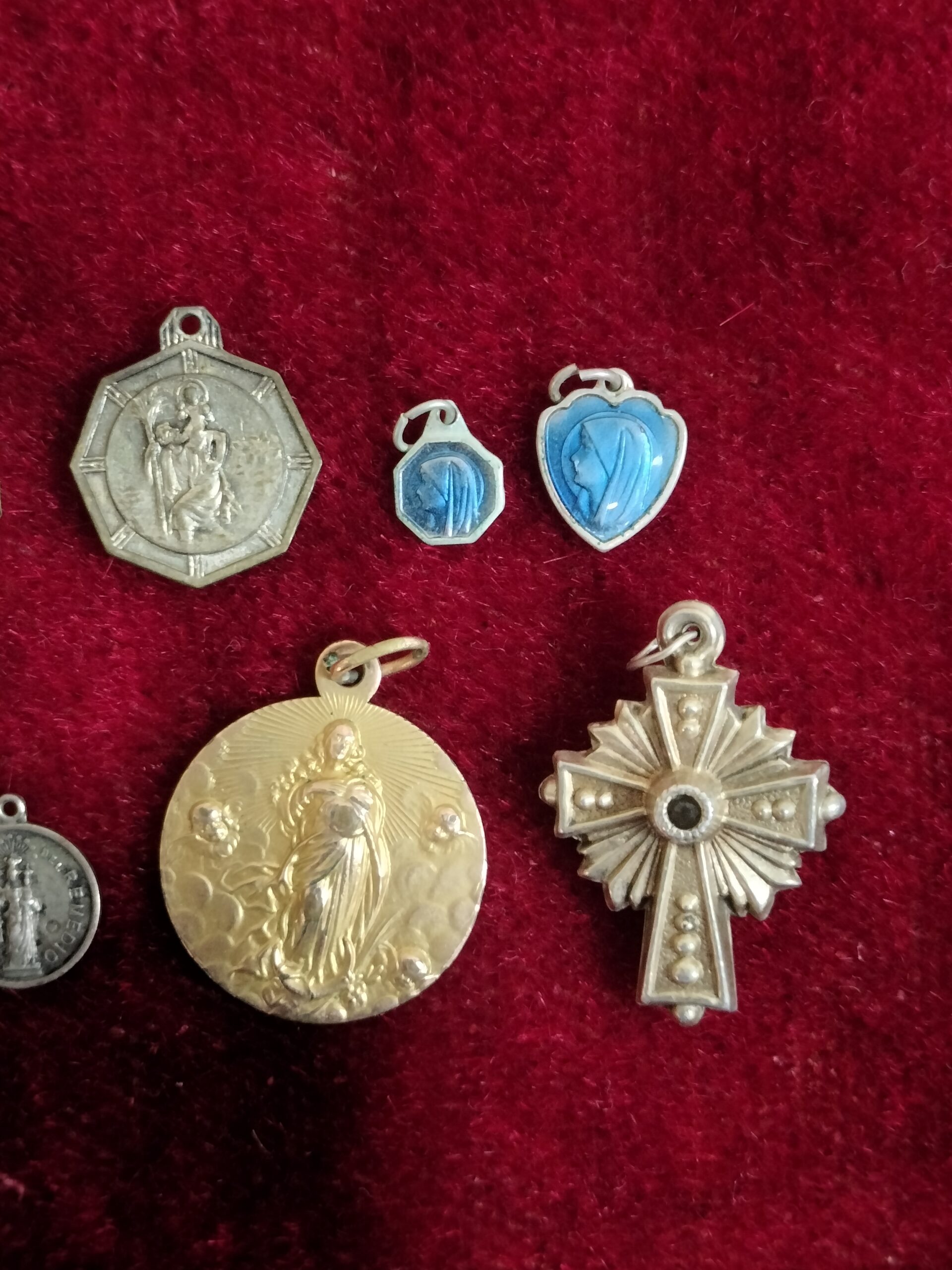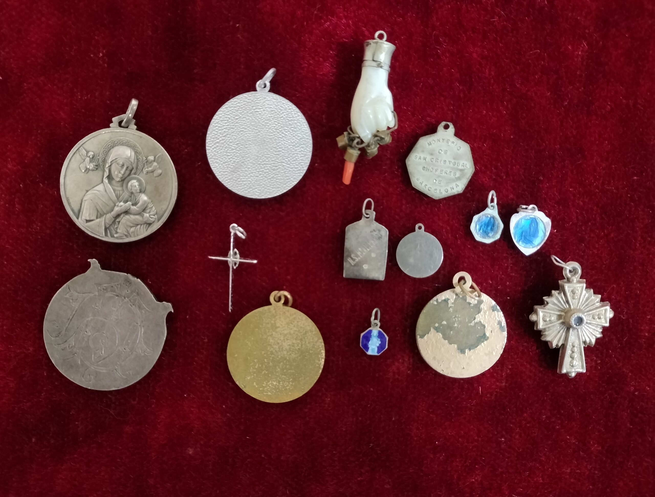 VER IMÁGENES PARA COMPROBAR EL ESTADO REAL. LAS IMÁGENES FORMAN PARTE DE LA DESCRIPCIÓN. LOTE DE ARTÍCULOS DE TEMÁTICA RELIGIOSA. PRINCIPALMENTE MEDALLAS. VARIOS MATERIALES. PRESENTAN LIGERAS EROSIONES, VER IMÁGENES.