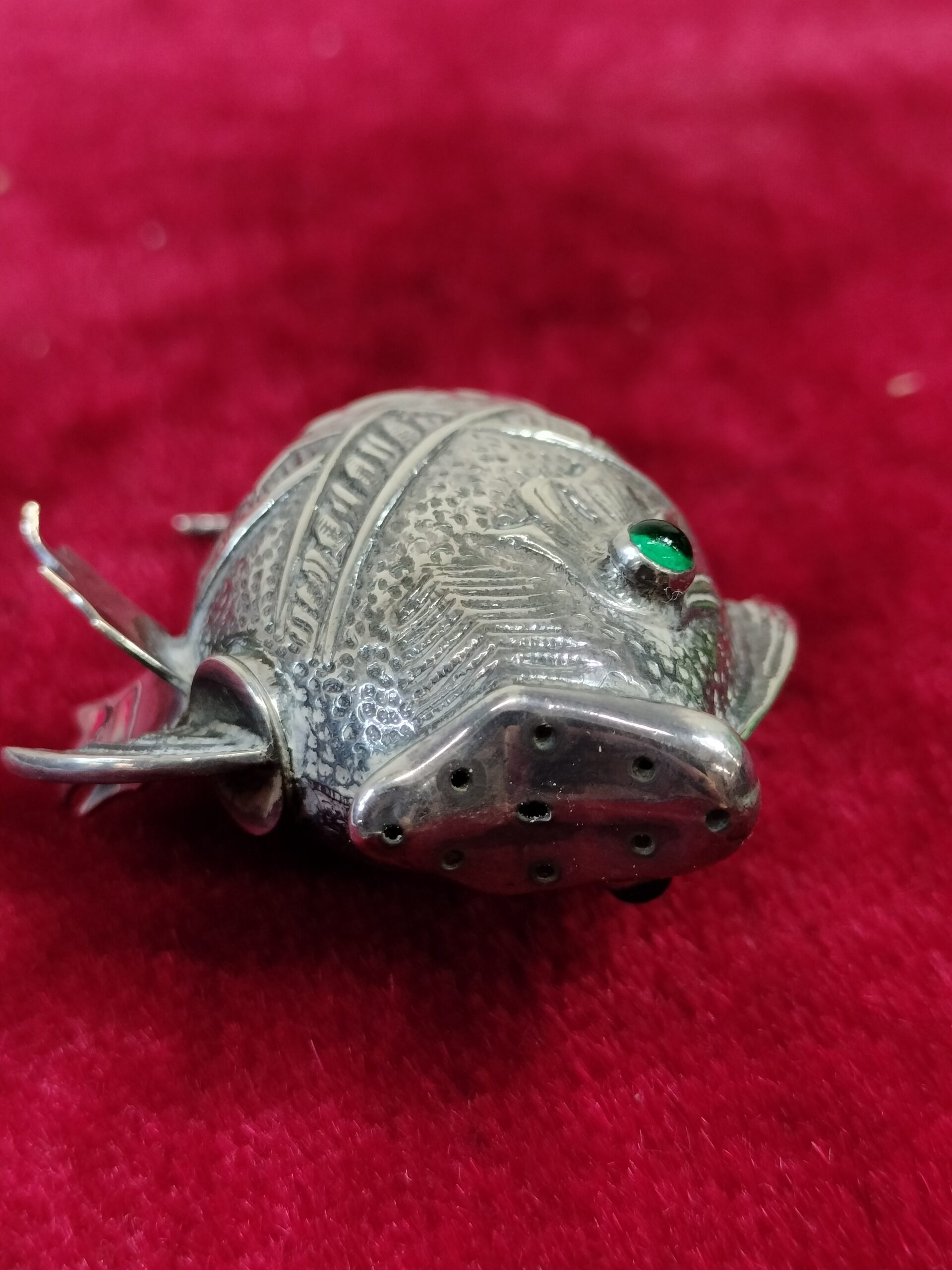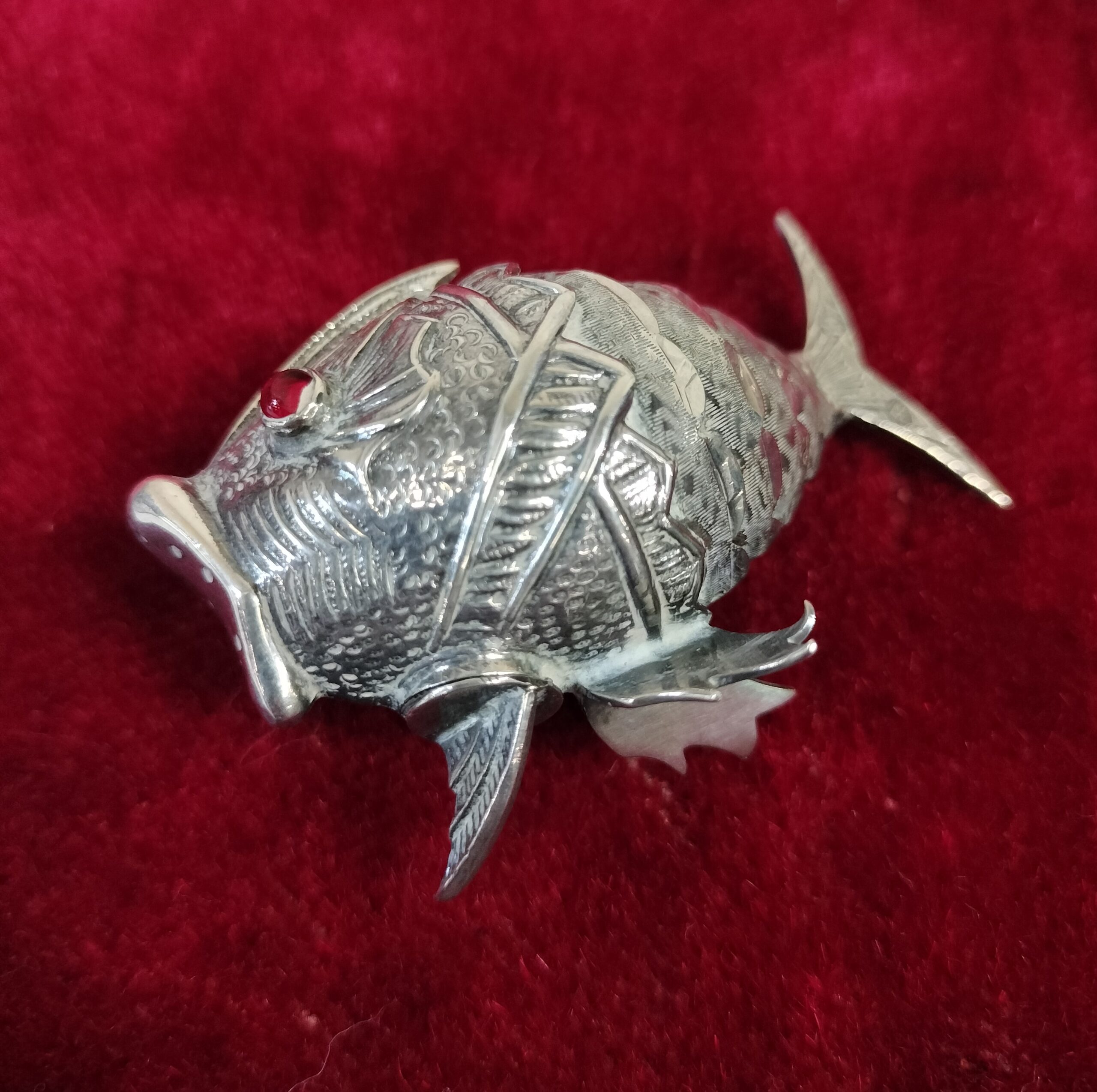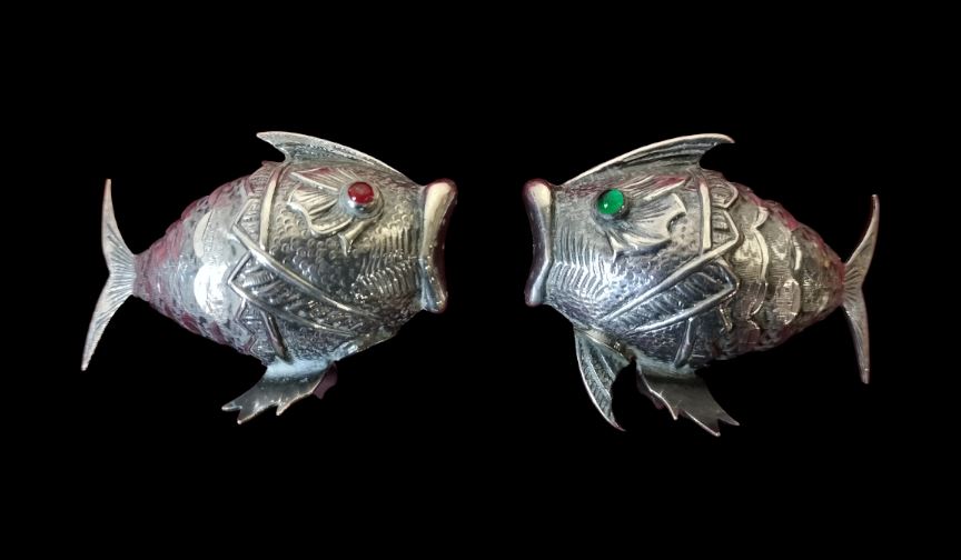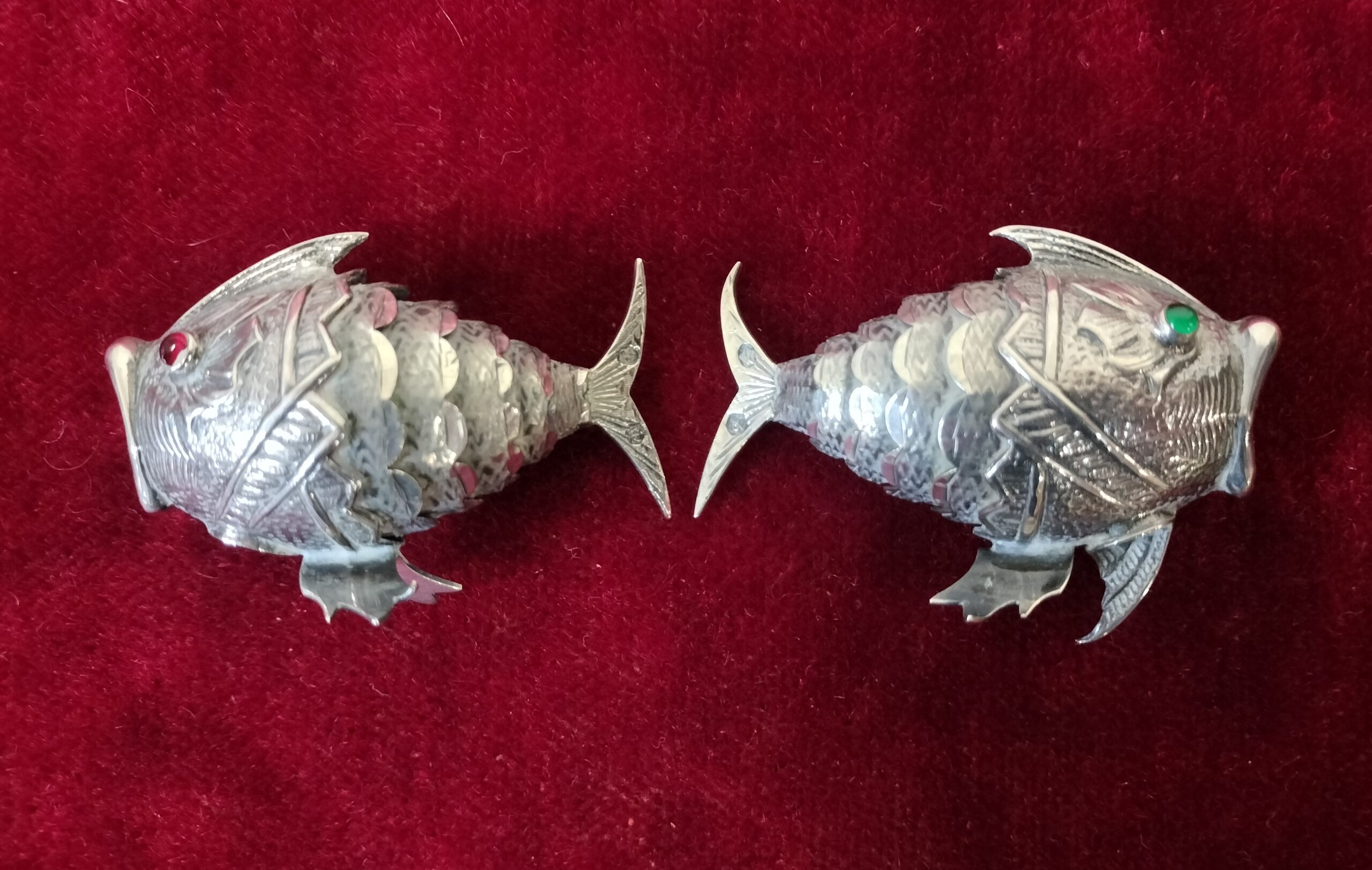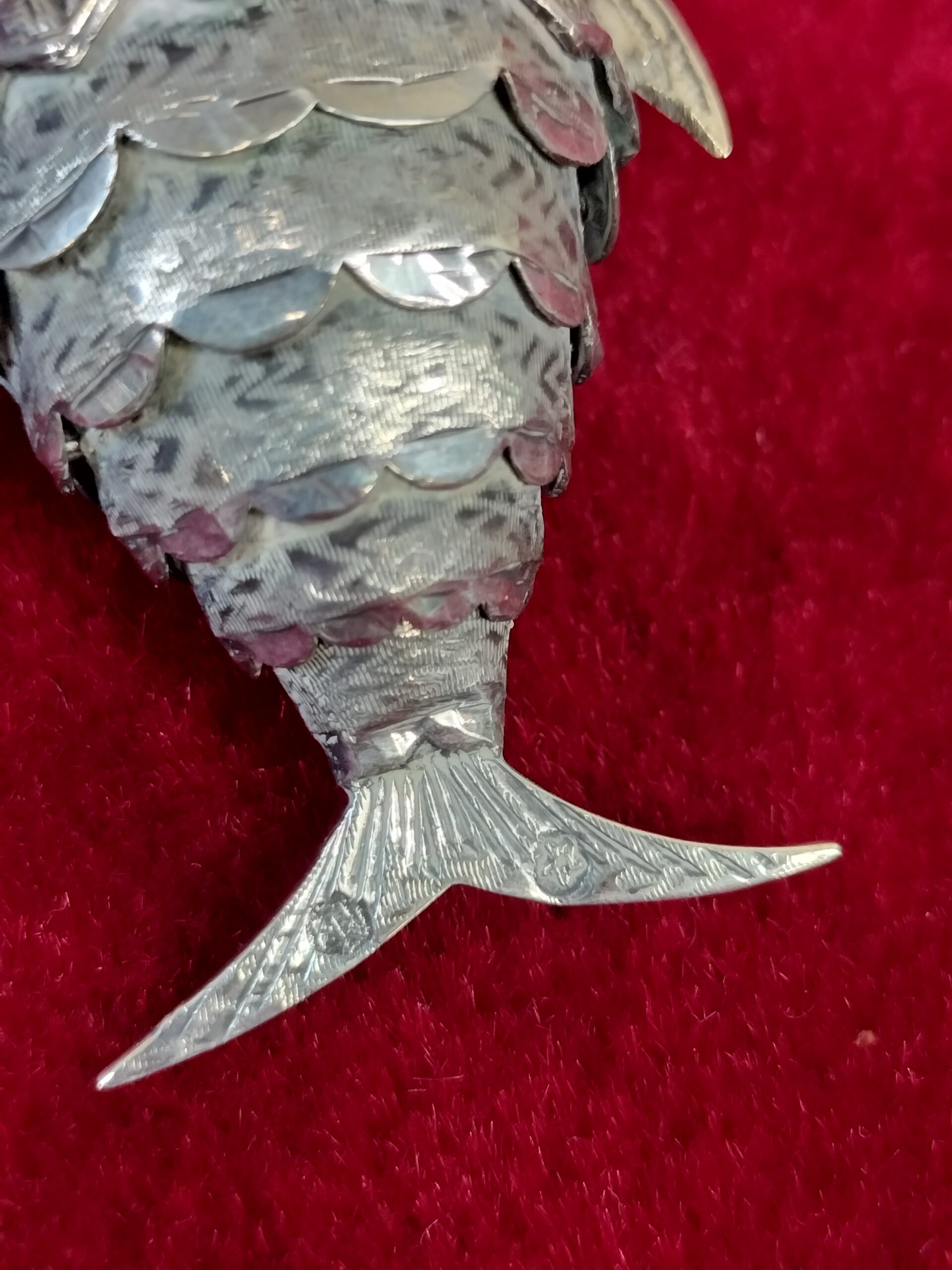 PEQUEÑO SALERO Y PIMENTERO EN FORMA DE PEZ ARTICULADO. PLATA PUNZONADA. EUROPA. XX