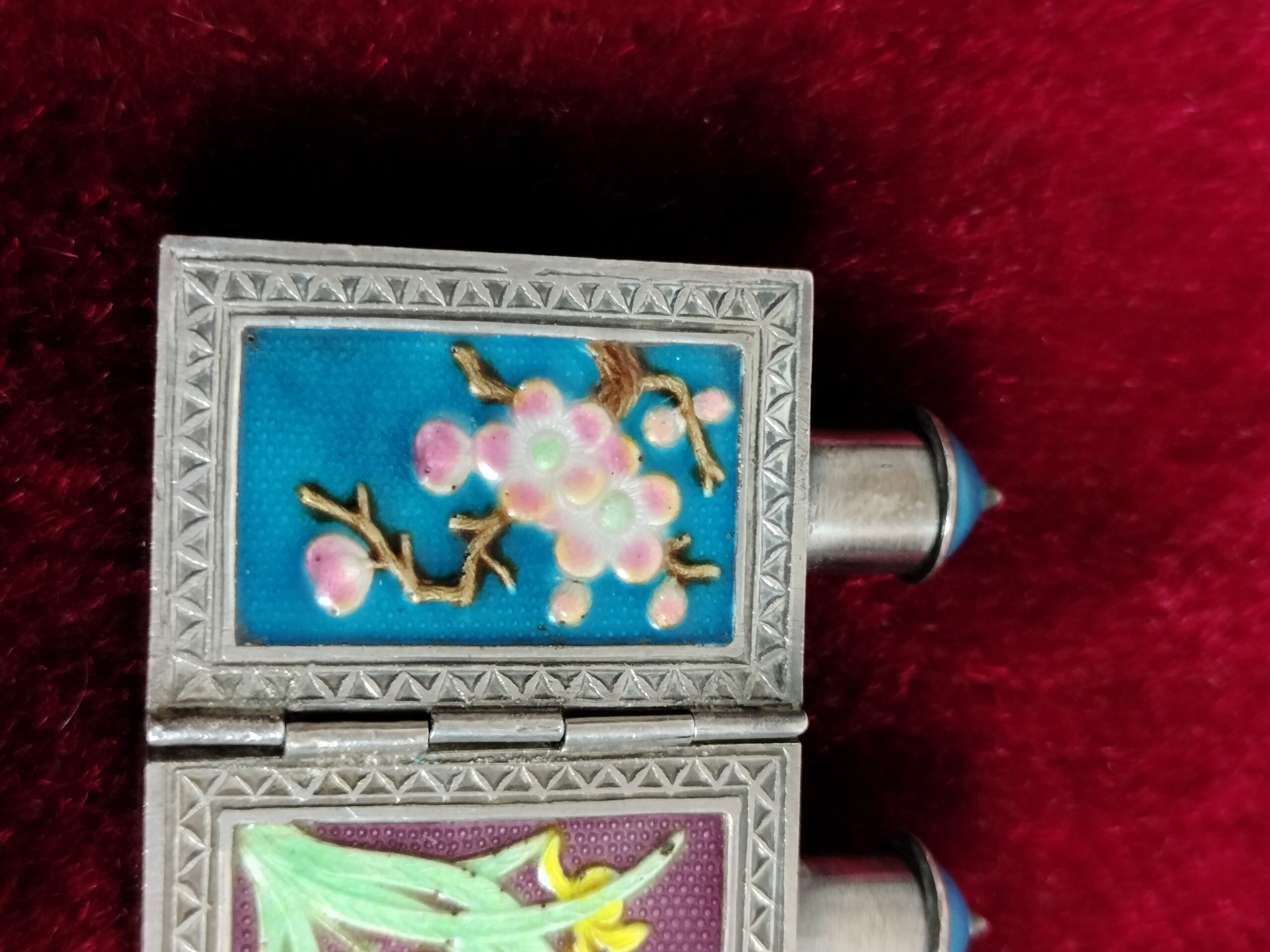 VER IMÁGENES PARA COMPROBAR EL ESTADO REAL. CONJUNTO DE FRASCOS DE RAPÉ. TAPA ENROSCADA. ESMALTADA EN AMBAS CARAS, CON KANJIS Y MOTIVOS VEGETALES. ARTICULADOS Y PLEGABLES. UNO DE ELLOS SE ENCUENTRA DESPRENDIDO. LIGEROS RASGUÑOS Y EROSIONES, VER IMÁGENES.