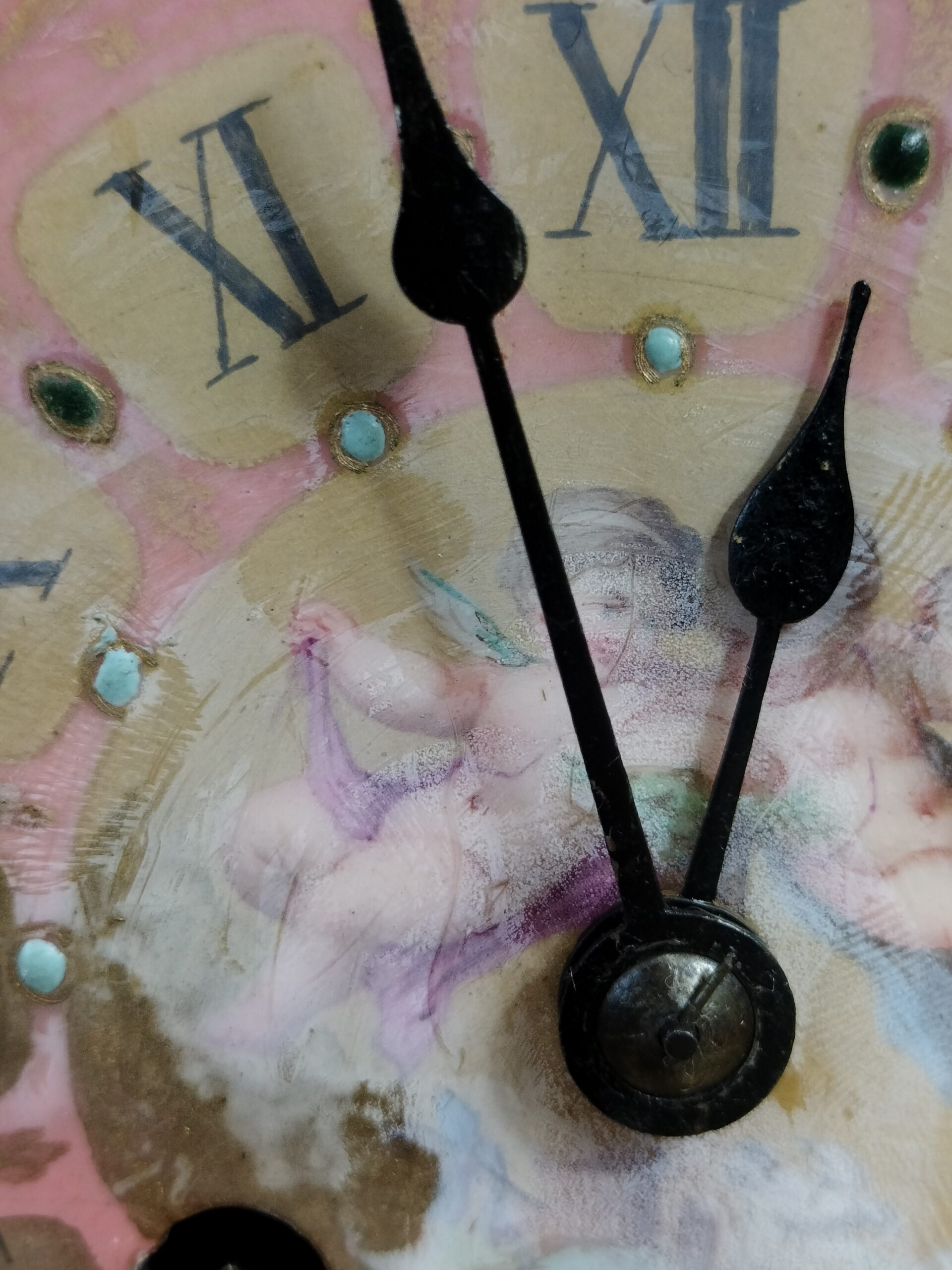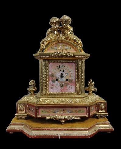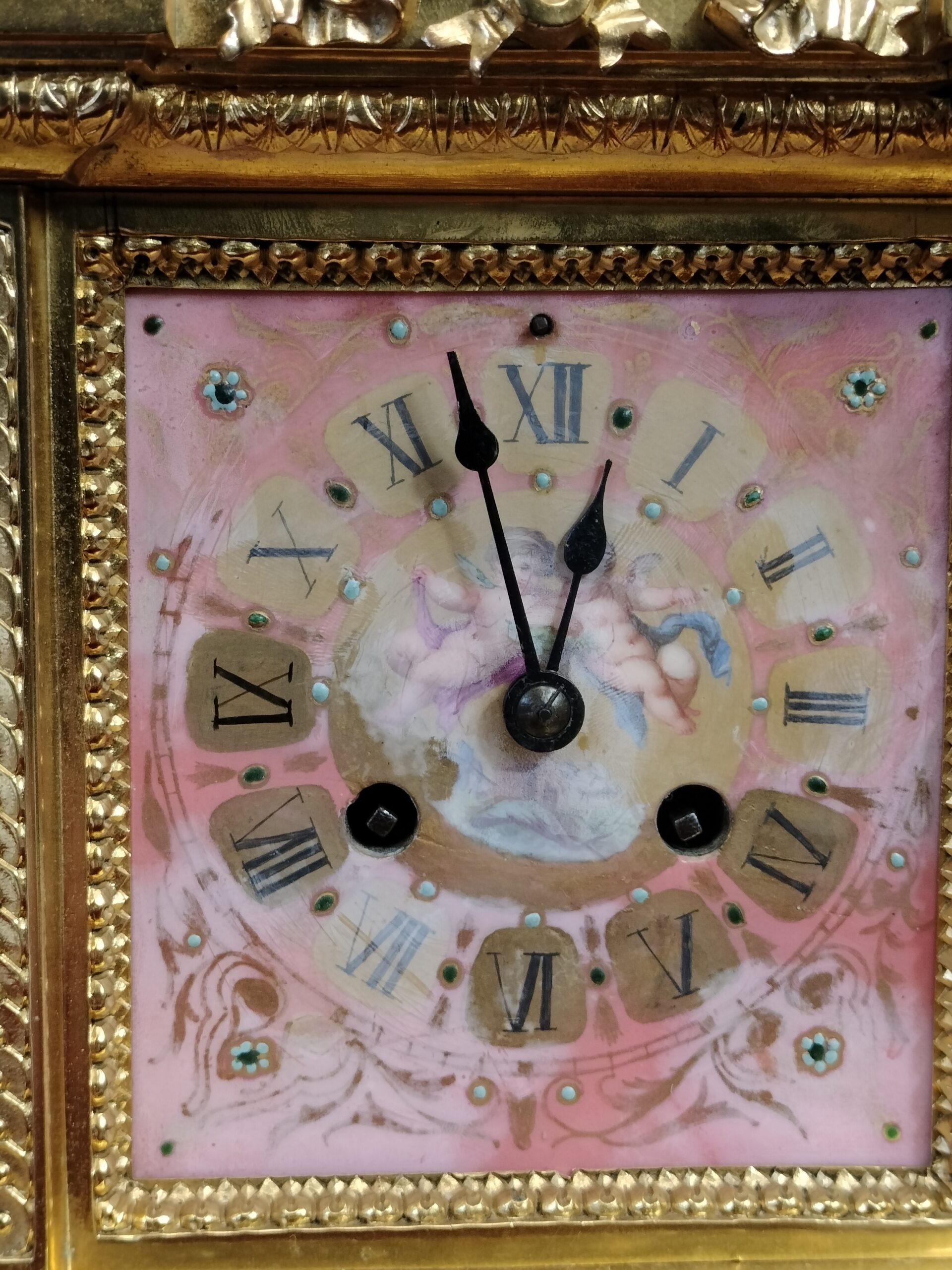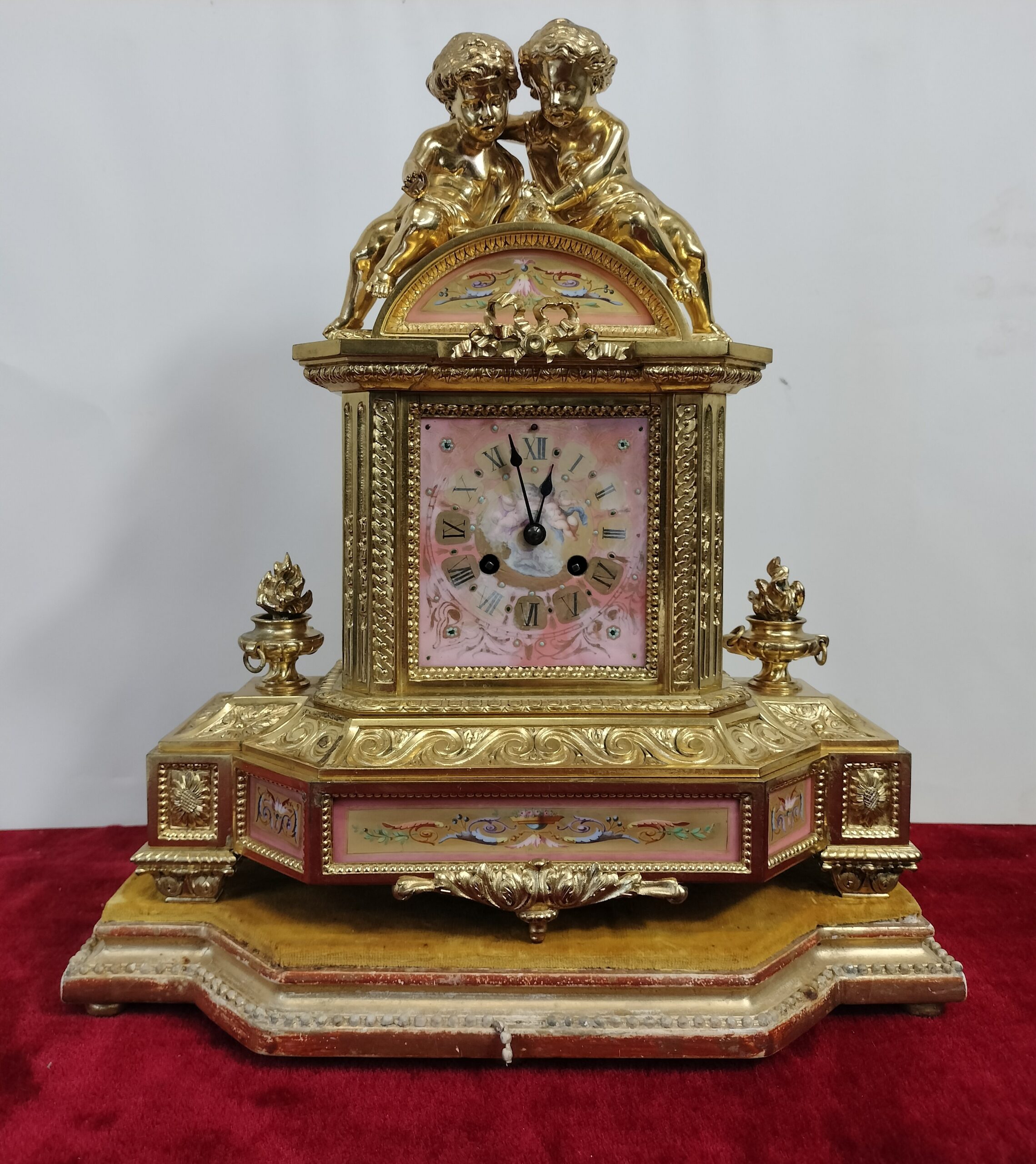 VER IMÁGENES PARA COMPROBAR EL ESTADO REAL. LAS IMÁGENES FORMAN PARTE DE LA DESCRIPCIÓN. RELOJ DE REPISA DE ESTILO NEOCLÁSICO O LUÍS XVI. METAL DORADO Y INCRUSTACIONES EN PORCELANA DE SÈVRES (?). CORONADO CON UN FRONTAL SEMICIRCULAR Y DOS PUTTI. ESFERA CENTRAL EN PORCELANA. NÚMEROS ROMANOS Y PINTURA DE PUTTI, DIFUMINADA. FLANQUEADO POR URNAS FLAMÍGERAS. PANELES EN FRISO Y EN LOS LATERALES EN PORCELANA. NO DISPONEMOS DE LA LLAVE. SONERÍA DE CAMPANA. BASE EN MADERA TERCIOPELADA, CON DESGASTES EN LAS CENEFAS Y PÉRDIDAS DE POLICROMIA. NO FUNCIONA. PRECISA UN REPASO DEL MECANISMO INTERIOR. LA PINTURA DE LA PORCELANA SE ENCUENTRA BASTANTE DESGASTADA. UNA DE LAS PLACAS LATERALES SE ENCUENTRA LIGERAMENTE DESENCAJADA.