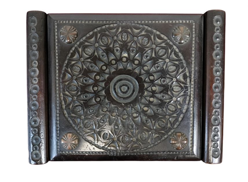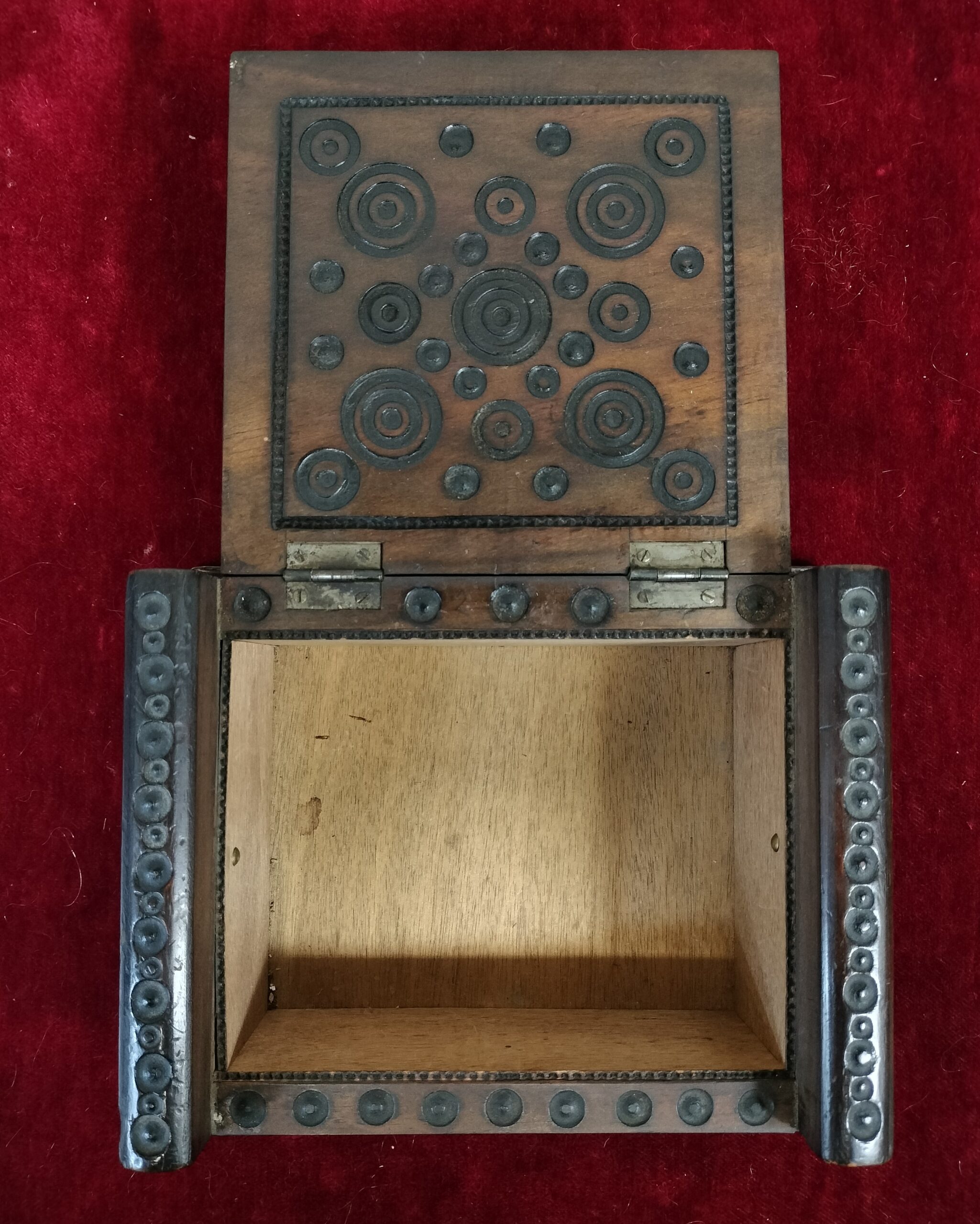 VER IMÁGENES PARA COMPROBAR EL ESTADO REAL. LAS IMÁGENES FORMAN PARTE DE LA DESCRIPCIÓN. CAJA DECORATIVA PARA TABACO. TALLADO CON MOTIVOS GEOMÉTRICOS. BARNIZADA. APLIQUES DE METAL. ESTILO NEOGÓTICO. CON LIGEROS RASGUÑOS Y EROSIONES. MEDIDAS APROX: 25,5 X 20 X 10 INTERIOR: 17 X 13