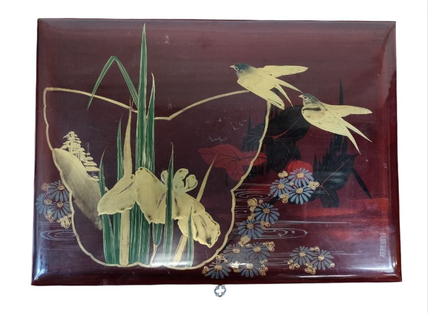 VER IMÁGENES PARA COMPROBAR EL ESTADO REAL. LAS IMÁGENES FORMAN PARTE DE LA DESCRIPCIÓN. PINTURA FIJADA EN LACA, CON LÍNIAS EN RELIEVE (TAKAMAKI-E) Y EN PLANO (HIRAMAKI-E). CON MOTIVOS DE FLORES, HOJAS Y PÁJAROS. ORNADAS CON KANJIS DORADOS. CON LLAVE. LIGEROS RASGUÑOS. ALGUNOS BORDES PINTADOS LIGERAMENTE DESDIBUJADOS. MEDIDAS: 32 ANCHO X 23 LARGO X 12 ALTO