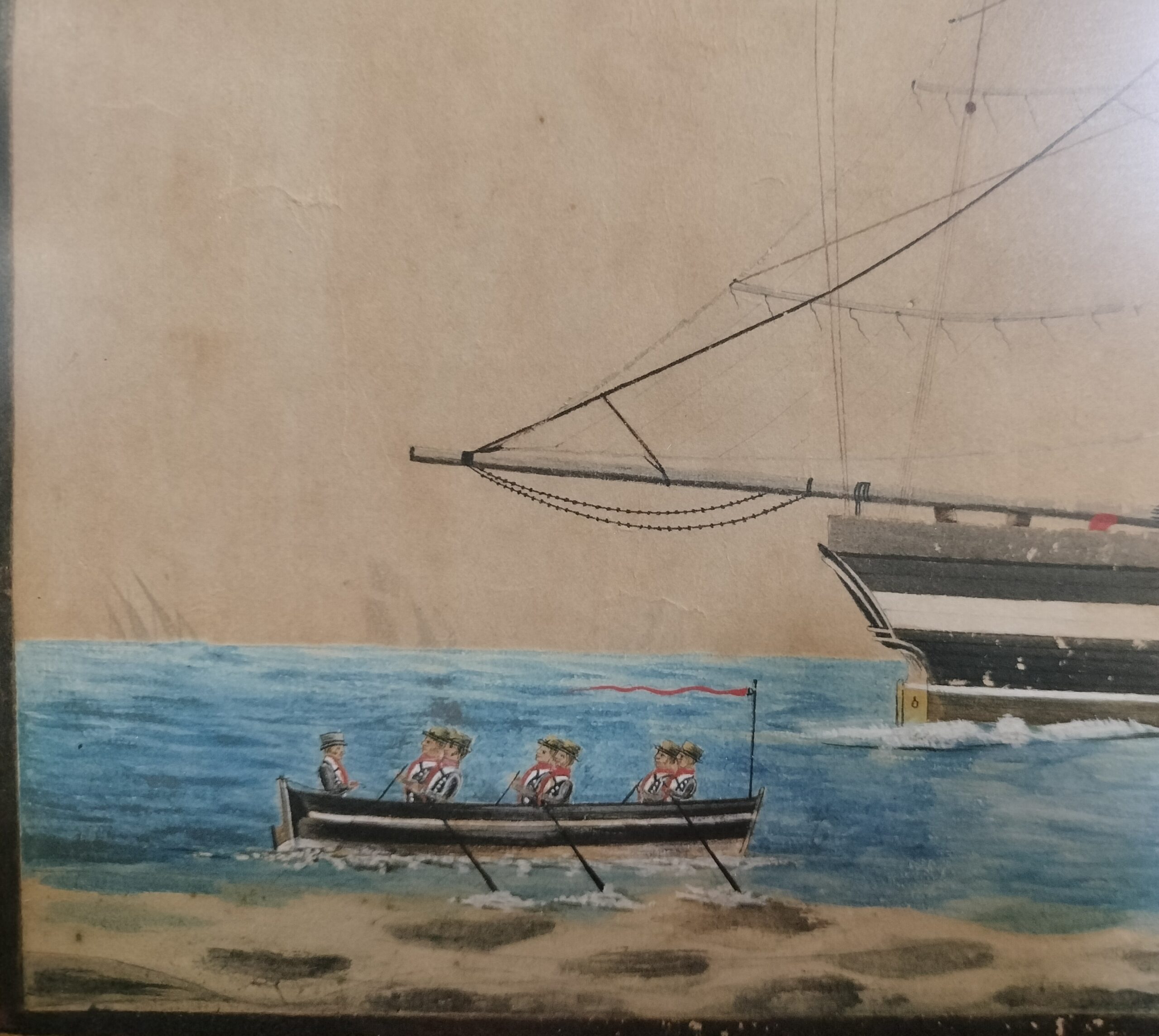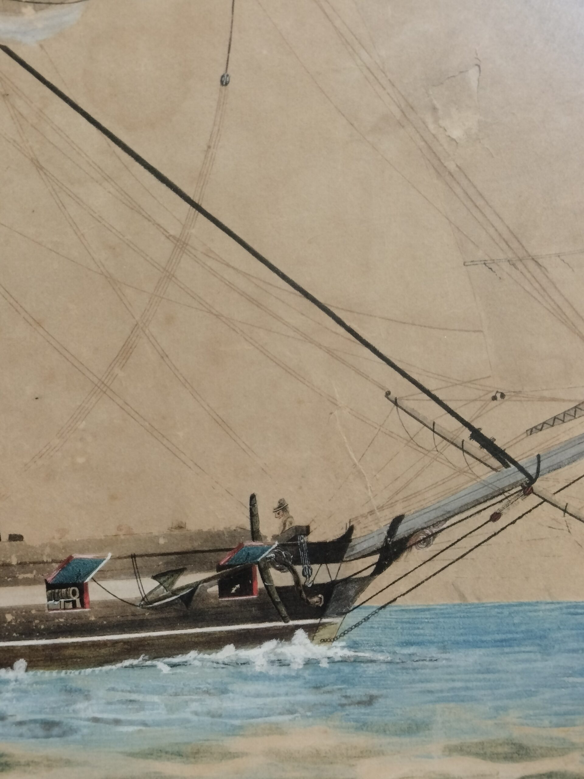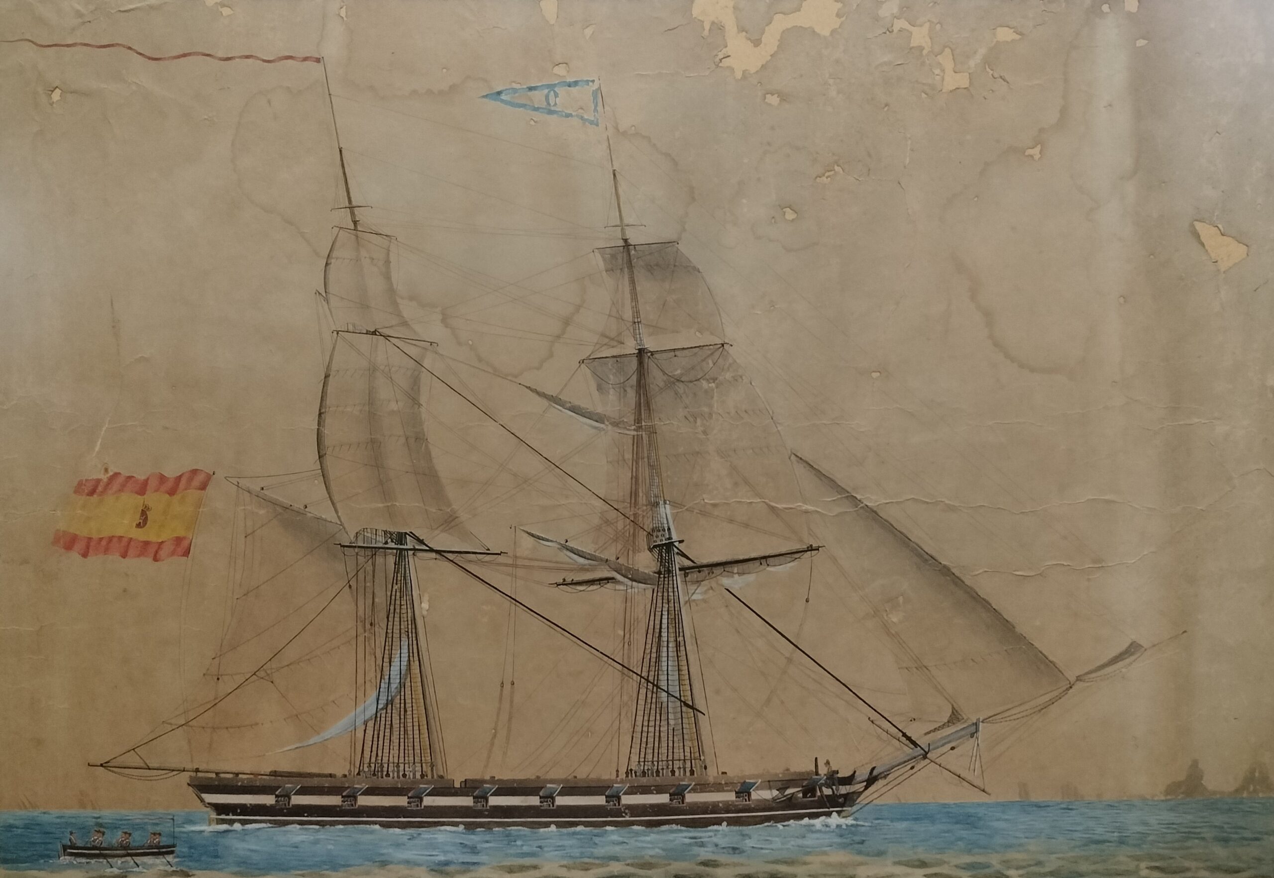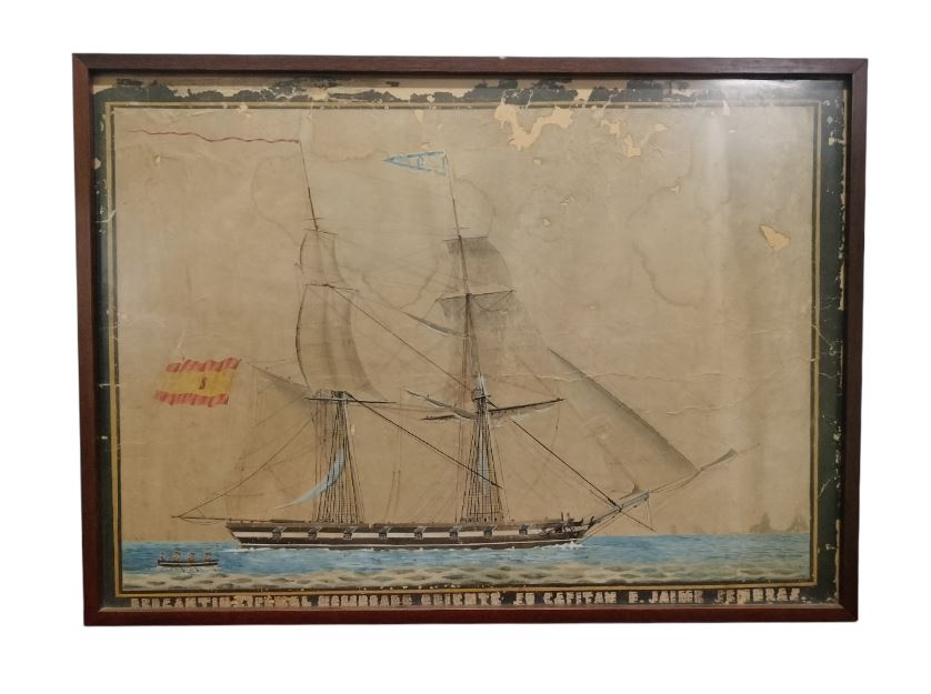 VER IMÁGENES PARA COMPROBAR EL ESTADO REAL. LAS IMÁGENES FORMAN PARTE DE LA DESCRIPCIÓN. BERGANTÍN ESPAÑOL. INSCRIPCIÓN EN LA PARTE INFERIOR: ‘BERGANTÍN ESPAÑOL NOMBRADO ORIENTE ES CAPITAN D. JAIME […]’. TÉCNICA MIXTA SOBRE PAPEL. ACUARELA Y TRAZOS EN TINTA. ESTILO ACADÉMICO. MARCO DE MADERA. CON PROTECTOR DE PLÁSTICO. EL PAPEL PRESENTA IMPORTANTES ROTURAS Y PLIEGUES, ESPECIALMENTE EN LA PARTE SUPERIOR. VER IMÁGENES. MEDIDAS: MARCO: 72 X 53 INTERIOR: 68,8 X 49