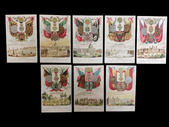 LOTE DE 8 CROMOS SOBRE MONUMENTOS, BANDERAS Y MONEDAS NACIONALES. SOBRE PAPEL. FRANCIA. XIX