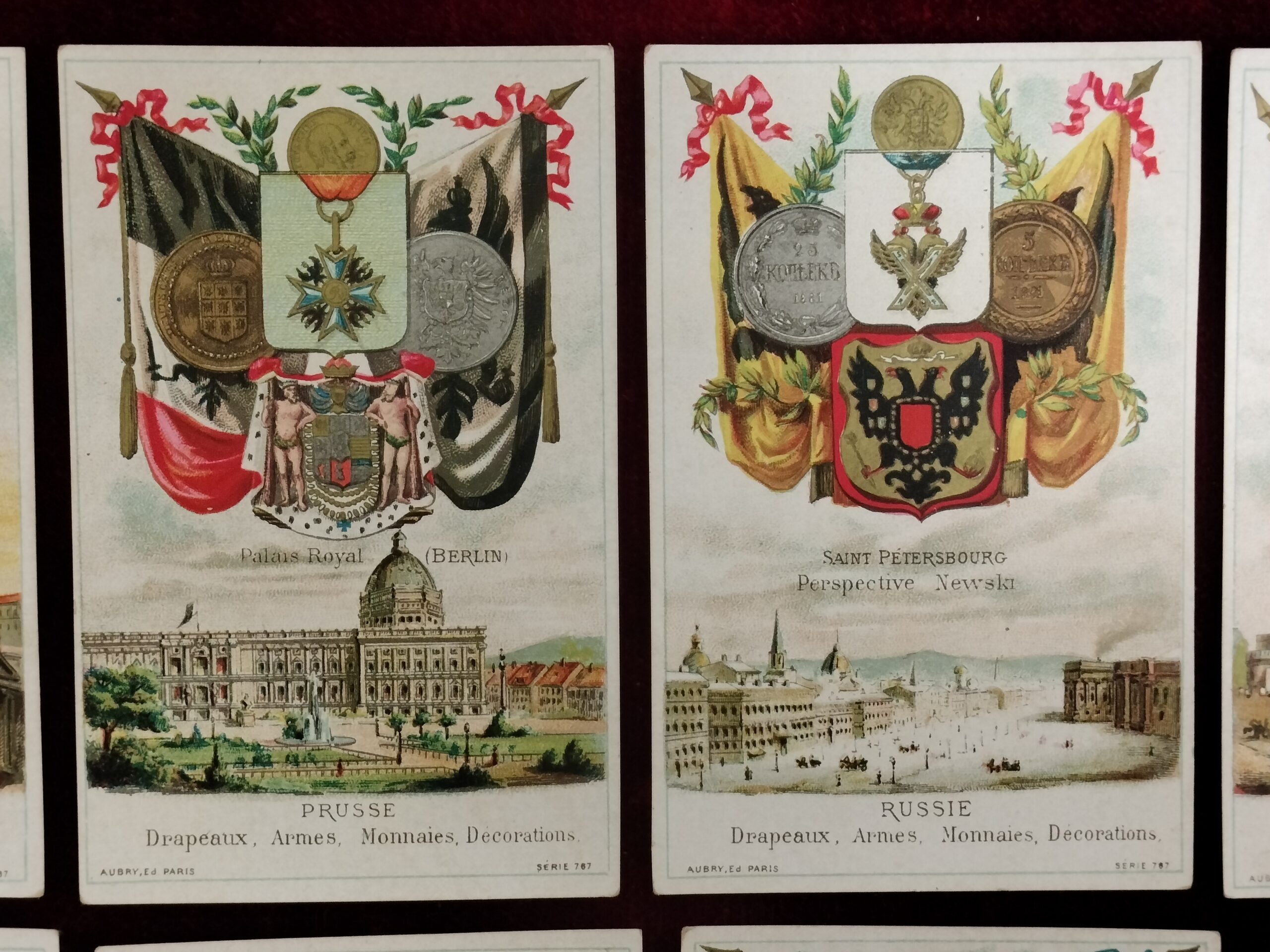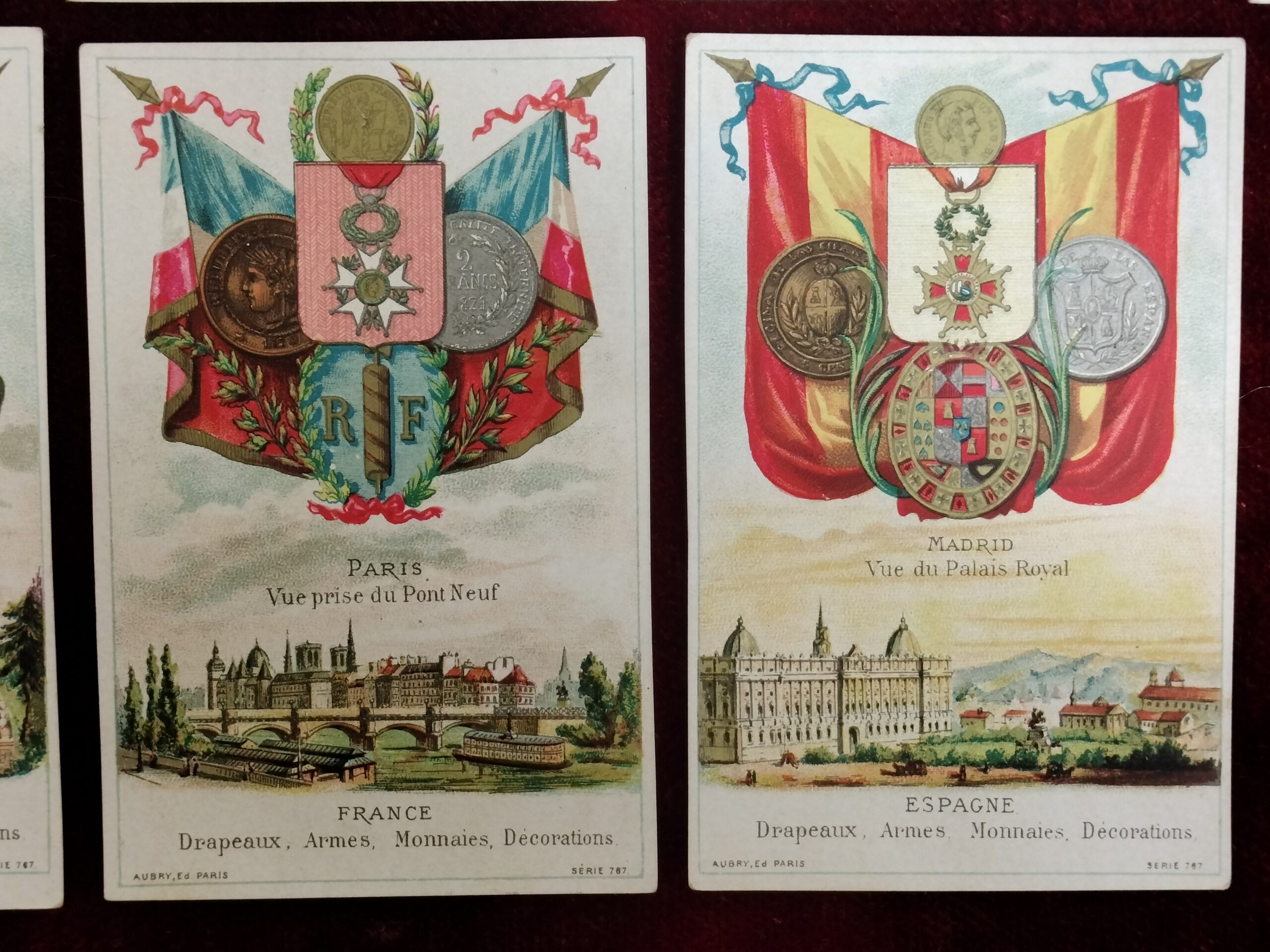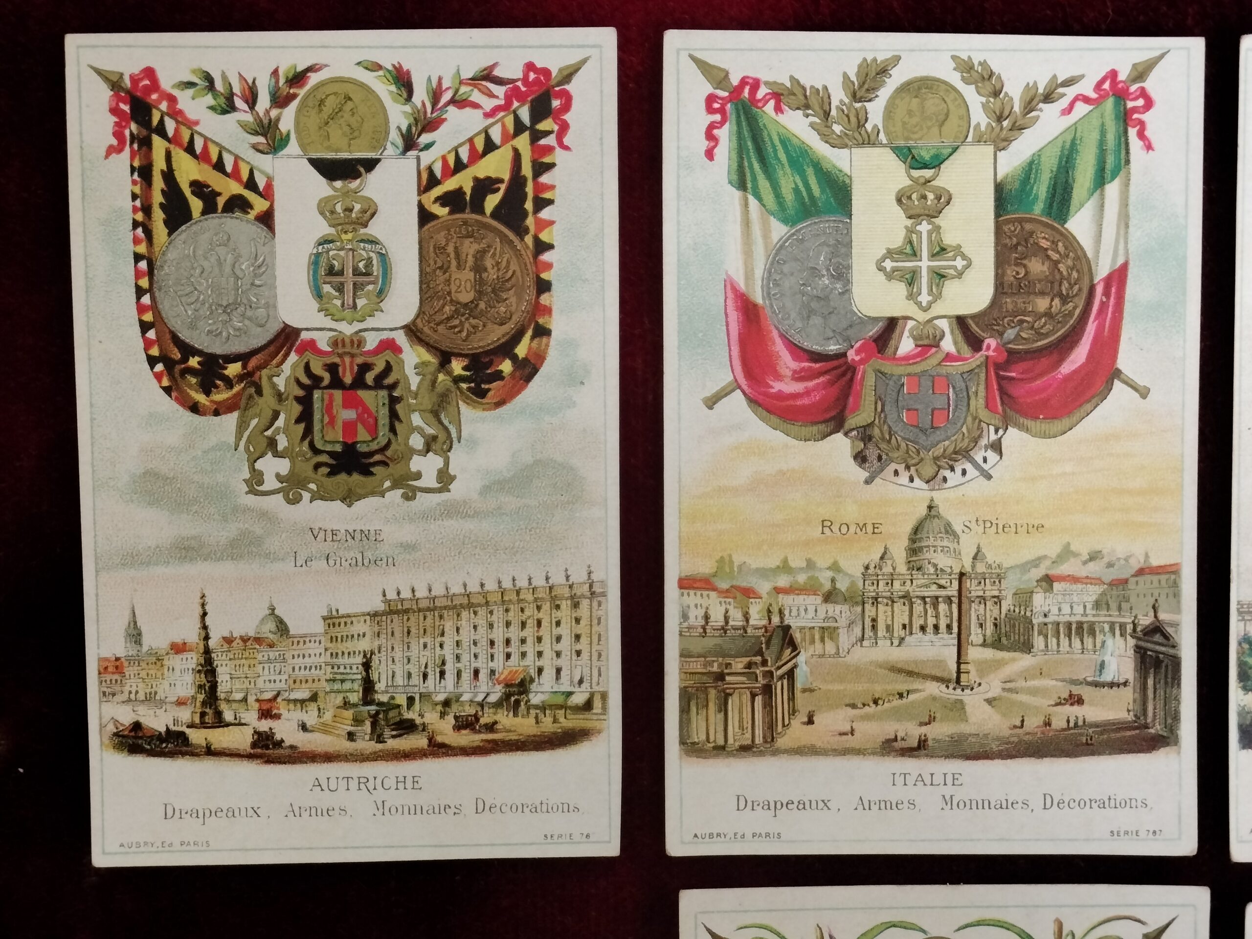 VER IMÁGENES PARA COMPROBAR EL ESTADO REAL. LOTE DE SEIS CROMOS SOBRE MONUMENTOS, BANDERAS Y MONEDAS NACIONALES. AUBRY, ED. PARÍS. SERIE 767. CON DETALLES PINTADOS A MANO. BUEN ESTADO GENERAL, VER IMÁGENES.