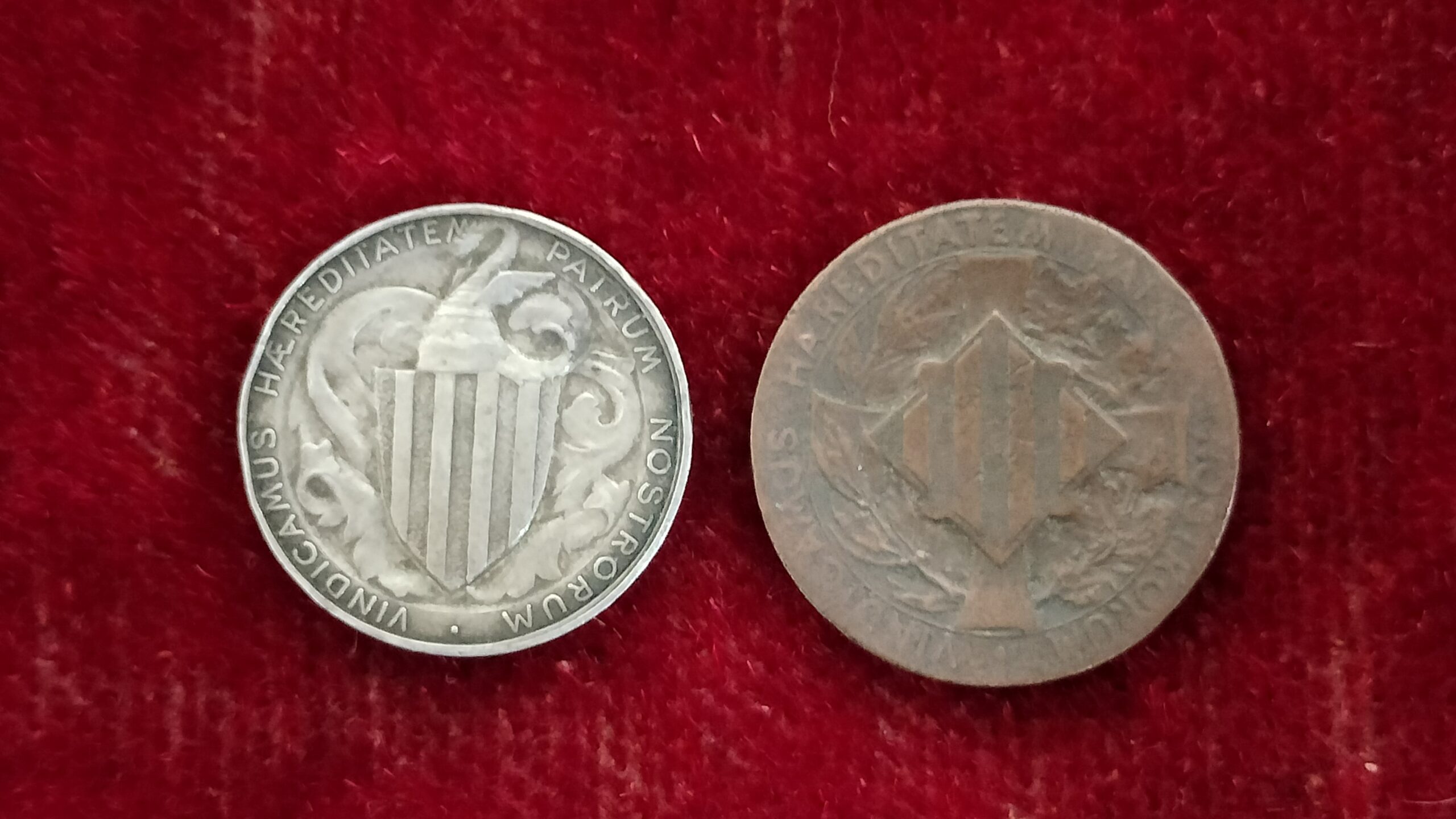 VER IMÁGENES PARA COMPROBAR EL ESTADO REAL. LAS IMÁGENES FORMAN PARTE DE LA DESCRIPCIÓN. PAREJA DE MONEDAS (PESETAS) ACUÑACIÓN POR LA UNIÓ CATALANISTA (1900). UNA DE PLATA (2,2 X 2,2 CM): 5,08 GRAMOS. UNA DE COBRE (2,4 X 2,4 CM): 4,86 GRAMOS. SANT JORDI EN EL ANVERSO. LA SENYERA EN EL REVERSO: ‘VINDICAMUS HAEREDITATEM PATRUM NOSTRORUM’. LIGEROS DESGASTES, ESPECIALMENTE EN LA MONEDA DE COBRE, CON DIBUJO BASTANTE DESDIBUJADO.