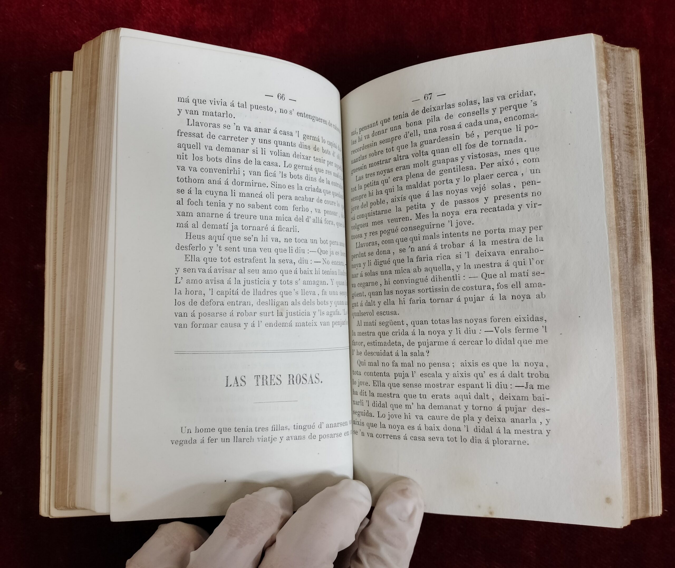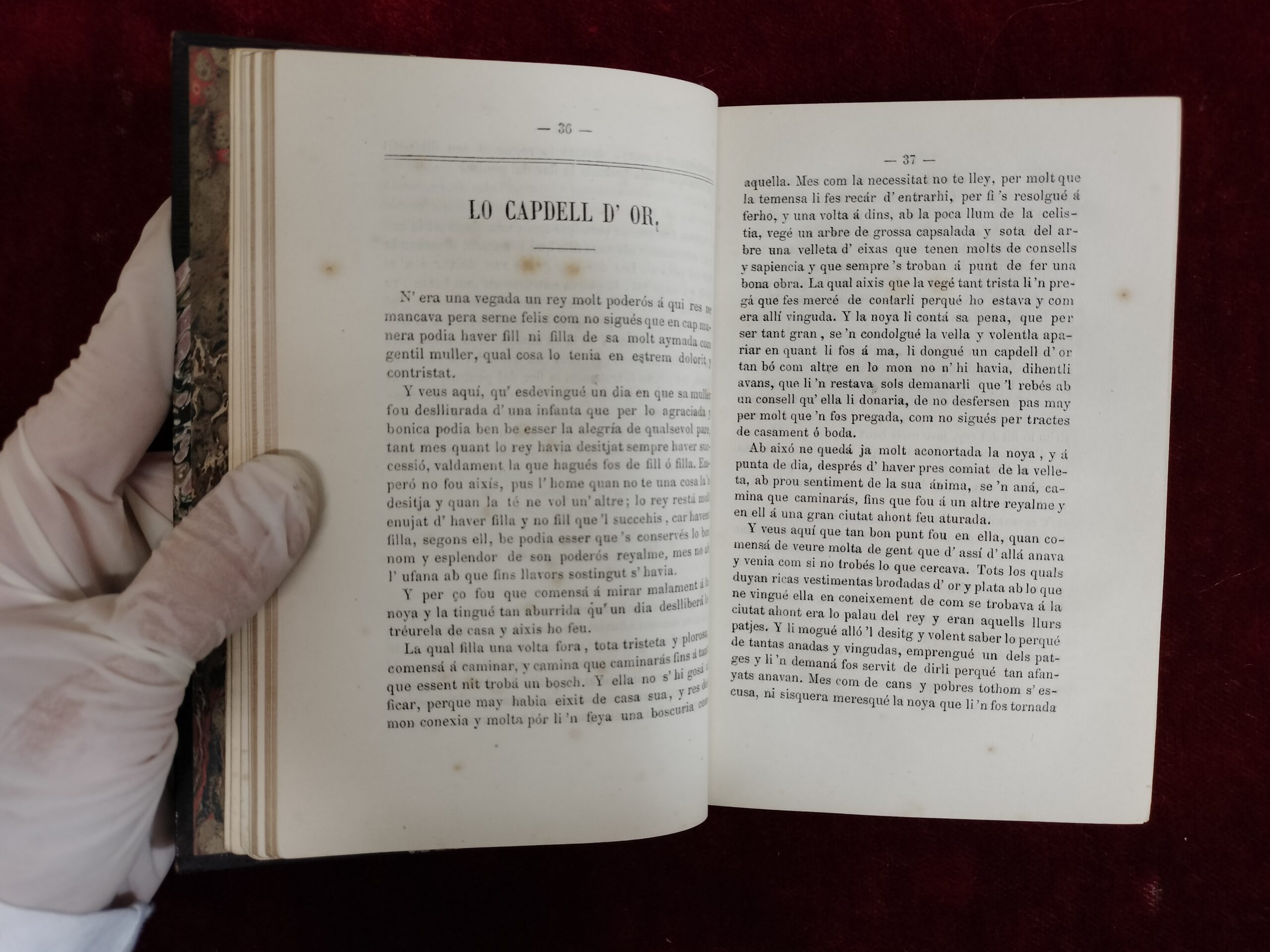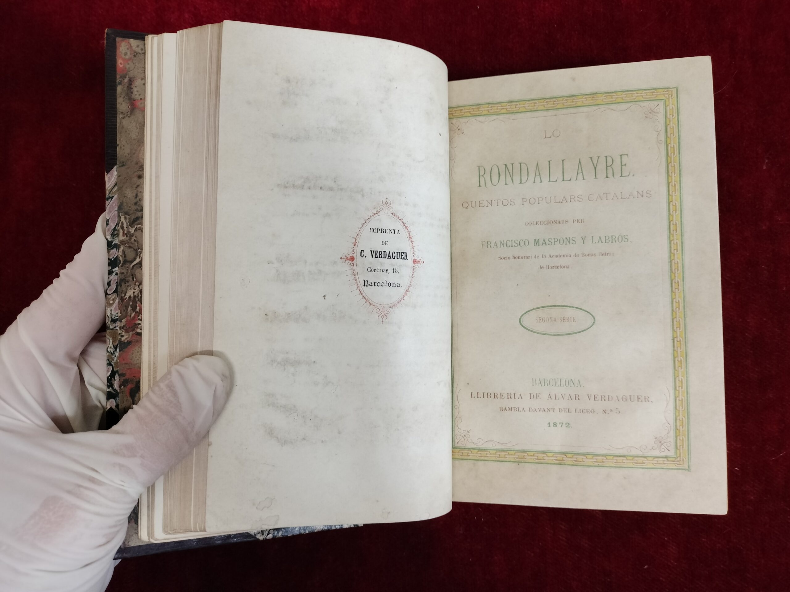 VER IMÁGENES PARA COMPROBAR EL ESTADO REAL. LAS IMÁGENES FORMAN PARTE DE LA DESCRIPCIÓN. LO RONDALLAYRE. DOS VOLÚMENES EN UN LIBRO, CON CUENTOS DIFERENTES: – LO RONDALLAYRE. QUENTOS POPULARS CATALANS. FRANCISCO MASPONS Y LABRÓS. LLIBRERIA ÁLVAR VERDAGUER. BARCELONA. 1871. 110 PÁG. – LO RONDALLAYRE. QUENTOS POPULARS CATALANS. TERCERA SERIE. FRANCISCO MASPONS Y LABRÓS. LLIBRERIA ÁLVAR VERDAGUER. BARCELONA. 1872. 173 PÁG. ENCUADERNACIÓN HOLANDESA. PIEL Y PASTA ESPAÑOLA. GUARDAS DECORADAS AL AGUA. PÁGINAS CON CANTOS DORADOS. EN CATALÁN. PRESENTA RESTOS DE ÓXIDO.