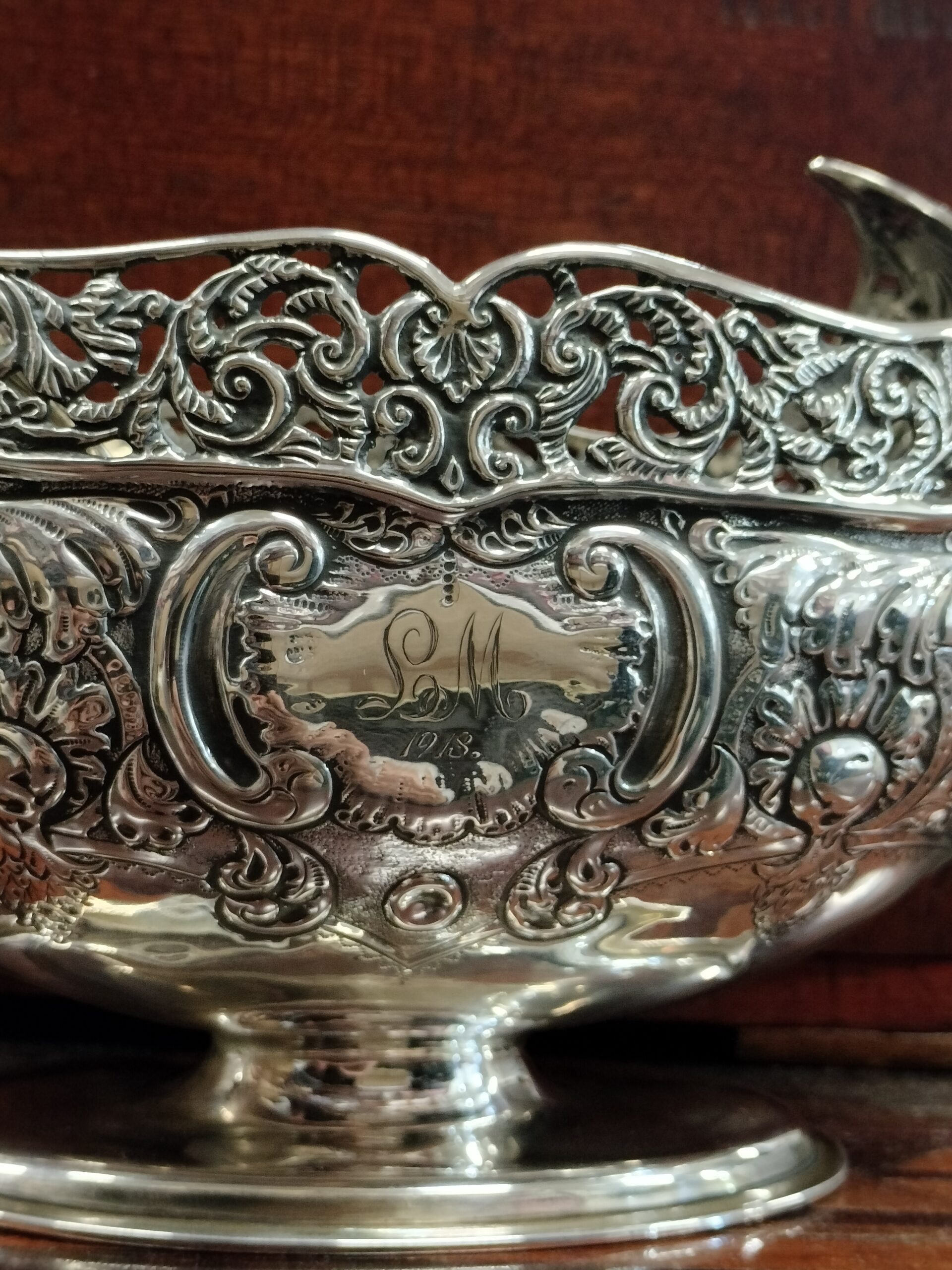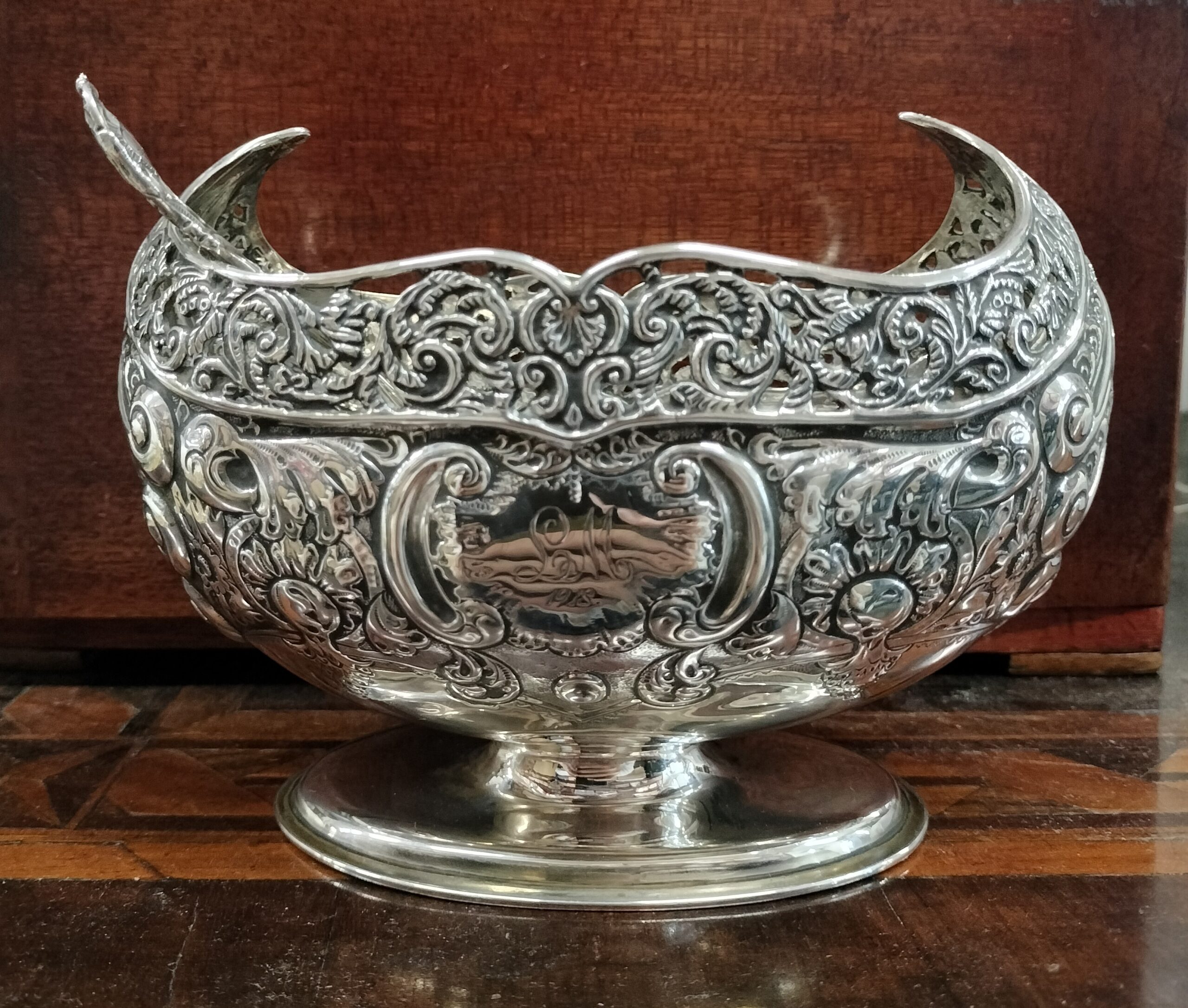 VER IMÁGENES PARA COMPROBAR EL ESTADO REAL. LAS IMÁGENES FORMAN PARTE DE LA DESCRIPCIÓN. ANTIGUO AZUCARERO VICTORIANO, CON CUCHARILLA. PLATA CINCELADA. PUNZONADO. SE APRECIAN TAMBIÉN LAS INICIALES S.M Y EL AÑO ‘1918’. ORNAMENTADO CON MOTIVOS FLORALES Y VOLUTAS DE GRAN DETALLISMO. BUEN ESTADO GENERAL, LIGERAS EROSIONES. MEDIDAS: AZUCARERA: 11,5 CM (ALTO). BASE: 11 X 7 CM. BOCA: 9 X 10,5 CM. CUCHARA: 13 CM (LARGO).