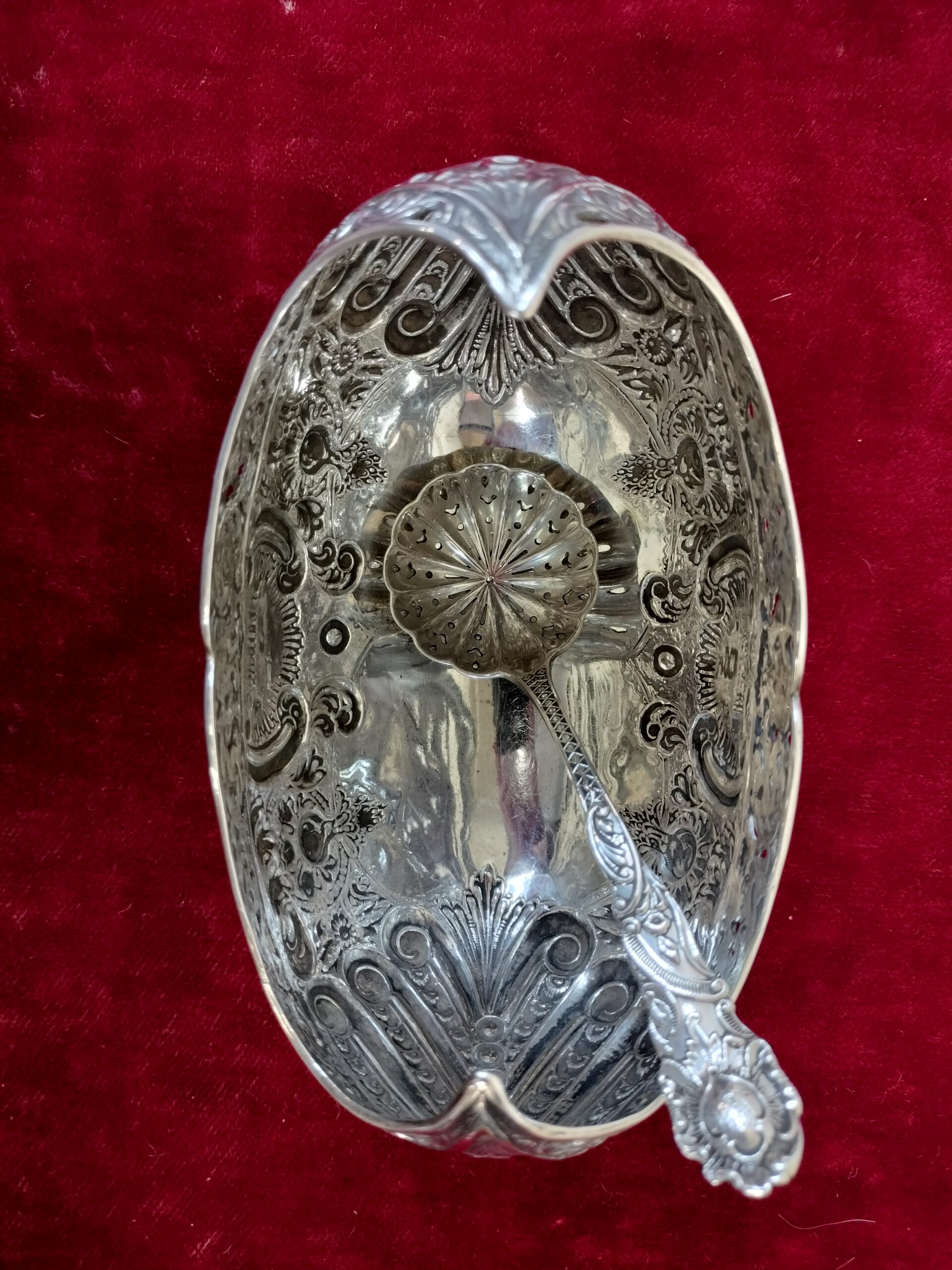 AZUCARERO VICTORIANO CON CUCHARILLA CERNIDORA. PLATA CINCELADA. INGLATERRA. XIX-XX