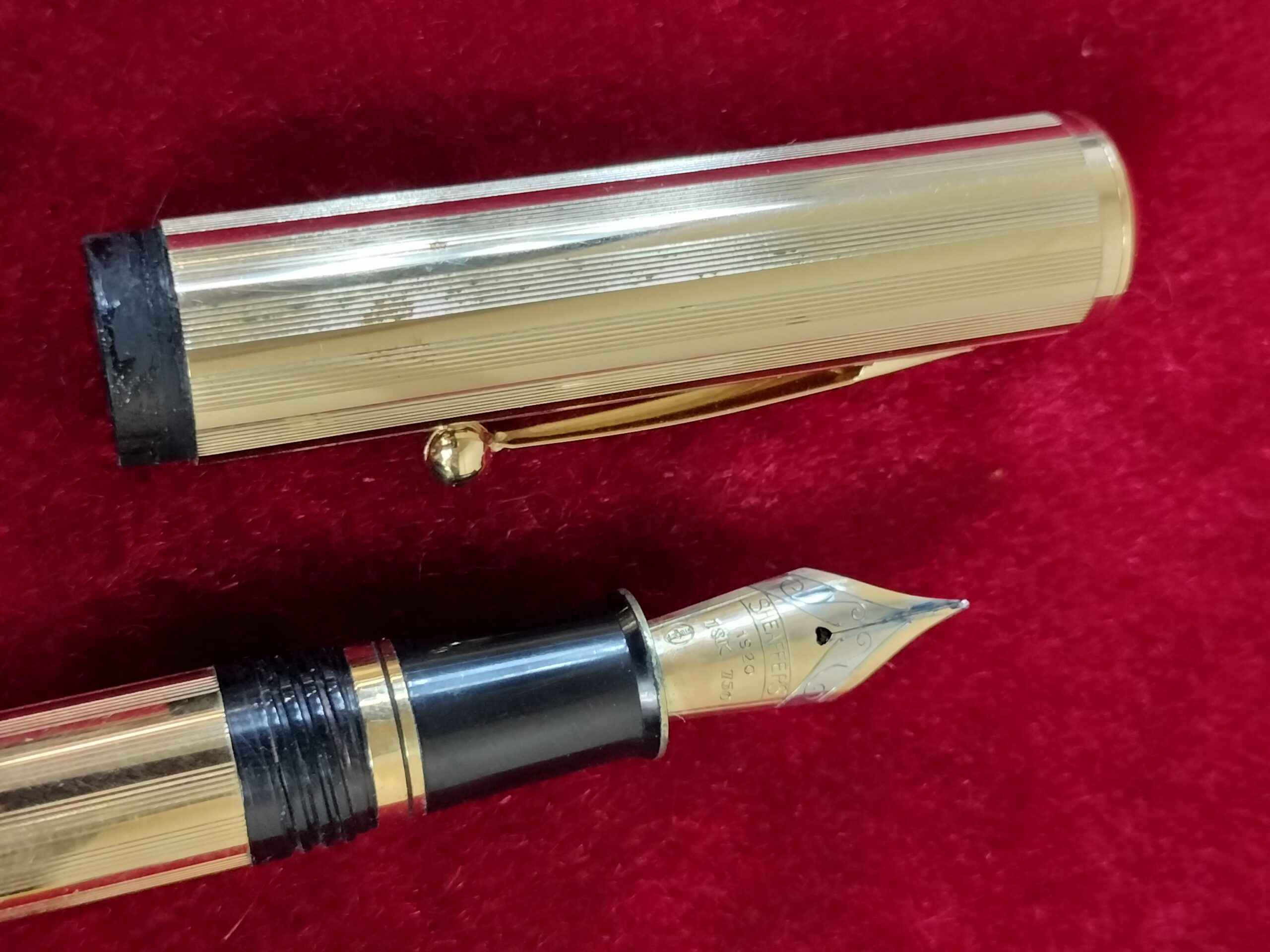 VER IMÁGENES PARA COMPROBAR EL ESTADO REAL. LAS IMÁGENES FORMAN PARTE DE LA DESCRIPCIÓN. PLUMA ESTILOGRÁFICA SHEAFFER, CON ESTUCHE. METAL DORADO Y PLUMÍN EN ORO, 18K 750. FECHADO EN EL PLUMÍN: 1920. PLUMÍN SECO, DESCONOCEMOS SI FUNCIONA CORRECTAMENTE. FALTA UN EMBELLECEDOR EN EL TAPÓN. 13,7 CM LARGO.