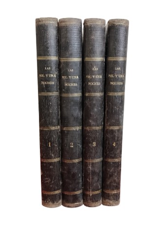 VER IMÁGENES PARA COMPROBAR EL ESTADO REAL. LAS IMÁGENES FORMAN PARTE DE LA DESCRIPCIÓN. LAS MIL Y UNA NOCHES, CUENTOS ÁRABES. POR GUSTAVO WEIL. CON ANOTACIONES DEL MISMO Y UNA INTRODUCCIÓN DEL BARÓN SILVESTRE DE SACY. ENCUADERNACIÓN HOLANDESA. LOMO EN PIEL, TAPA EN PASTA. LIGERAMENTE FATIGADA, CON RASGUÑOS Y EROSIONES. EDICIÓN ILUSTRADA. EN ESPAÑOL. PÁGINAS NUMERADAS. 4 TOMOS. – TOMO I: 421 PÁG. – TOMO II: 410 PÁG. – TOMO III: 392 PÁG. – TOMO IV: 364 PÁG. BUEN ESTADO GENERAL. ENCUADERNACIÓN FATIGADA. PÁGINAS LIGERAMENTE AMARILLAS. VER IMÁGENES.
