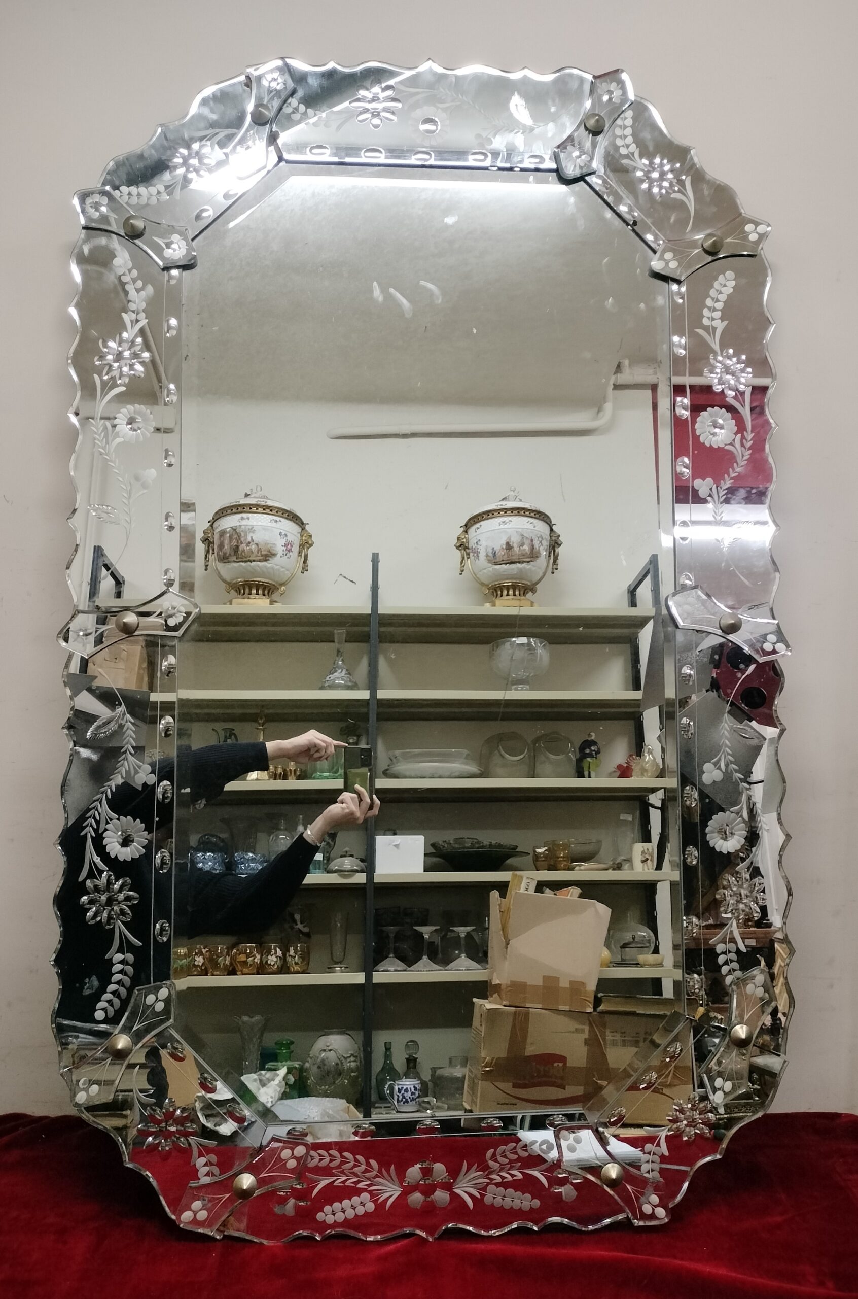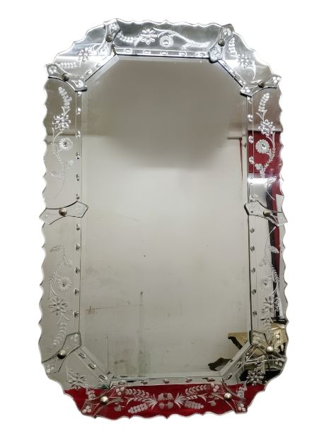 VER IMÁGENES PARA COMPROBAR EL ESTADO REAL. LAS IMÁGENES FORMAN PARTE DE LA DESCRIPCIÓN. GRAN ESPEJO MURAL DE ESTILO VENECIANO. ESTRUCTURA DE MADERA. VIDRIO GRABADO CON MOTIVOS FLORALES Y APLIQUES DE METAL PLATEADO. UNA DE LAS PIEZAS SE ENCUENTRA DESPRENDIDA. MUY FRÁGIL. SIN FIRMA NI MARCA DE AUTOR APARENTE. PRESENTA LIGEROS RESTOS DE ÓXIDO Y DESGASTES. VER IMÁGENES. MEDIDAS: 94,5 X 151