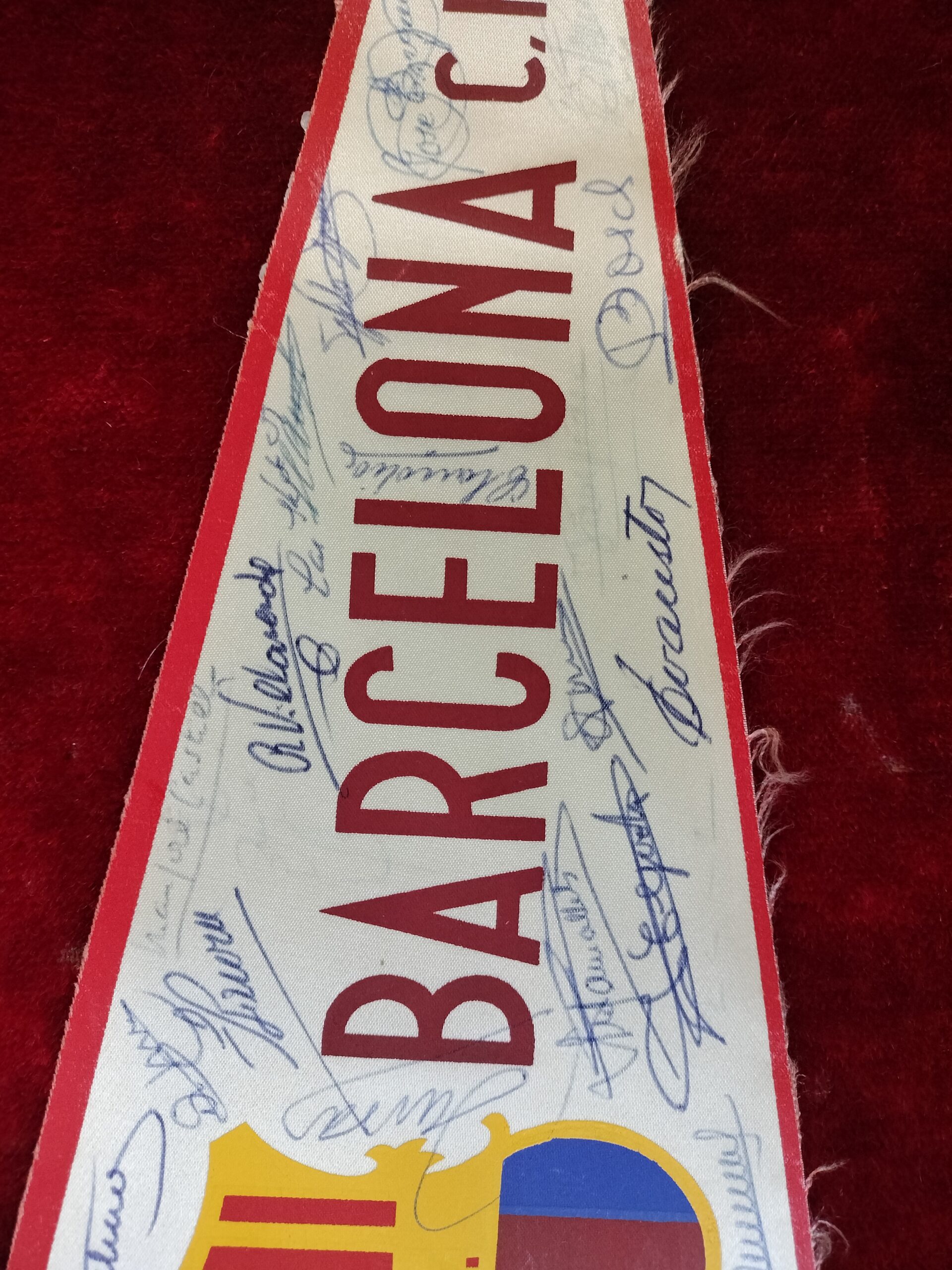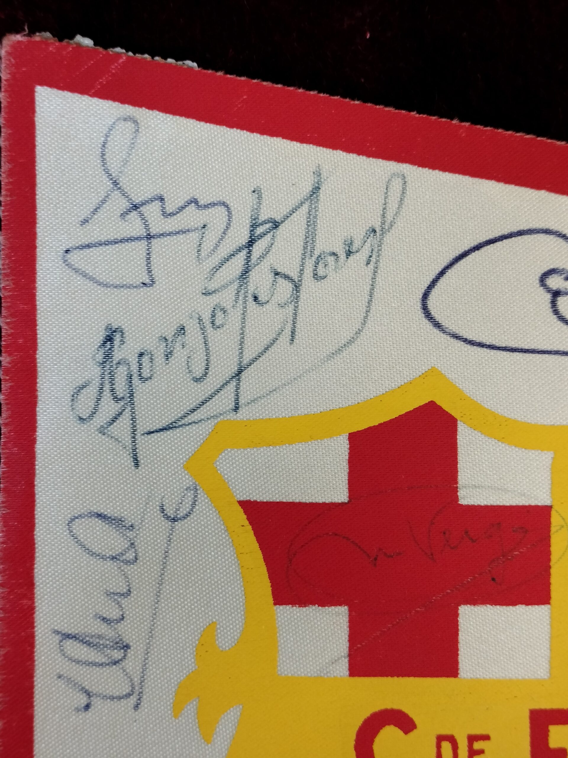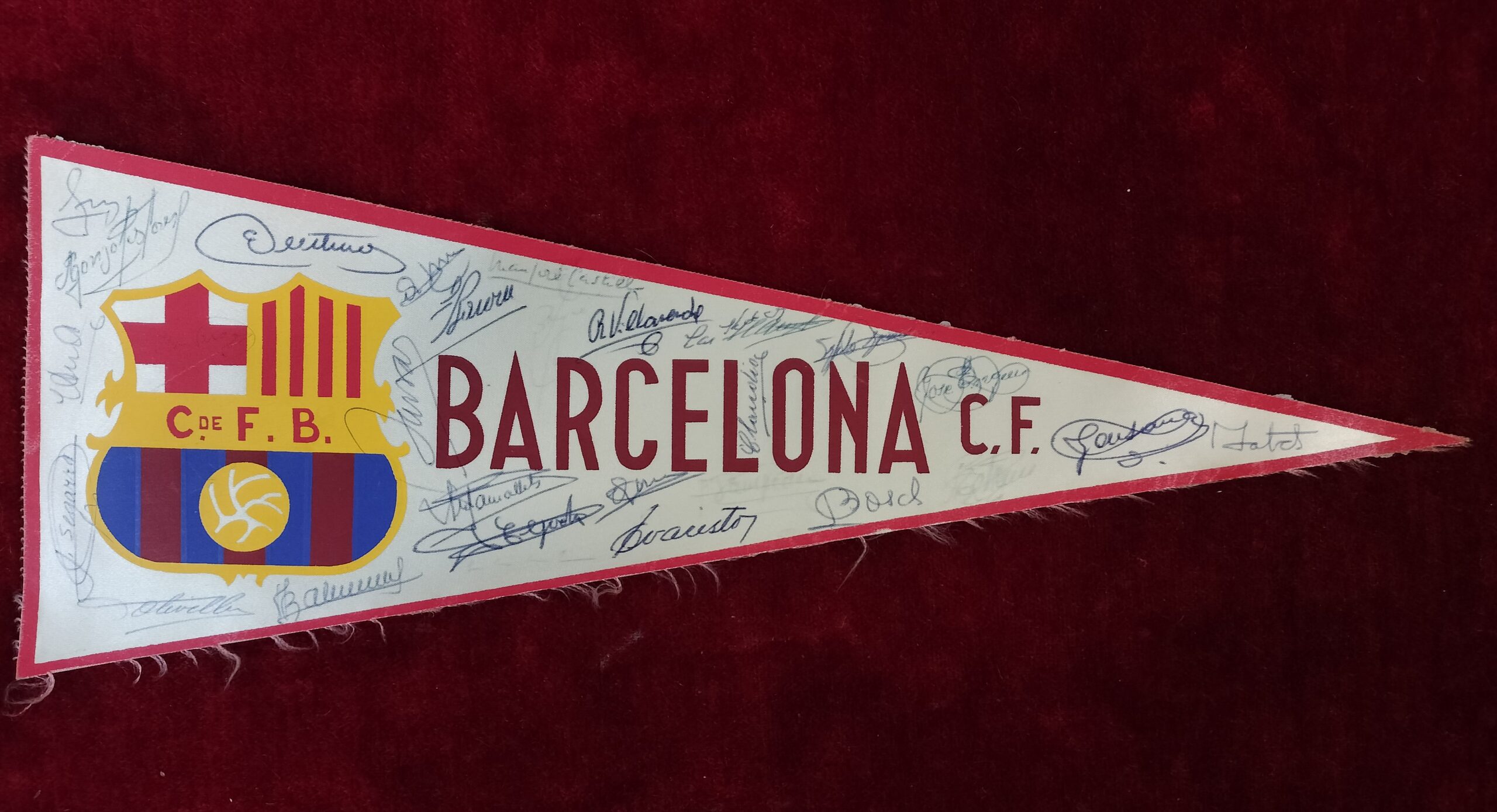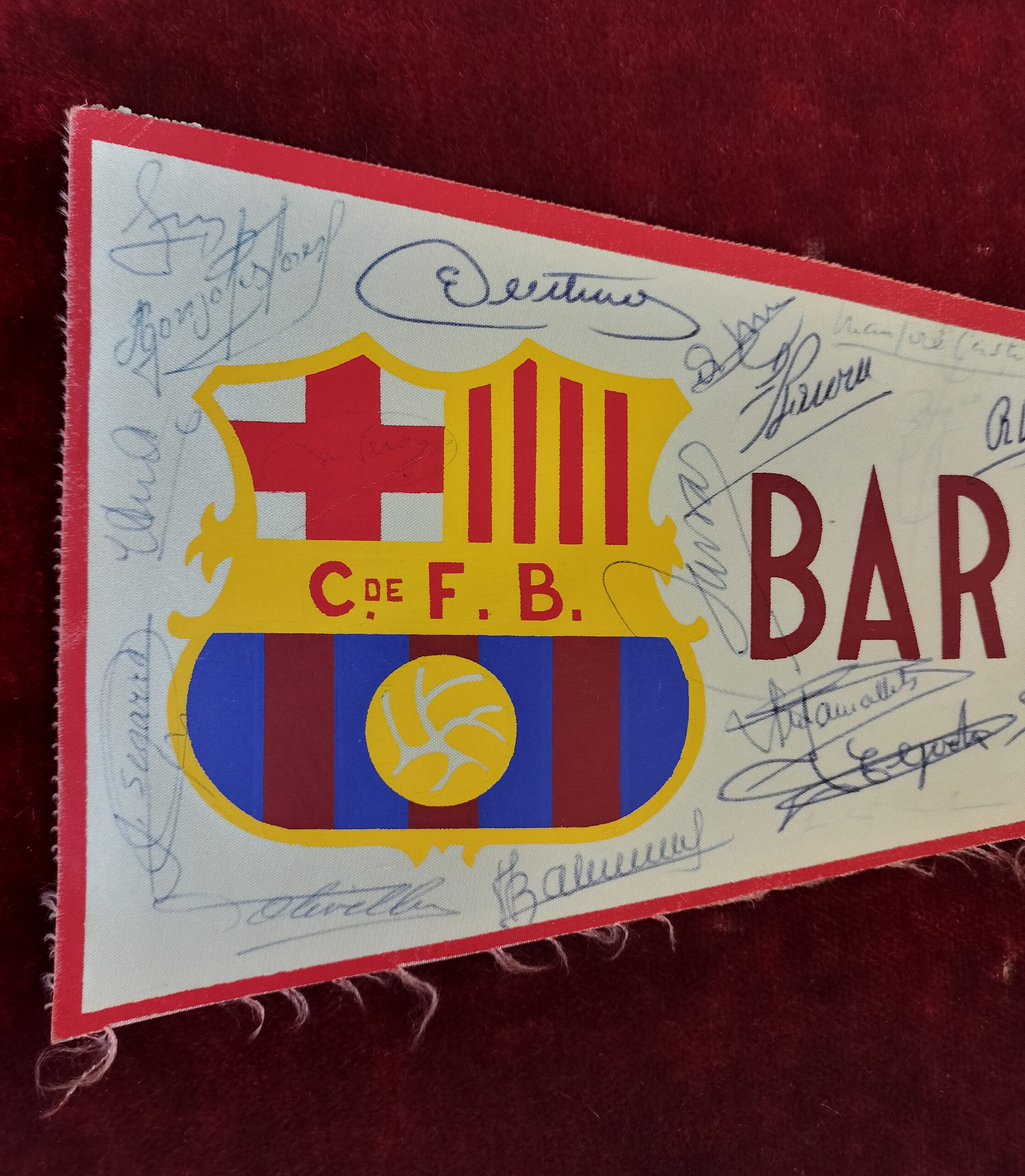 VER IMÁGENES PARA COMPROBAR EL ESTADO REAL.  LAS IMÁGENES FORMAN PARTE DE LA DESCRIPCIÓN.  BANDERÍN DE LA COPA REPÚBLICA DE VENEZUELA, 1957: FÚTBOL CLUB BARCELONA.  CON FIRMAS AUTÓGRAFAS: EVARISTO, KUBALA, ETC.  ESCUDO SERIGRAFIADOS.  BORDES LIGERAMENTE DESILACHADOS, VER IMÁGENES. BUEN ESTADO GENERAL.  Esta fue la quinta y última edición de la llamada Pequeña Copa del Mundo. En 1957 se reunieron en el campo de la UCV en Caracas (Venezuela) los siguientes equipos: Barcelona (España), Sevilla (España), Botafogo de Río de Janeiro (Brasil) y Nacional de Montevideo (Uruguay), proclamándose campeón el equipo azulgrana con cuatro victorias y dos empates.