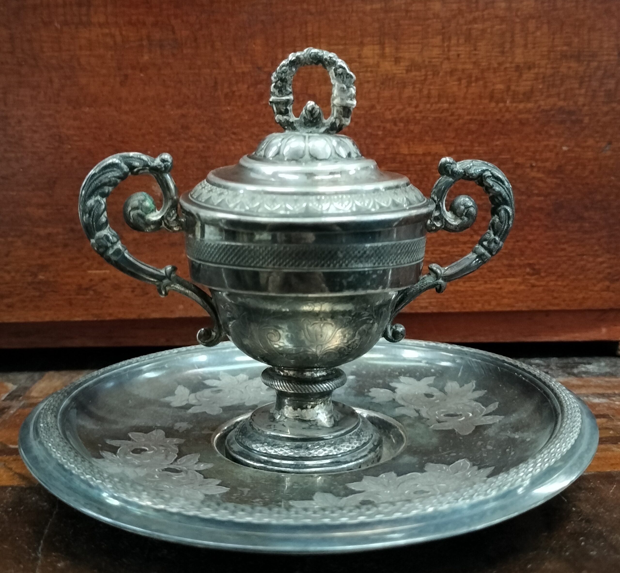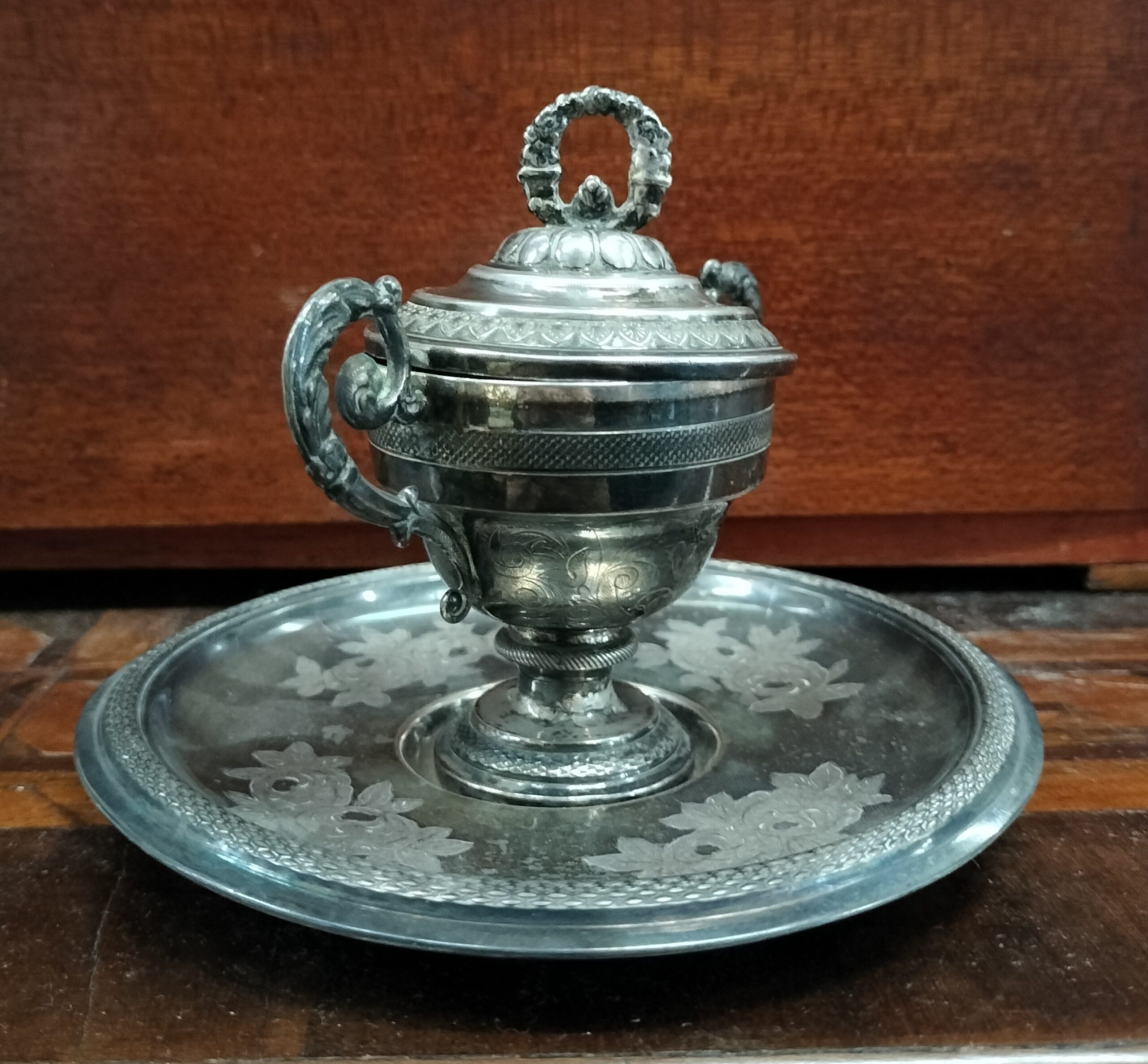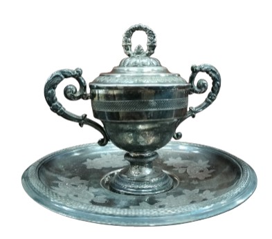 ANTIGUO AZUCARERO CON PLATO. ESTILO IMPERIO. PLATA CINCELADA. EUROPA. XVIII-XIX