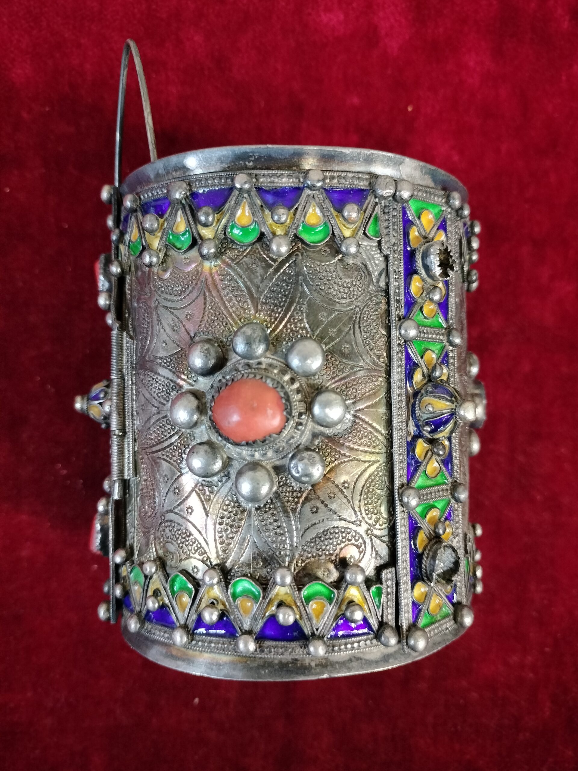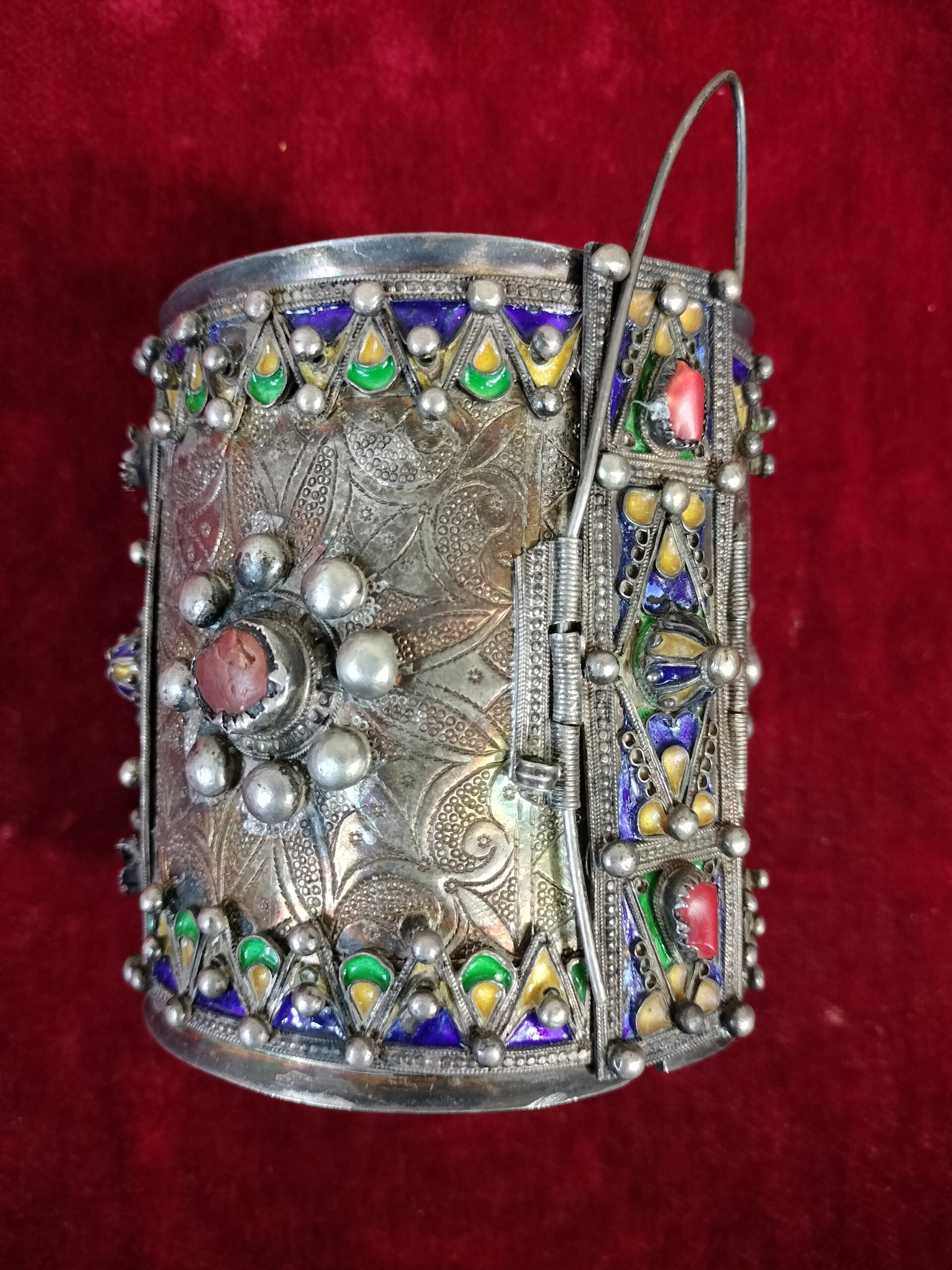 VER IMÁGENES PARA COMPROBAR EL ESTADO REAL. LAS IMÁGENES FORMAN PARTE DE LA DESCRIPCIÓN. LOTE DE JOYAS BEREBERES. EL CONJUNTO INCLUYE UN BRAZALETE, UNA PULSERA, UNA FÍBULA Y UN COLGANTE CIRCULAR. PLATA Y INCRUSTACIONES DE PIEDRAS. ORNAMENTACIONES EN ESMALTE, CON TONALIDADES AZULES, VERDES, AMARILLAS Y ROJAS. DETALLES CINCELADOS. SE APRECIAN PIEDRAS FALTANTES Y LIGEROS DESGASTES DEBIDO AL USO. MEDIDAS APROXIMADAS: BRAZALETE: 10 CM (ALTO) X 8,8 CM X 8,6 CM. COLGANTE: 11,5 CM X 8,3 CM. PULSERA: 6 X 6 X 2,2 CM. FÍBULA: 6 X 4,5 CM.