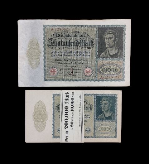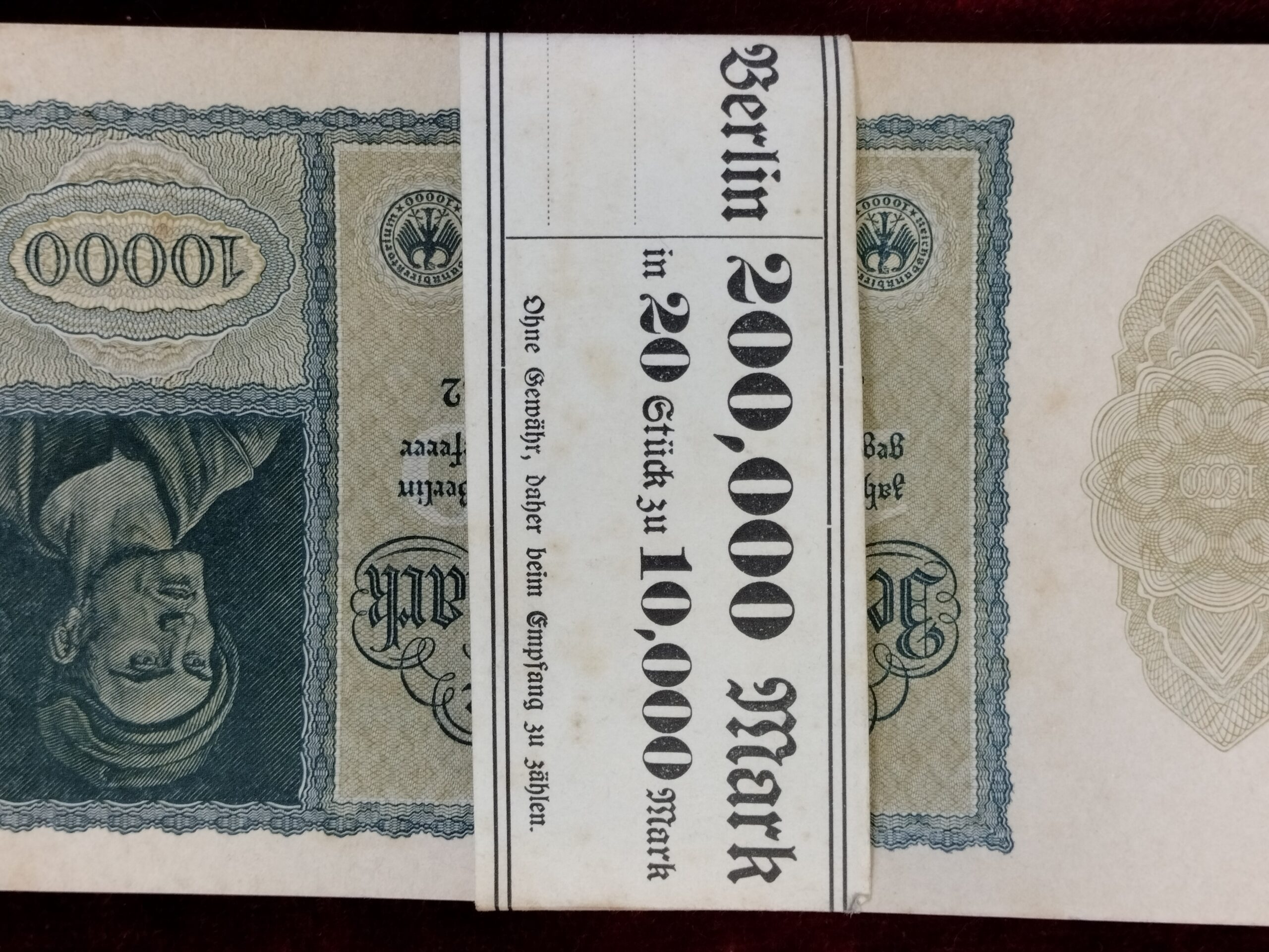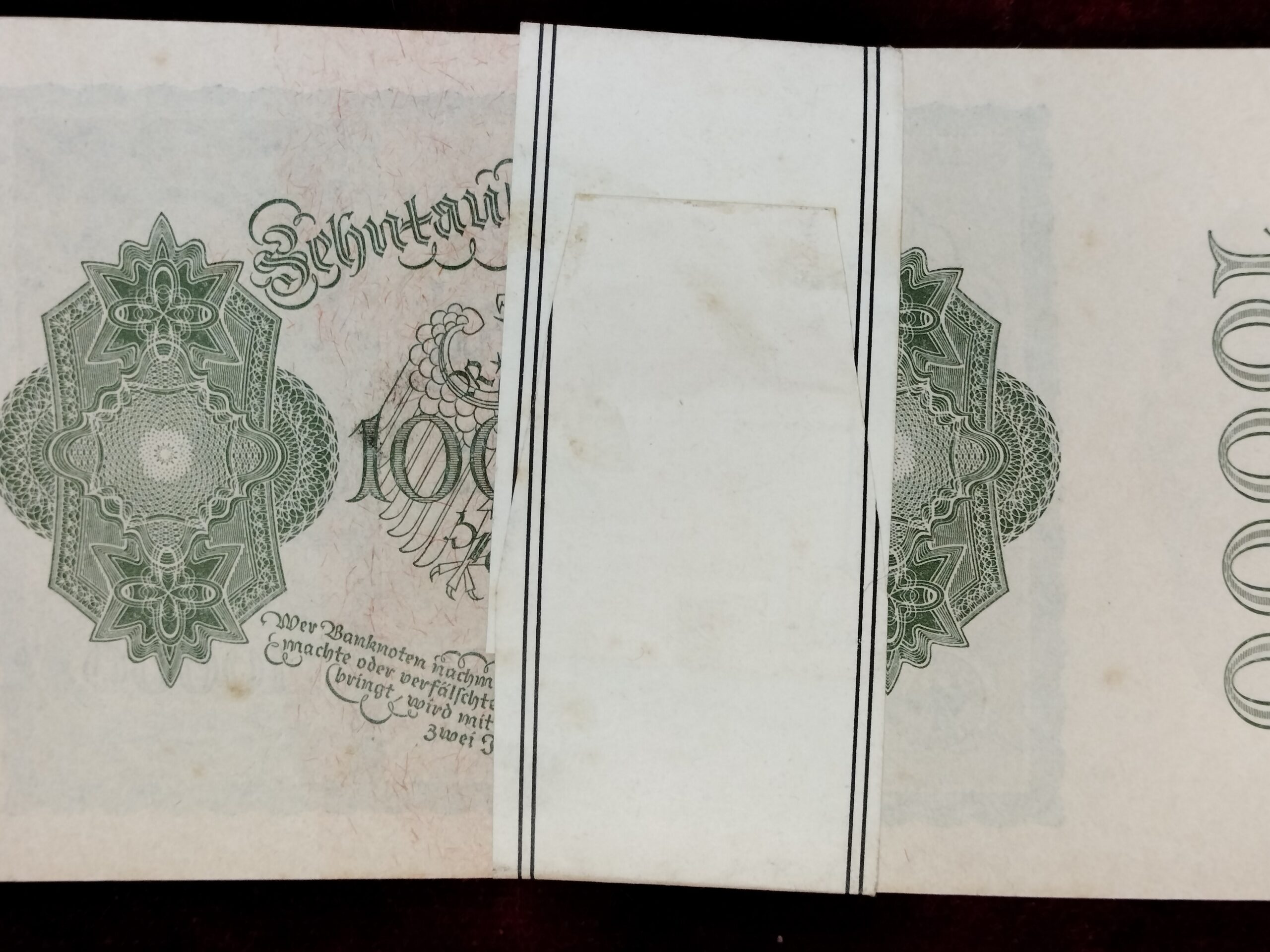 VER IMÁGENES PARA COMPROBAR EL ESTADO REAL. LAS IMÁGENES FORMAN PARTE DE LA DESCRIPCIÓN. COLECCIÓN DE BILLETES ALEMANES DE LA REPÚBLICA DE WEIMAR. SE INCLUYE UN BILLETE GRANDE (21 X 12,5) Y UN FAJO DE BILLETES SIN CIRCULAR (18,3 X 10,2) DE 200.000 MARKS EN TOTAL. ACUÑADOS EN BERLÍN. SE CONSERVA EL PRECINTO. BUEN ESTADO GENERAL, VER IMÁGENES.