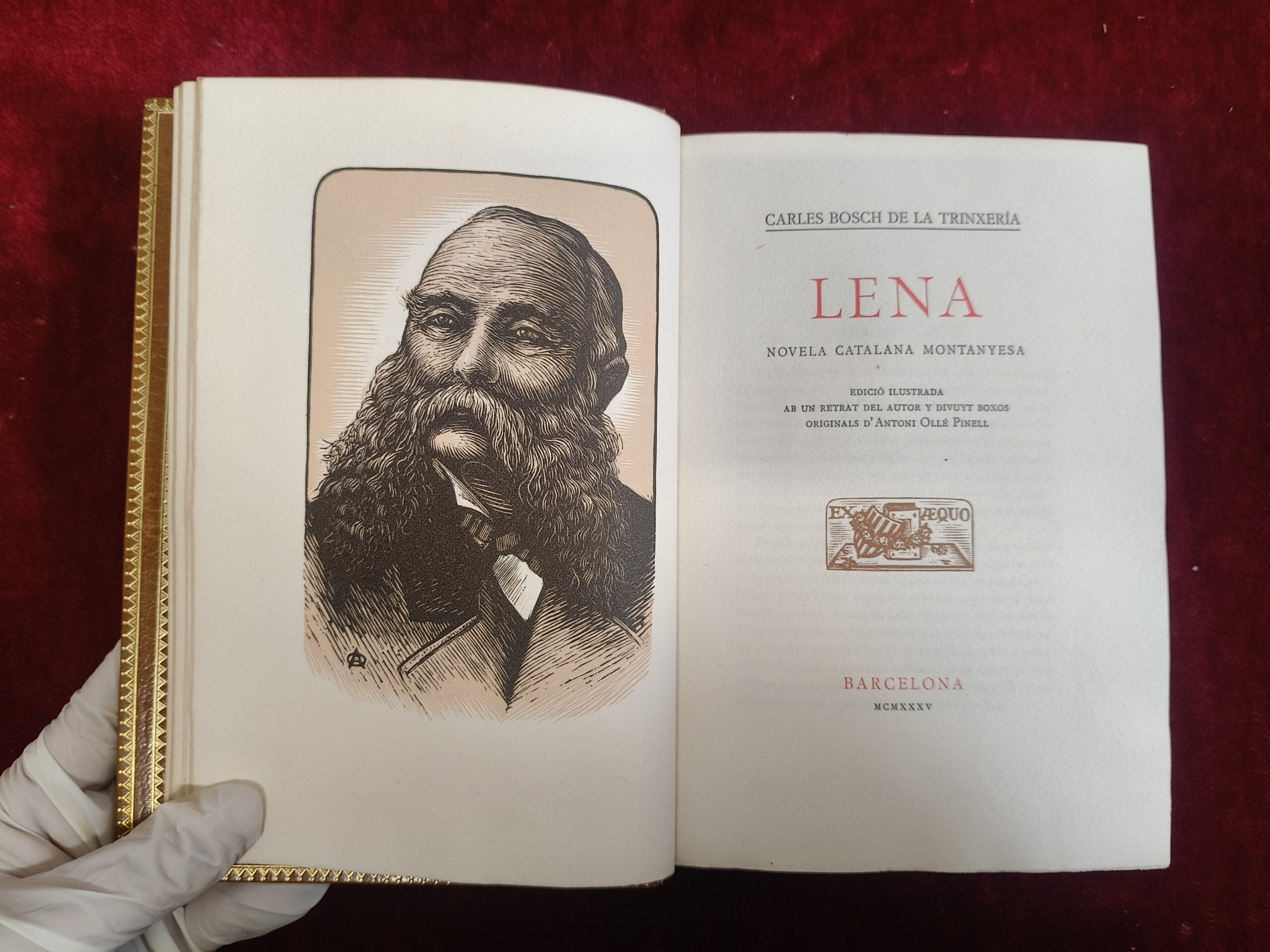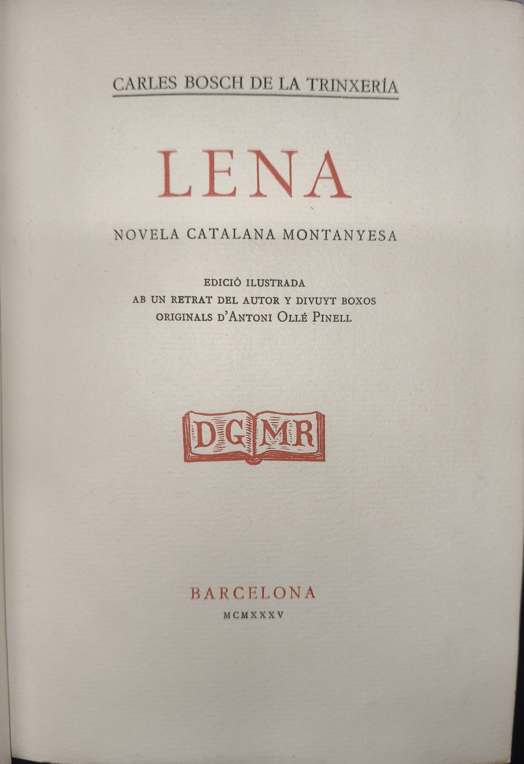 VER IMÁGENES PARA COMPROBAR EL ESTADO REAL.  LAS IMÁGENES FORMAN PARTE DE LA DESCRIPCIÓN. «LENA. NOVELA CATALANA MONTANYESA» ES UNA NOVELA ESCRITA POR CARLES BOSCH DE LA TRINXERIA.  PUBLICADA ORIGINALMENTE EN 1894 (Y REEDITADA EN 1935 CON ILUSTRACIONES DE ANTONI OLLÉ PINELL) ESTA OBRA SE ENMARCA DENTRO DE LA LITERATURA CATALANA DE FINALES DEL SIGLO XIX Y PRINCIPIOS DEL XX. NARRA LA HISTORIA DE LENA Y SE SUMERGE EN EL ENTORNO RURAL Y LAS TRADICIONES DE LA ÉPOCA, OFRECIENDO UN RETRATO DETALLADO DE LA SOCIEDAD Y EL PAISAJE DE LA MONTAÑA CATALANA 368 PAGINAS EDICIÓN NÚMERADA DE 125 EJEMPLARES EN PAPEL FIL EJEMPLAR N.º33 DESTINADO A RICARD VIÑAS GEIS. IDIOMA CATALÁN. ENCUADERNACION BRUGALLA, CON FIRMA DEL ENCUADERNADOR.