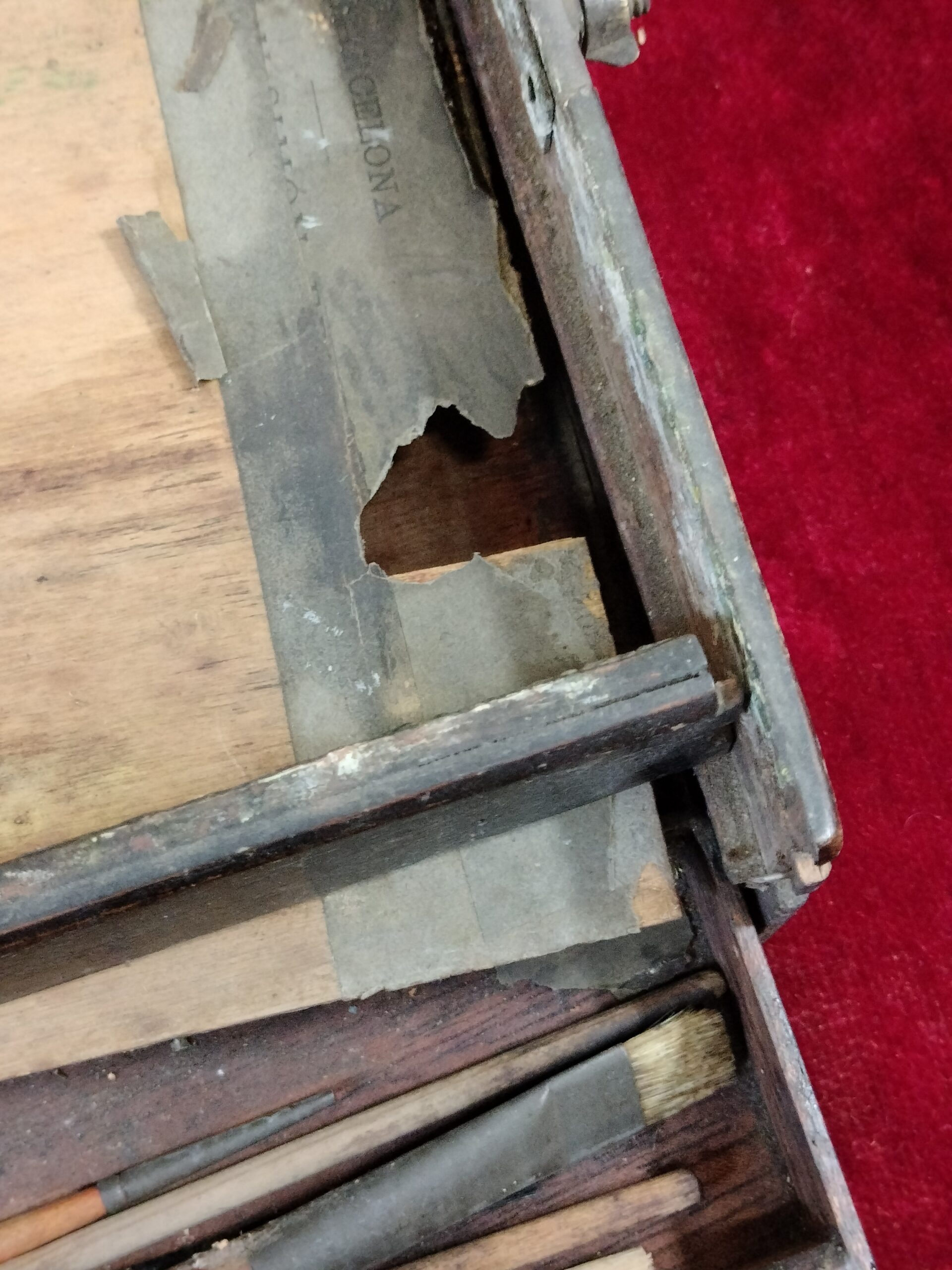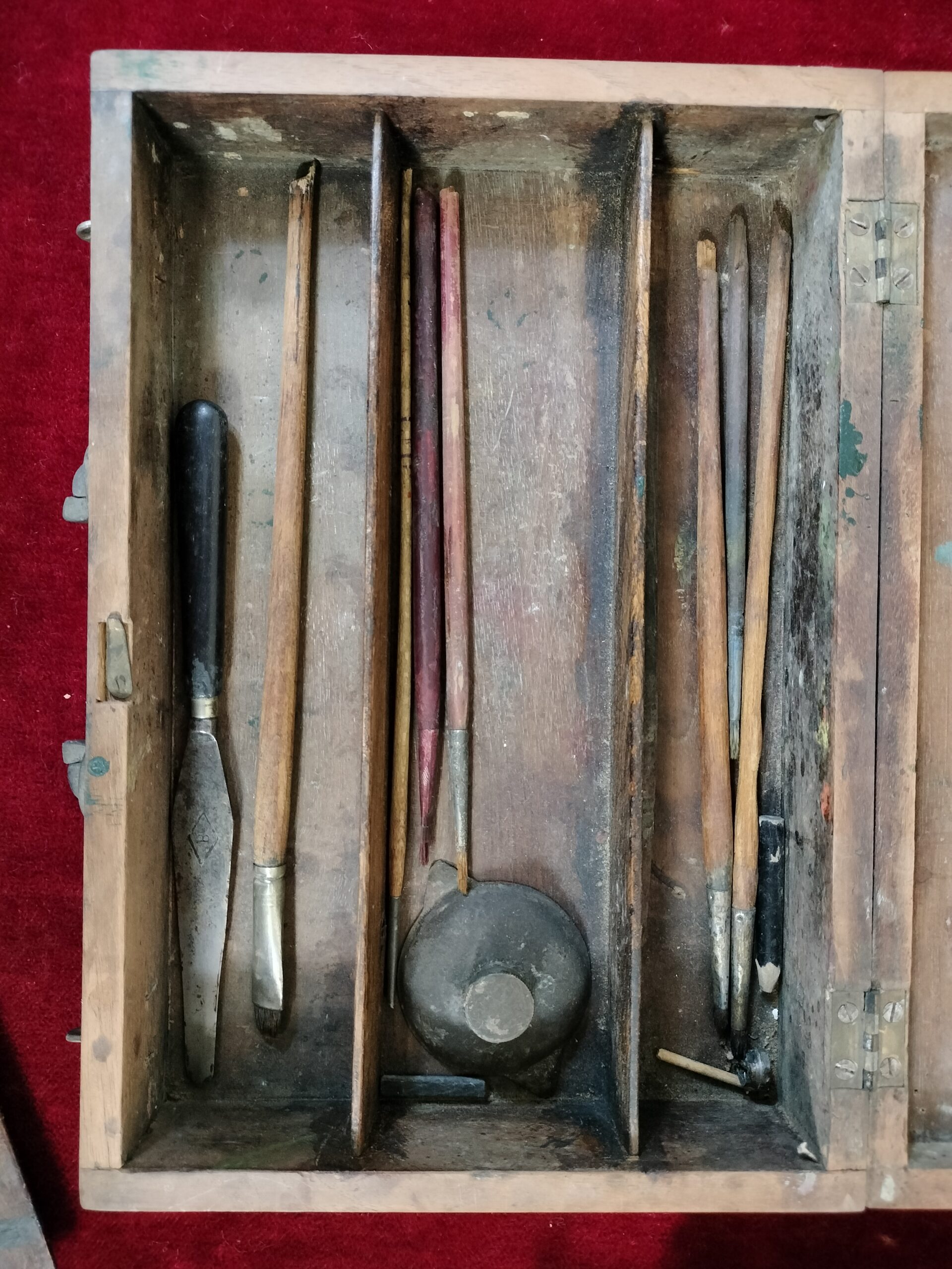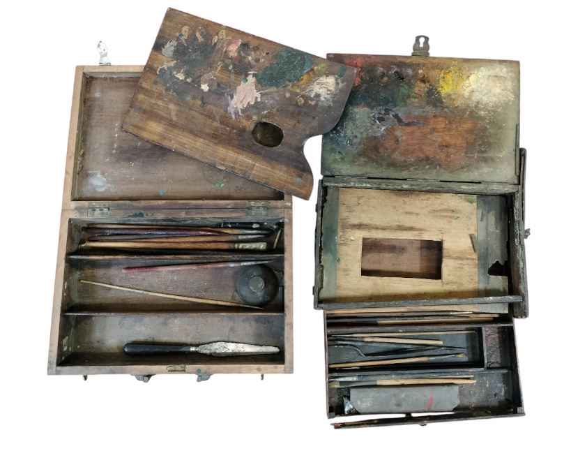 VER IMÁGENES PARA COMPROBAR EL ESTADO REAL.  LAS IMÁGENES FORMAN PARTE DE LA DESCRIPCIÓN.  LOTE DE HERRAMIENTAS DE PINTOR.  INCLUYE DOS ESTUCHES DE MADERA, CON NOTABLES ROTURAS.  PINCELES, PALETA, ETC.  RESTOS DE PINTURA, DESGASTES, SEÑALES DE USO.  MEDIDAS APROX:  ESTUCHE GRANDE: 20 X 29,5 X 7 CM.  ESTUCHE PEQUEÑO: 16,5 X 25,2 X 6 CM.  PALETA: 27 X 18 CM.