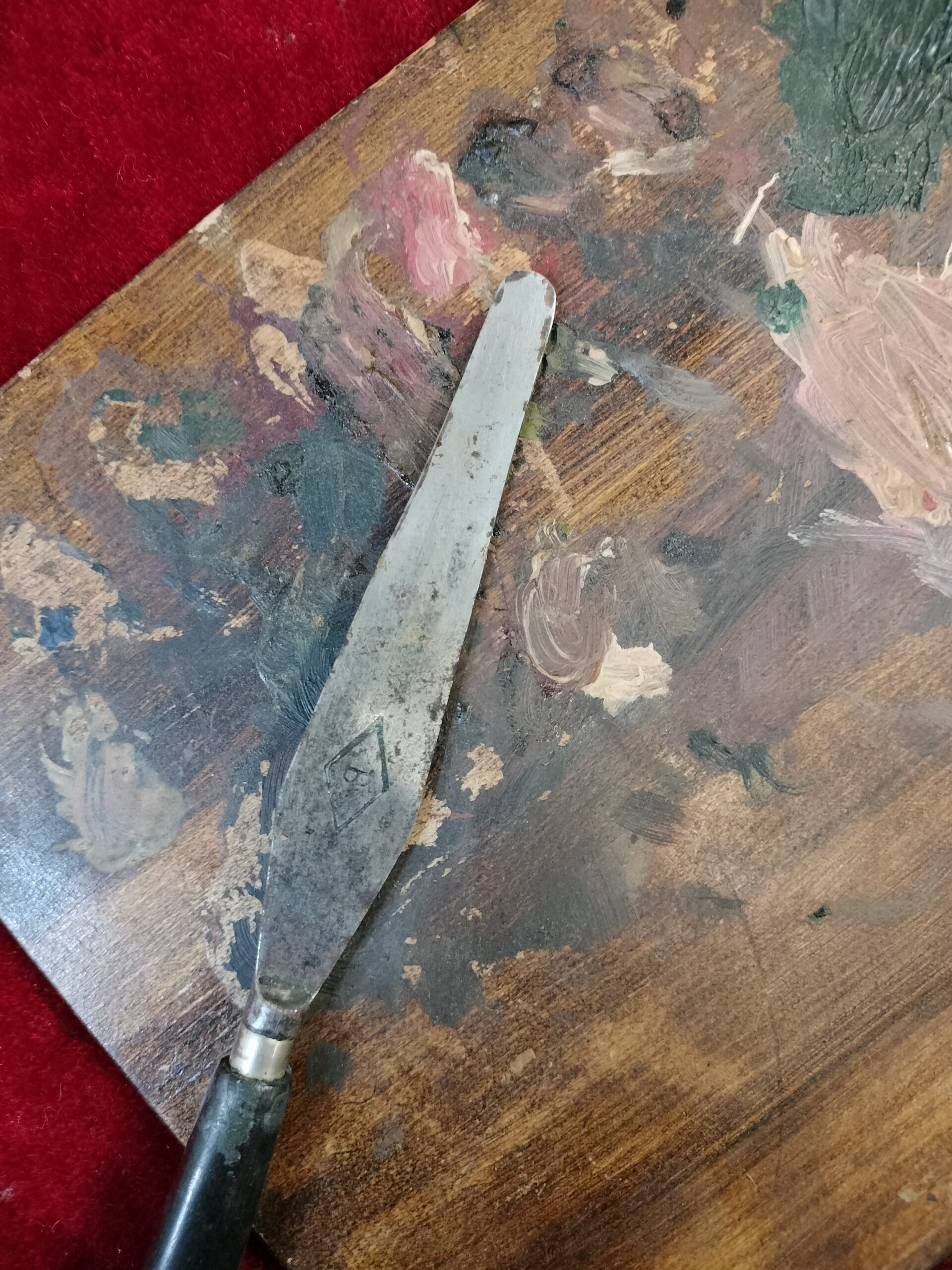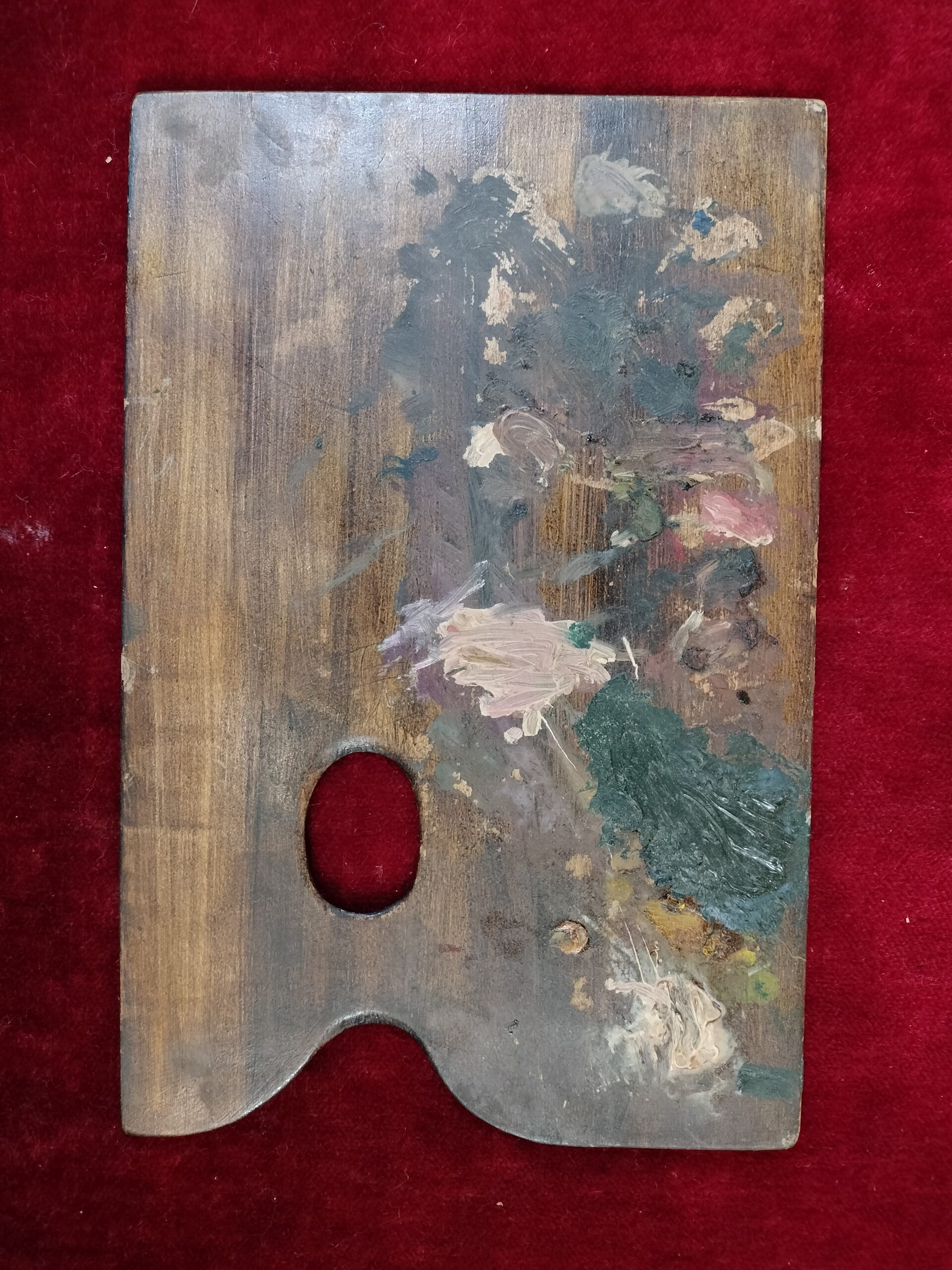 ANTIGUA PALETA Y HERRAMIENTAS DE PINTOR. MADERA. ESPAÑA. SIGLO XIX.