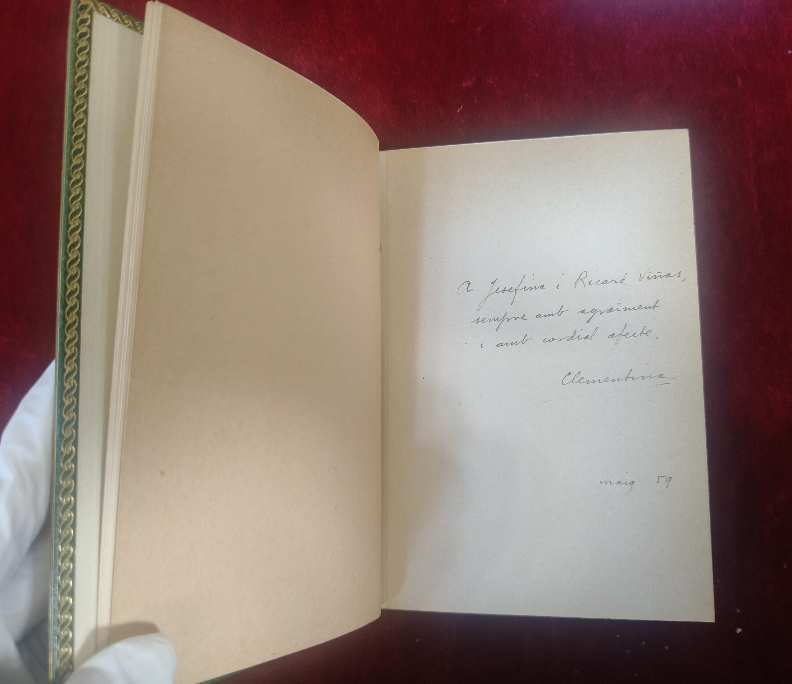 ÉS A DIR DE LA POETA CLEMENTINA ARDERIU ESTA OBRA ES ESPECIALMENTE RELEVANTE POR SU VÍNCULO CON JOAN FUSTER, QUIEN ESCRIBIÓ SU PRÓLOGO. ADEMÁS FUE UN AÑO SIGNIFICATIVO PARA LA AUTORA, YA QUE COINCIDIÓ CON LA MUERTE DE SU MARIDO, EL TAMBIÉN POETA CARLES RIBA LOS LIBROS DE LA OSA MENOR 17X12 CENTIMETROS. 53 PAGINAS, EN IDIOMA CATALÁN. EJEMPLAR EN BUENN ESTADO GENERAL, ENCUADERNACIÓN EN PIEL CON APLIQUES ES DORADO. DEDICADO Y ENEUMERADO.