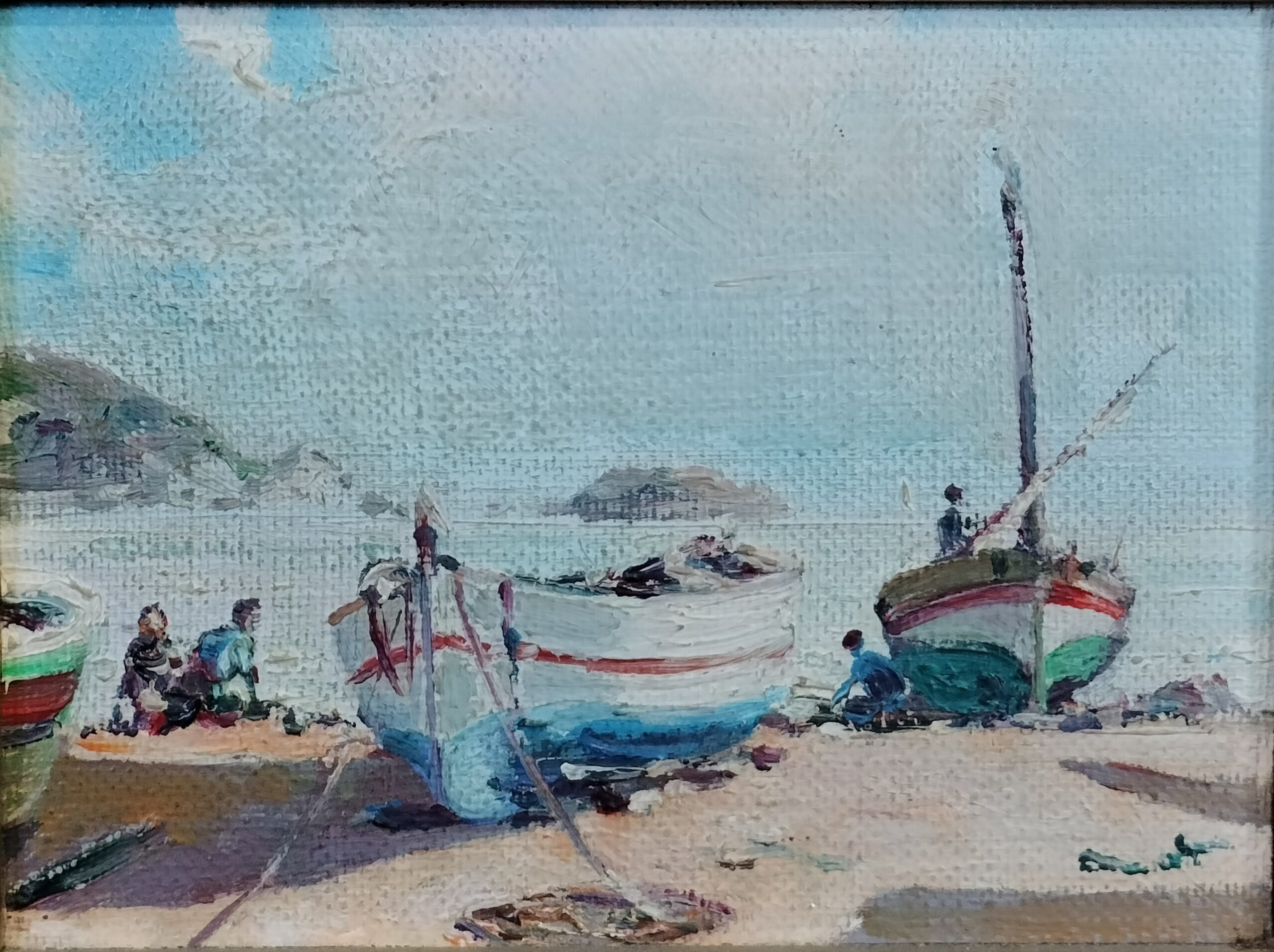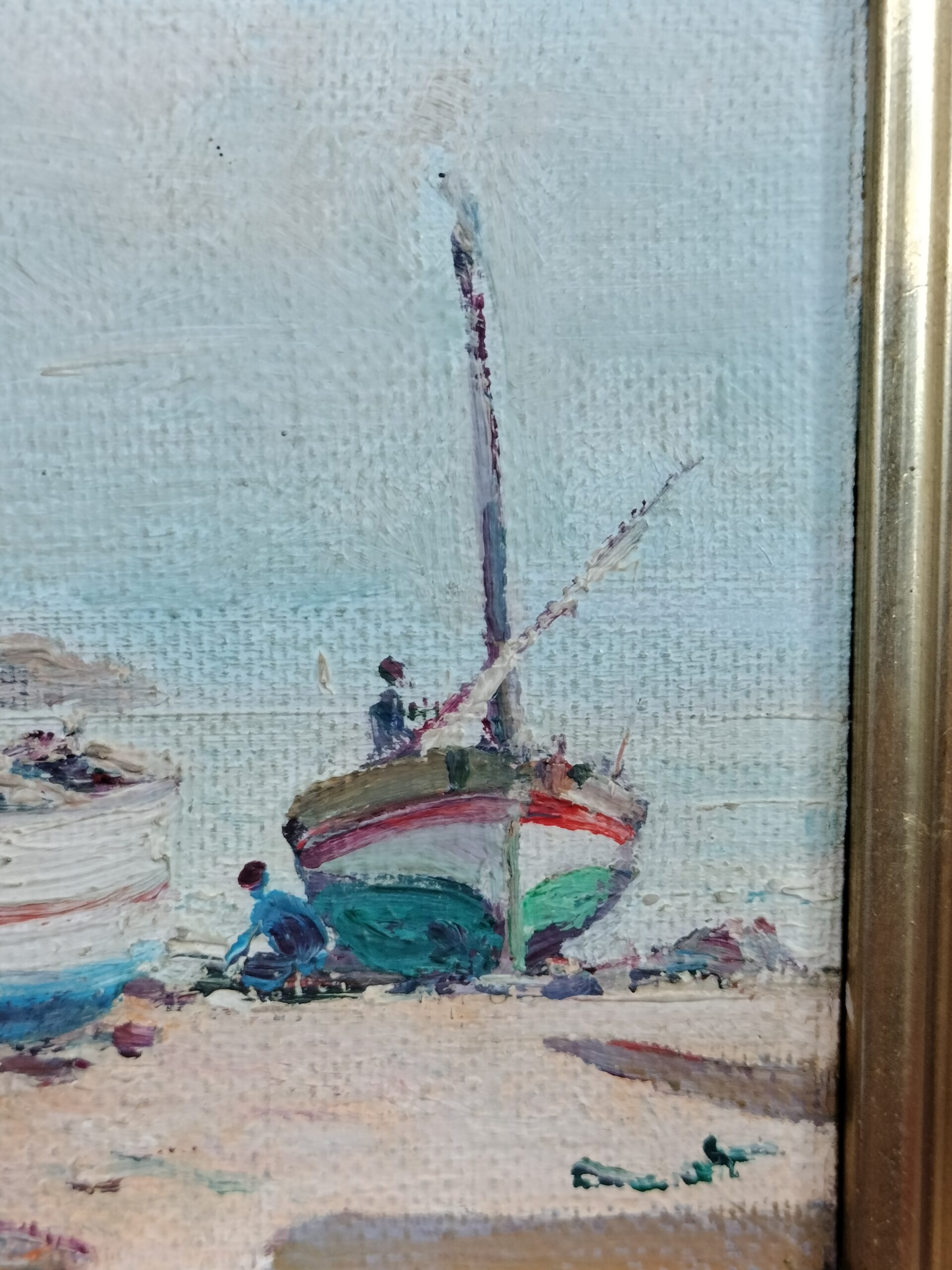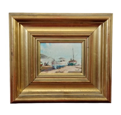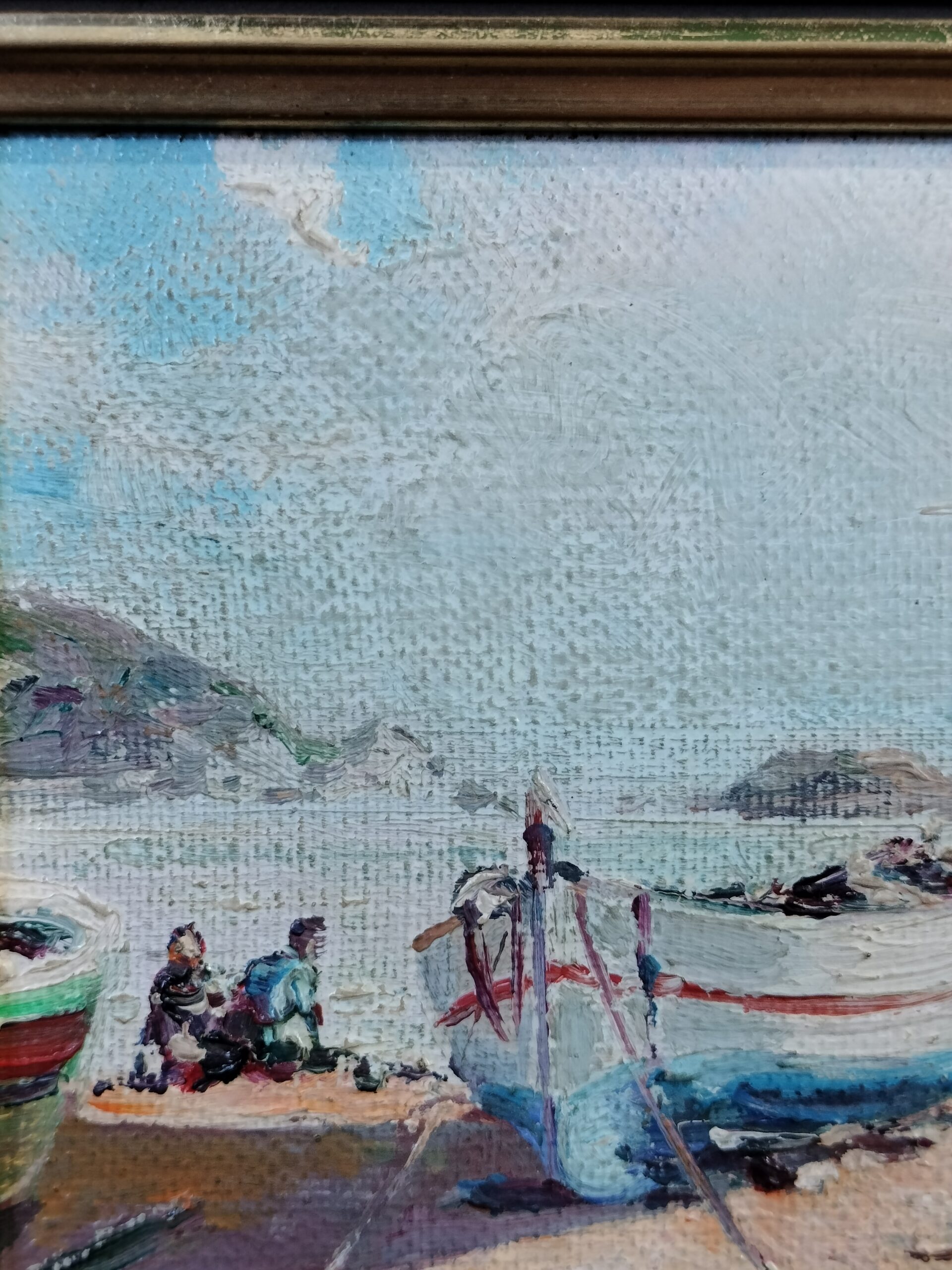 VER IMÁGENES PARA COMPROBAR EL ESTADO REAL.  LAS IMÁGENES FORMAN PARTE DE LA DESCRIPCIÓN.  MARINA CON BARCOS DE PESCA.  FIRMA ILEGIBLE EN LA ESQUINA INFERIOR DERECHA.  MARCO DE MADERA, CON LIGEROS DESGASTES. SIN VIDRIO PROTECTOR.  EL LIENZO PRESENTA LIGEROS RESTOS DE SUCIEDAD.  MEDIDAS:  MARCO: 28 X 25 X 2,5 CM.  PINTURA: 11,5 X 8,1 CM.