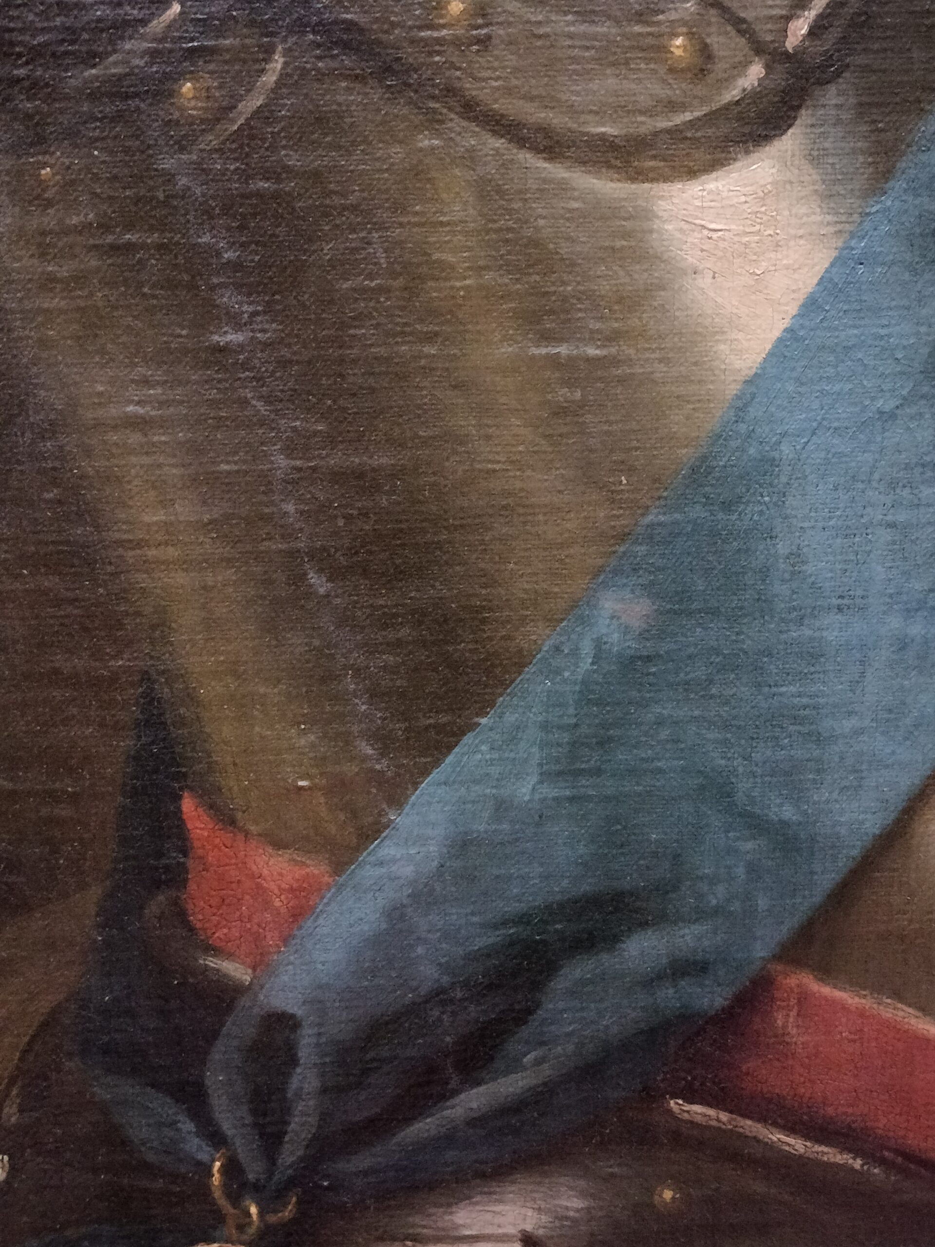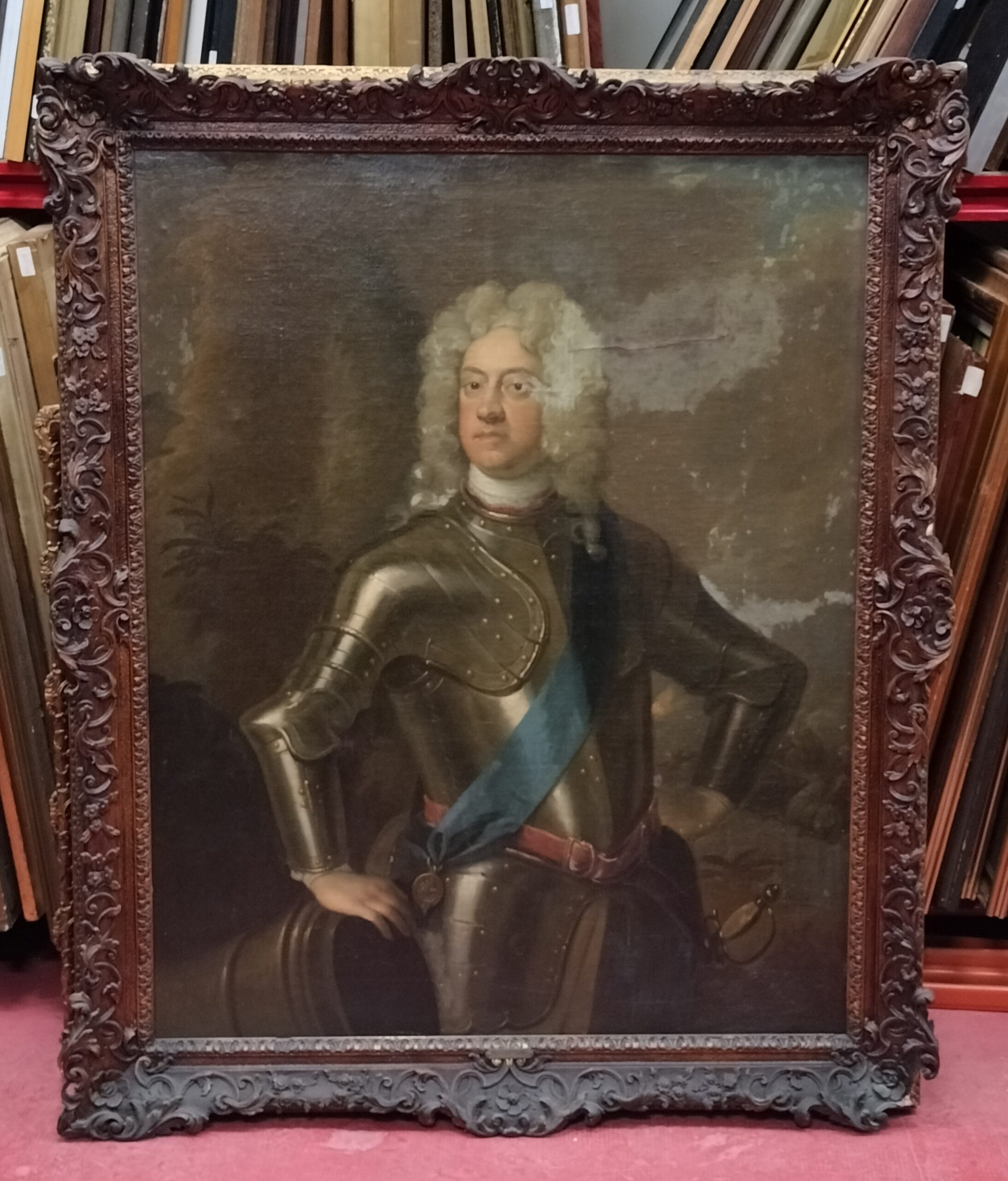 VER IMÁGENES PARA COMPROBAR EL ESTADO REAL.  LAS IMÁGENES FORMAN PARTE DE LA DESCRIPCIÓN.  RETRATO ARISTOCRÁTICO DEL REY JORGE I. ÓLEO SOBRE LIENZO. INGLATERRA. SIGLOS XVII-XVIII.  NO DISPONEMOS DE CERTIFICADO DE AUTENTICIDAD. LA ETIQUETA POSTERIOR ATRIBUYE LA OBRA A GODFREY KNELLER.  MARCO EN MADERA ORNAMENTADO CON MOTIVOS FLORALES. PRESENTA VARIOS DESGASTES Y PEQUEÑAS ROTURAS DEBIDO AL TIEMPO.  SIN VIDRIO PROTECTOR.  SIN FIRMA APARENTE.  ESTILO BARROCO-REALISTA INGLÉS.  EL RETRATO PRESENTA VARIAS FRACTURAS Y LIGERO CRAQUELADO. EN LA PARTE DERECHA SE APRECIAN MANCHAS BLANQUECINAS QUE PODRIAN SER RESULTADO DE RESTAURACIONES PREVIAS.  MEDIDAS APROXIMADAS:  MARCO: 123 X 147 X 9 CM.  PINTURA: 99 X 124 CM.   NOTA HISTÓRICA:  Godfrey Kneller, originalmente Gottfried Kniller (Lübeck, 1646 – Londres, 1723), fue un pintor, dibujante, acuarelista y miniaturista nacido en el Sacro Imperio Romano Germánico y establecido posteriormente en la capital inglesa. Se convirtió en el retratista barroco más importante de Inglaterra a finales del siglo XVII y comienzos del XVIII. Hijo de Zacharias Kniller (1611–1675), también pintor de retratos, Godfrey Kneller nació en la Ciudad Libre de Lübeck. Aunque en un principio estaba destinado a seguir la carrera militar, optó por estudiar matemáticas en la Universidad de Leiden. Con el tiempo, su interés se orientó hacia el arte, lo que lo llevó a trasladarse a Ámsterdam para formarse con Ferdinand Bol, discípulo de Rembrandt van Rijn. Más adelante, viajó a Italia junto a su hermano Johann Zacharias Kneller (1672), pasando por Roma y Venecia, donde estudió con Carlo Maratta y Gian Lorenzo Bernini. Tras completar su formación artística, Kneller y su hermano se dirigieron a Inglaterra. Allí, gracias al mecenazgo del duque de Monmouth, Kneller comenzó a trabajar como pintor de la corte para varios reyes ingleses. Entre 1711 y 1716 ocupó el cargo de director de la primera academia de pintura y dibujo de Inglaterra, situada en Great Queen Street (Londres), puesto en el que fue sucedido por James Thornhill. En Londres, Kneller estableció un estudio-taller con un amplio equipo de ayudantes especializados, muchos de ellos extranjeros —principalmente flamencos e italianos—, organizados para producir retratos en gran cantidad de acuerdo con los dictados de la moda del momento. Además de retratar a figuras británicas, Kneller pintó a otros diez monarcas europeos, entre ellos Luis XIV de Francia, así como a numerosas personalidades célebres de su época. En la actualidad, su obra es considerada una de las grandes referencias de la colección de pintura británica de la Tate Gallery de Londres.