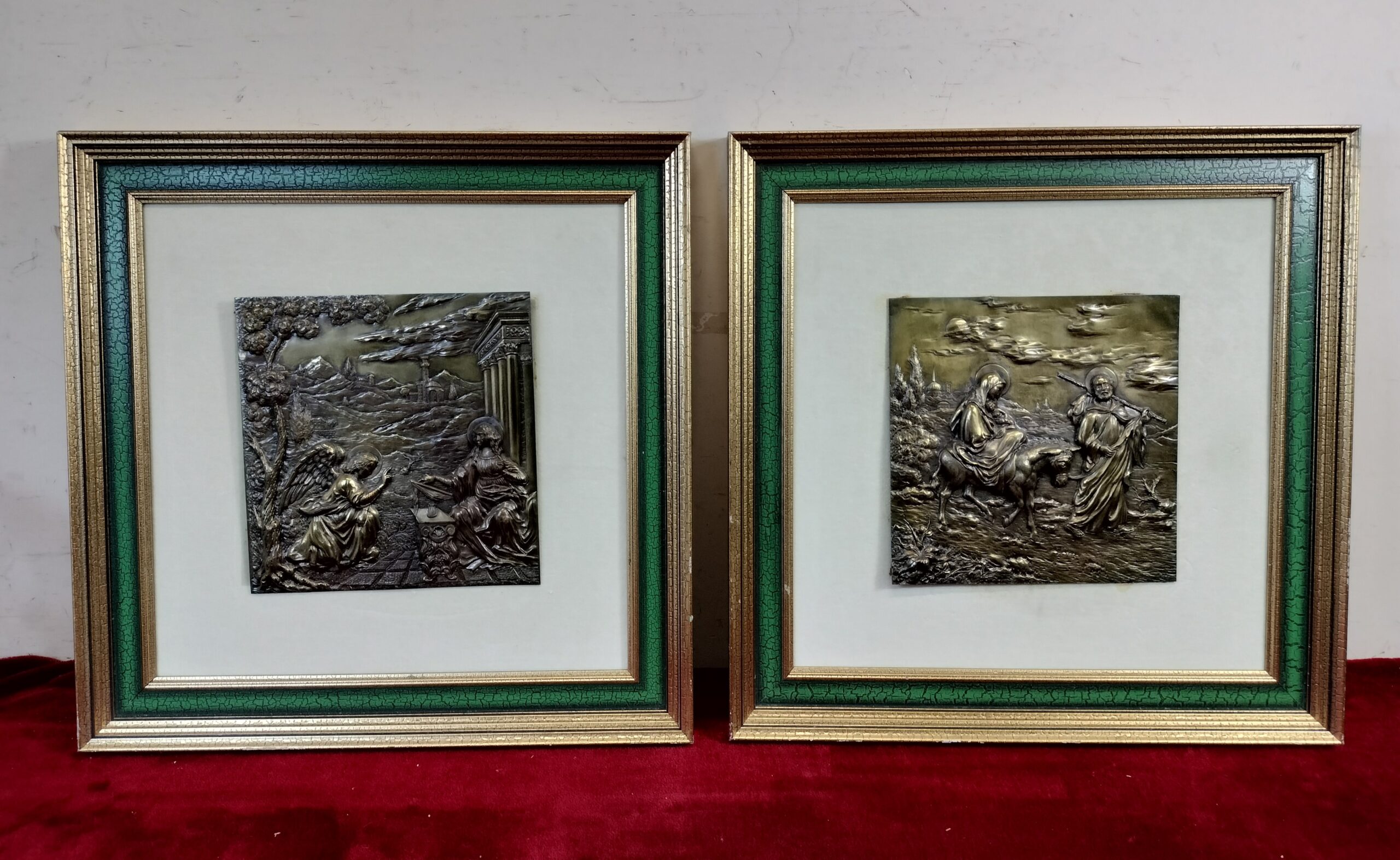 VER IMÁGENES PARA COMPROBAR EL ESTADO REAL.  LAS IMÁGENES FORMAN PARTE DE LA DESCRIPCIÓN.  PAREJA DE BAJORRELIEVES CON ESCENAS DEL NUEVO TESTAMENTO.  ELABORADAS CONFORME MODELOS PICTÓRICOS RENACENTISTAS.  SIN FIRMA NI MARCA DE AUTOR APARENTE.  MARCOS EN MADERA DORADA Y CON FRANJAS DE COLOR VERDE.  PLANCHAS DE COBRE, UNA DESPRENDIDA DEL MARCO.  EN BUEN ESTADO GENERAL, VER IMÁGENES EN DETALLE.  MEDIDAS APROXIMADAS:  MARCO: 46,5 X 47 CM.  PLANCHA: 22,5 X 22 CM.