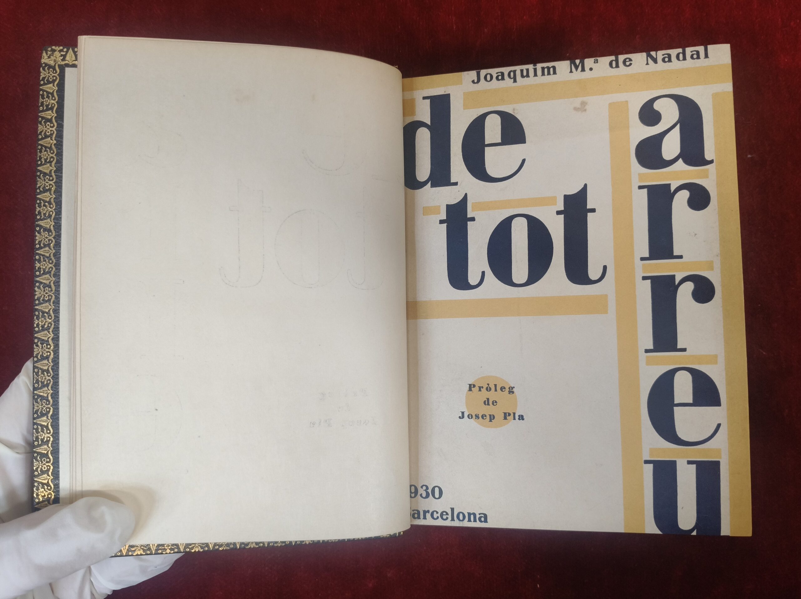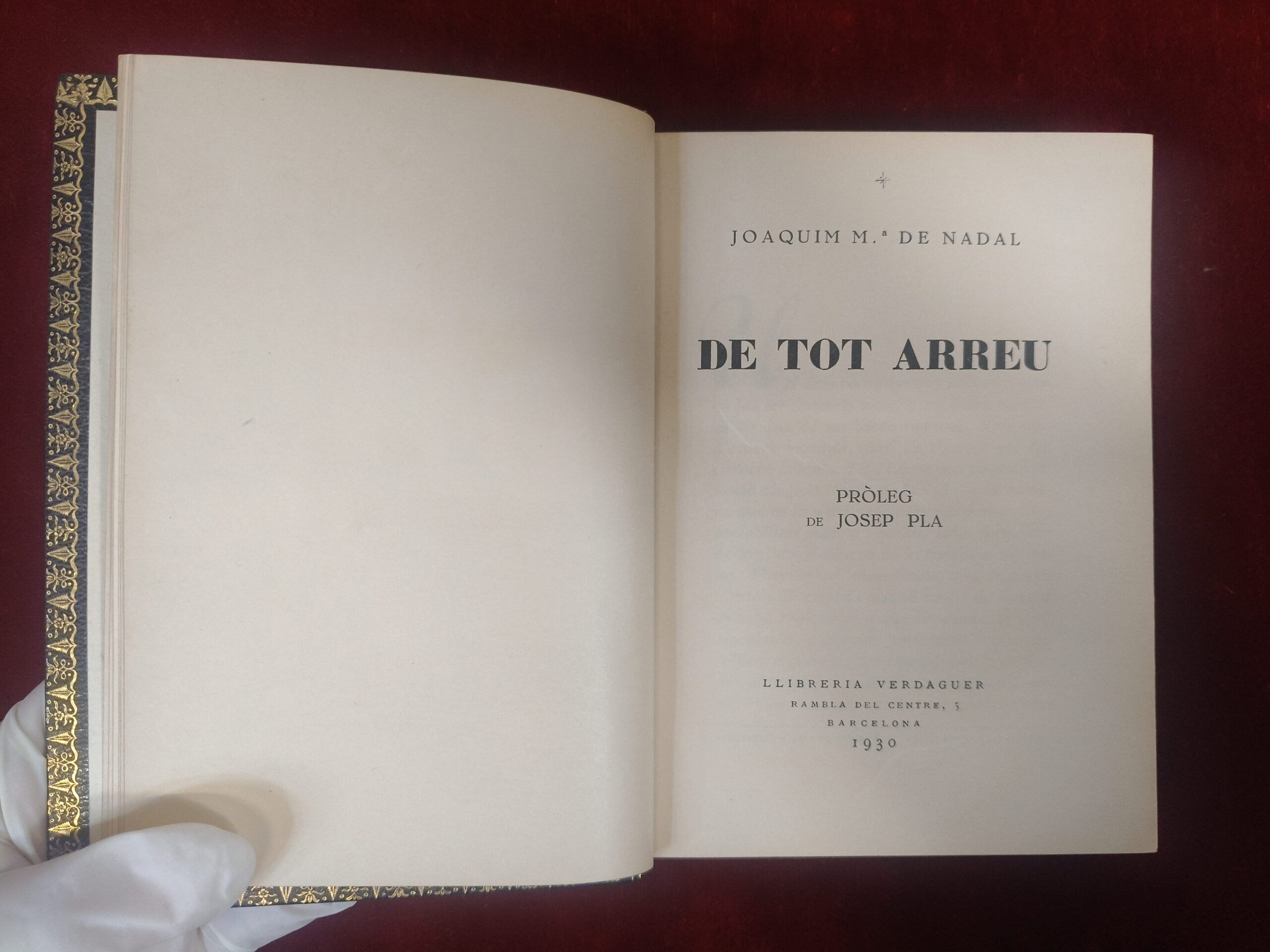 VER IMÁGENES PARA COMPROBAR EL ESTADO REAL. LAS IMÁGENES FORMAN PARTE DE LA DESCRIPCIÓN. DE TOT ARREU. JOAQUIM MARIA NADAL 1930, PROLOGO DE JOSEP PLA. ES UNA DE LAS OBRAS MÁS DESTACADAS DEL ESCRITOR, PERIODISTA Y POLÍTICO CATALÁN JOAQUIM MARIA DE NAVIDAD Y HERRERO. ESTA PUBLICACIÓN SE ENMARCA EN EL GÉNERO DE LA CRÓNICA Y EL COSTUMISMO, OFRECIENDO UNA VISIÓN DETALLADA DE LA VIDA SOCIAL Y CULTURAL DE LA ÉPOCA LIBRERIA VERDAGUER. 175 PAGINAS 17X13 CENTIMETROS EN CUADERNACIÓN DE LUJO EN PIEL. PAGINAS EN PAPEL DE FIL. EJEMPLAR Nº 4 DE UN TOTAL DE 25 EJEMPLARES.