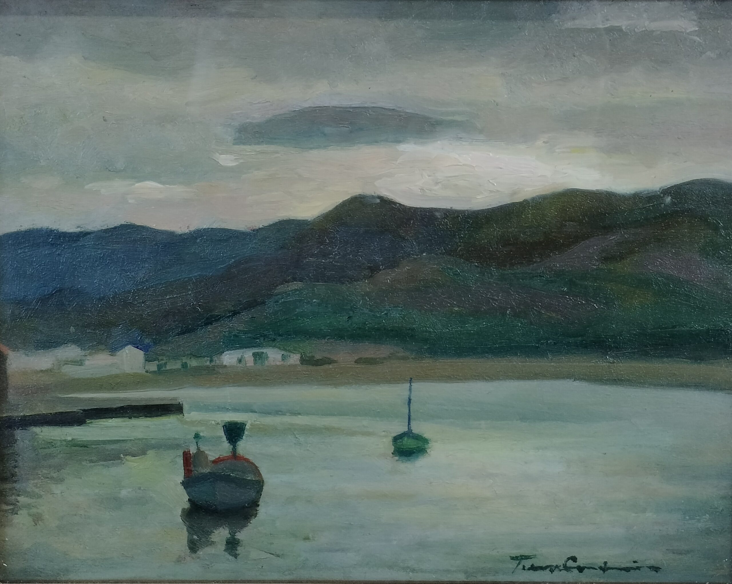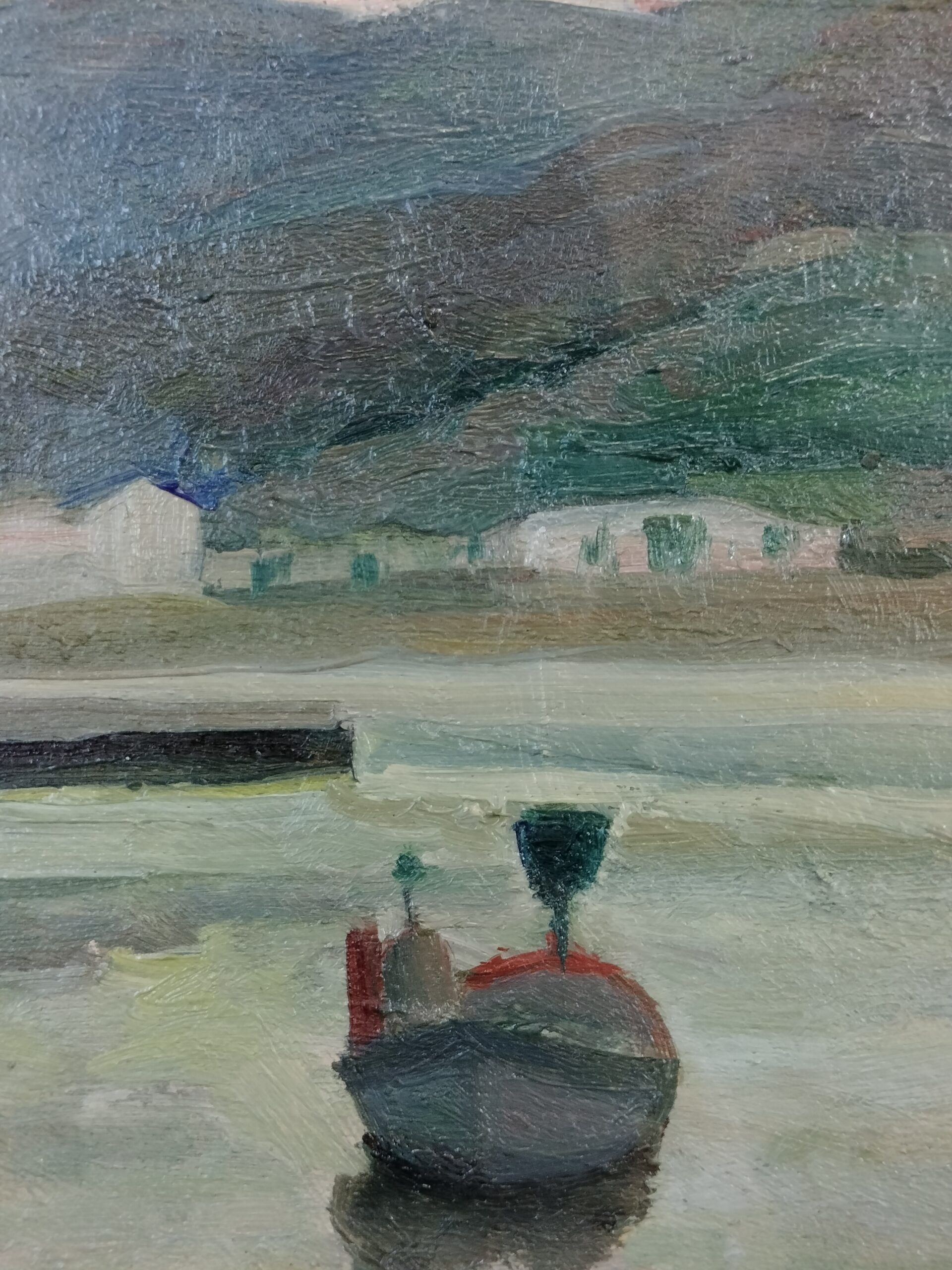 MARINA CON BARCOS DE PESCA. FIRMA ILEGIBLE. ÓLEO SOBRE TABLA. ESPAÑA. SIGLO XX.
