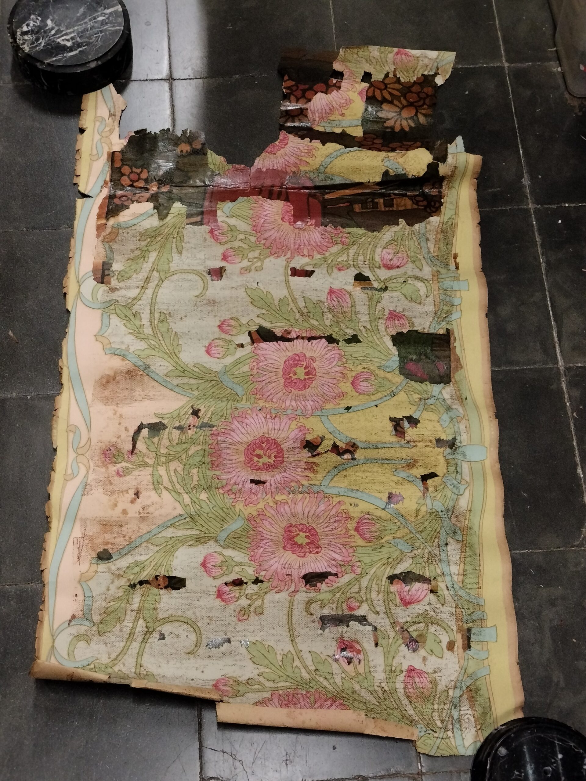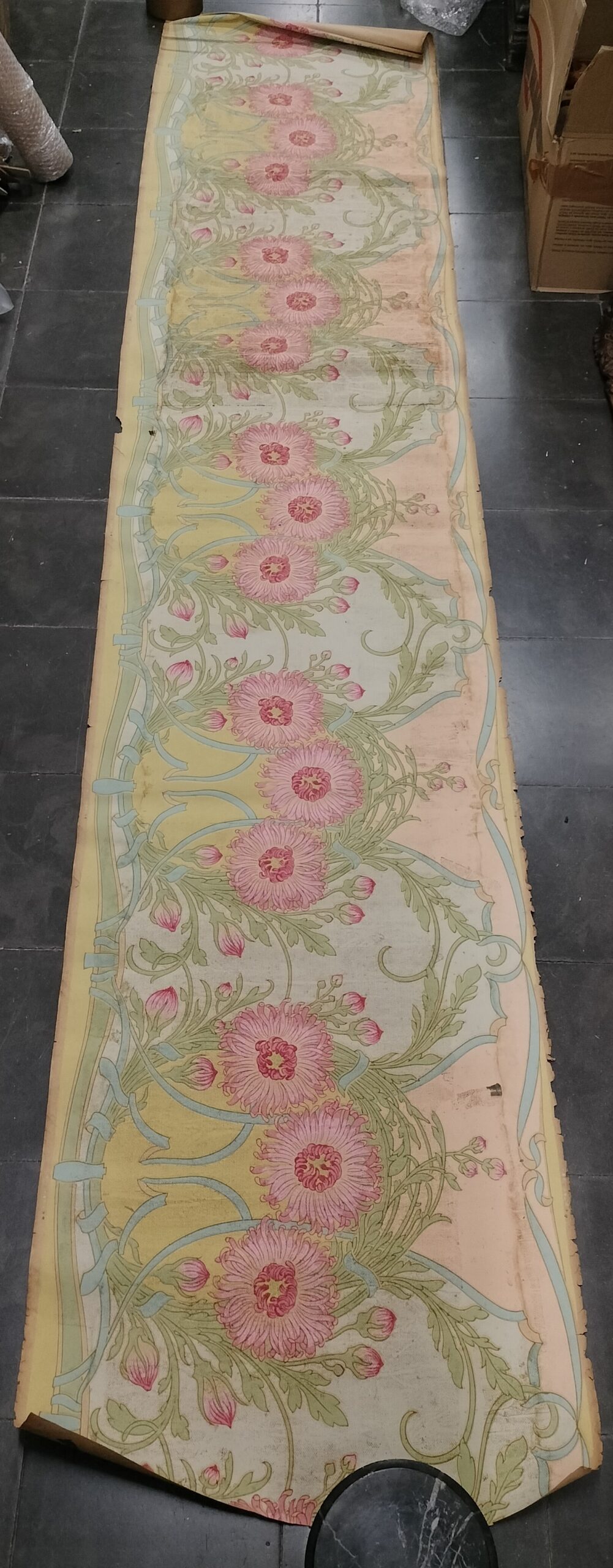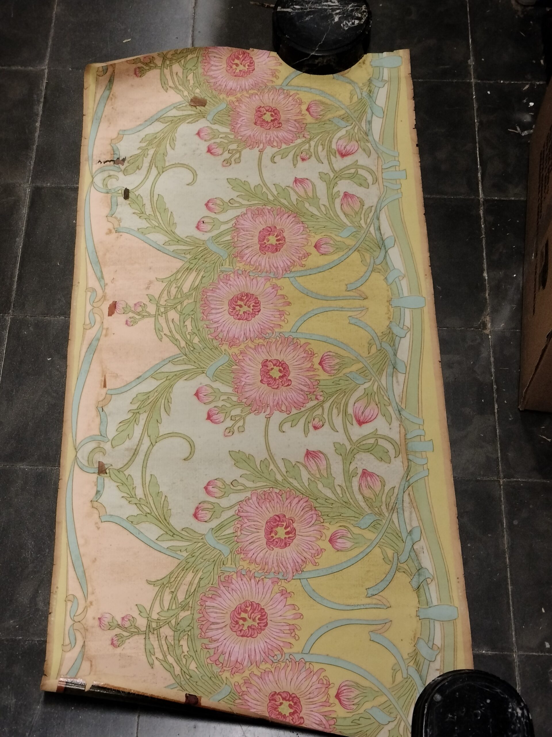 VER IMÁGENES PARA COMPROBAR EL ESTADO REAL. LAS IMÁGENES FORMAN PARTE DE LA DESCRIPCIÓN. CONJUNTO DE FRAGMENTOS DE PAPEL DE PARED CON MOTIVOS FLORALES. ESTILO ART NOUVEAU, SEGURAMENTE LITOGRAFÍA O WOODBLOCK PRINTING. SE TRATA DE UN PAPEL UTILIZADO A FINALES DEL SIGLO XIX Y INICIOS DEL XX PARA LA DECORACIÓN DE INTERIORES BURGUESES Y COMERCIALES. DISEÑO DIBUJADO A MANO Y TRANSFERIDO A MATRICES. SIN FIRMA DE AUTOR. NOTABLES DESGASTES. PRESENTA MANCHAS DE OXIDACIÓN Y ENVEJECIMIENTO. DESGARROS Y PÉRDIDAS, SUCIEDAD SUPERSTICIAL. SE TRATA DE UN PAPEL ESTRUCTURALMENTE FRÁGIL, CON UNA IMPORTANTE PÉRDIDA DEL REVESTIMIENTO DEL REVERSO. SE INCLUYEN TRES ROLLOS: EL MÁS LARGO MIDE 57 X 276 CM. LOS DOS RESTANTES SON MÁS PEQUEÑOS: 57 X 116 CM / 57 X 105 CM.