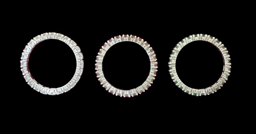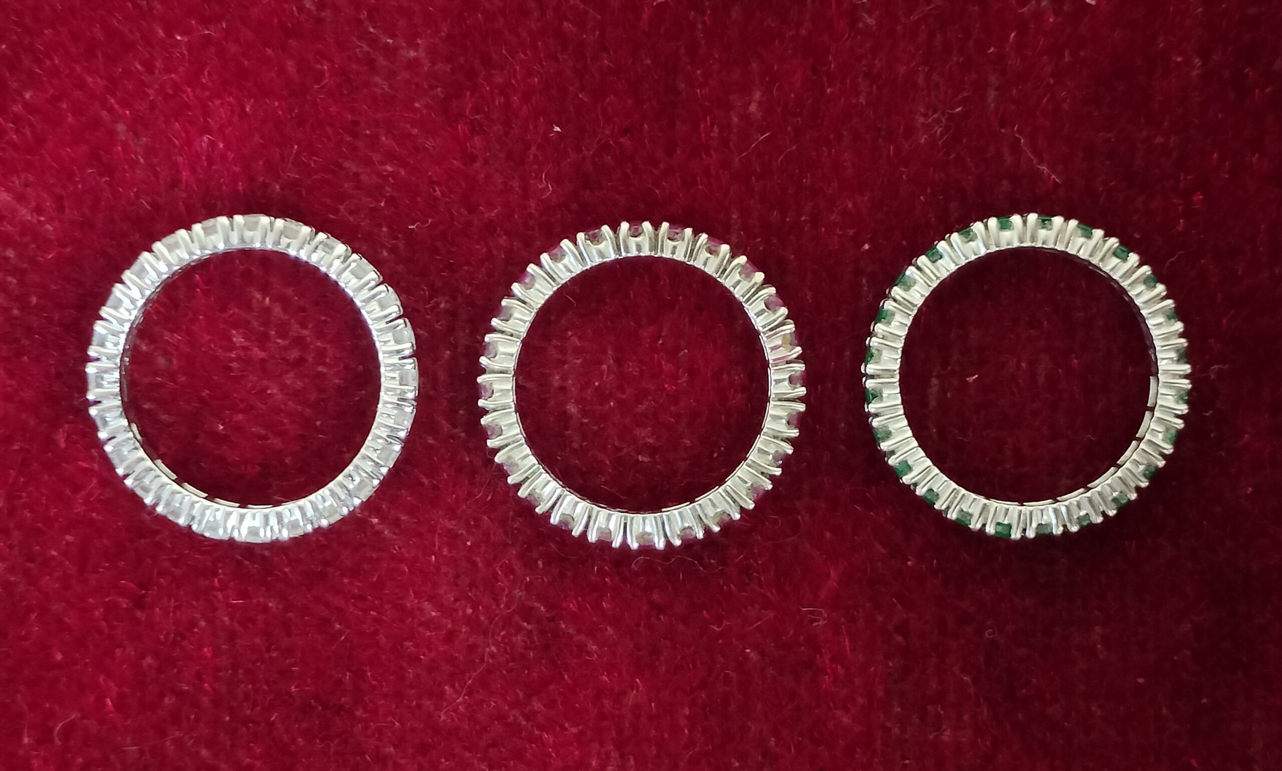 TRES ANILLOS O ALIANZAS DE ETERNIDAD. PLATA Y RUBÍES, ESMERALDAS Y BRILLANTES. EUROPA. XX.