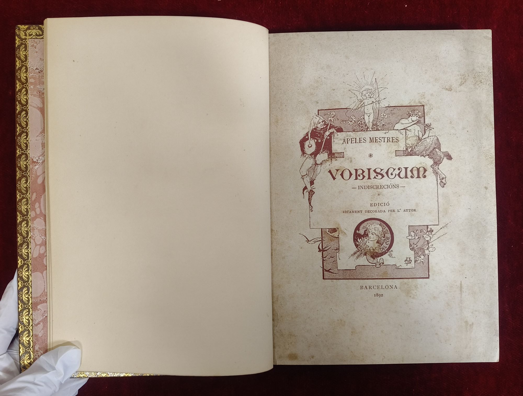 VER IMÁGENES PARA COMPROBAR EL ESTADO REAL.  LAS IMÁGENES FORMAN PARTE DE LA DESCRIPCIÓN. «VOBISCUM» ES UN LIBRO DE POESÍA ESCRITO POR EL AUTOR CATALÁN APELES MESTRE, PUBLICADO EN 1892 BAJO EL TÍTULO COMPLETO «VOBISCUM INDISCRECIONS» ESTA OBRA, A MENUDO ILUSTRADA POR EL PROPIO AUTOR, ES UN EJEMPLO DEL MODERNISMO CATALÁN QUE COMBINA VERSOS LÍRICOS CON REFLEXIONES ÍNTIMAS Y DECORACIONES MINUCIOSAS. ES UNA OBRA VALORADA POR COLECCIONISTAS DE LIBROS ANTIGUOS DE POESÍA. LA OBRA REFLEJA EL ESTILO SENSIBLE Y DELICADO DE MESTRES, CONOCIDO POR SU PROLÍFICA PRODUCCIÓN ARTÍSTICA A FINALES DEL SIGLO XIX. PUBLICADO EN BARCELONA POR LA TIPO-LITOGRAFIA DE ESPASA Y CA. ENCUADERNACIÓN DE LUJO EN PIEL. 23X15X1