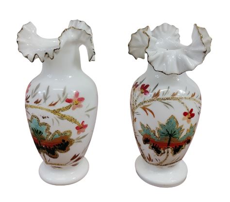 PAREJA DE JARRONES DE OPALINA BLANCOS. OPALINA Y DECORACIÓN PINTADA A MANO. ESPAÑA. SIGLO XIX.
