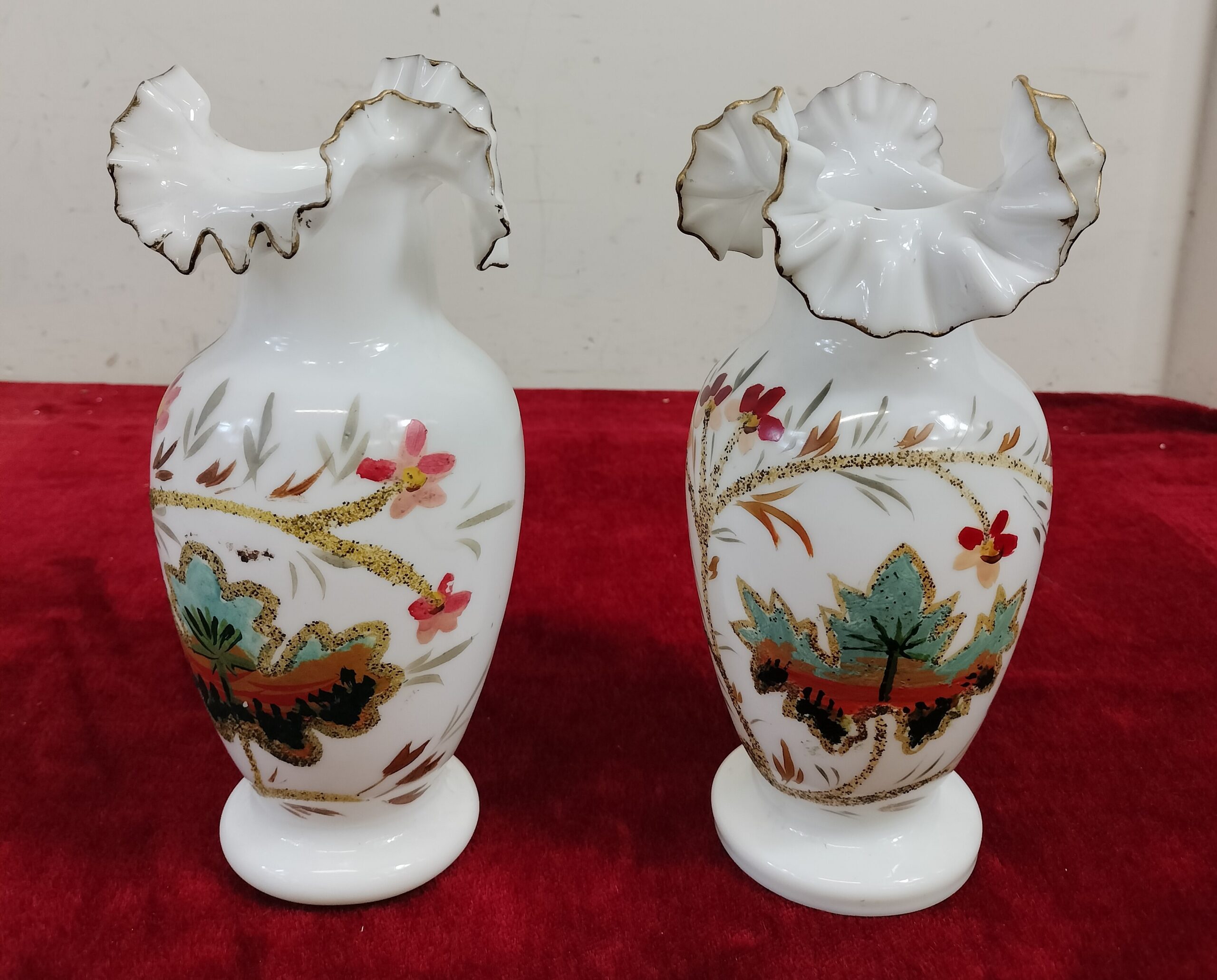 VER IMÁGENES PARA COMPROBAR EL ESTADO REAL. LAS IMÁGENES FORMAN PARTE DE LA DESCRIPCIÓN. PAREJA DE JARRONES DE OPALINA. OPALINA Y DECORACIÓN PINTADA A MANO, CON PAISAJES Y PALMERAS. SIN FIRMA NI MARCA DE AUTOR. LA DECORACIÓN PINTADA PRESENTA RELIEVE. CON LIGEROS DESGASTES Y PEQUEÑAS PARTES DE PINTURA PERDIDAS. MEDIDAS: BASE: 8 X 8 CM. 22,5 CM ALTO.