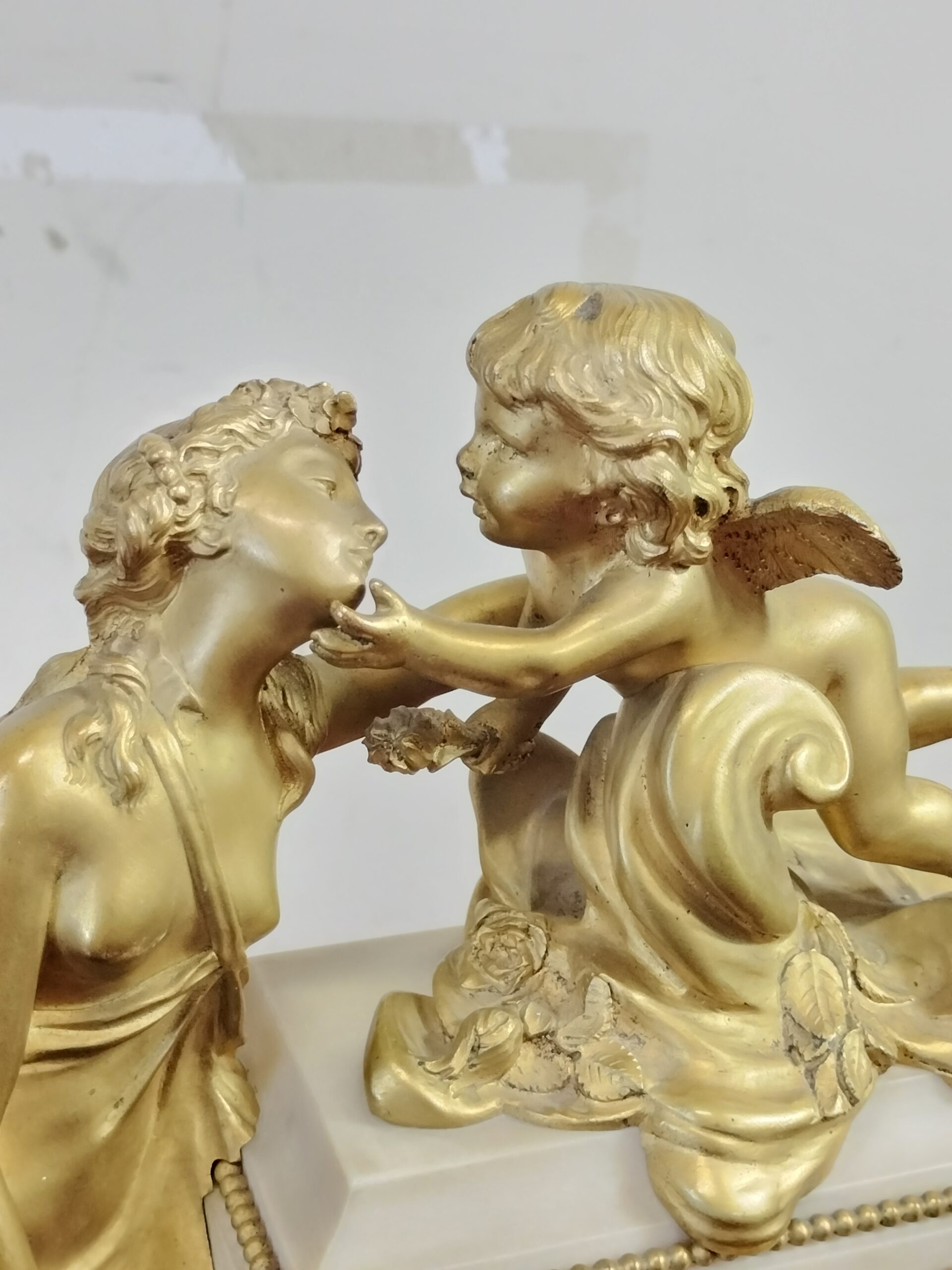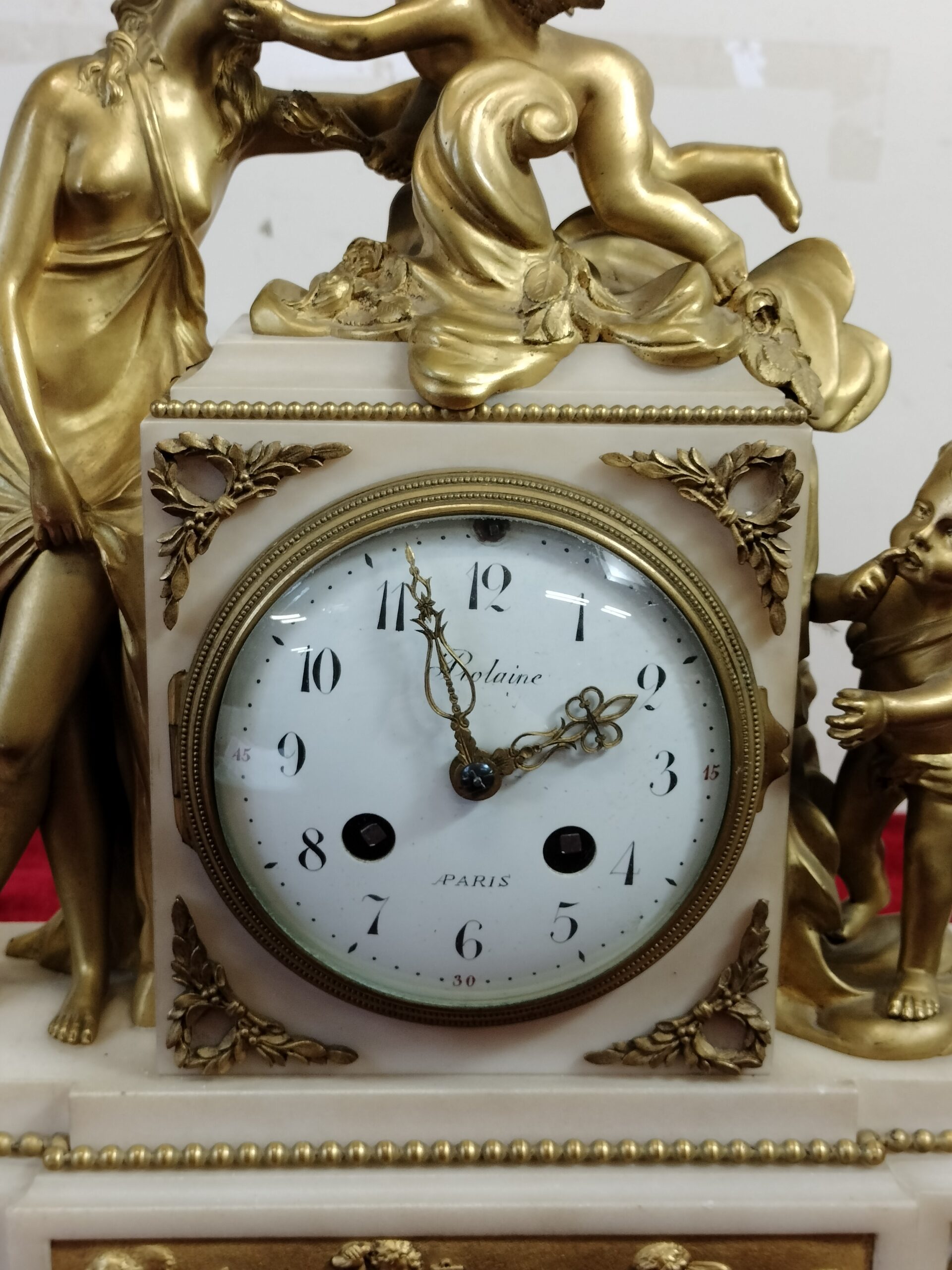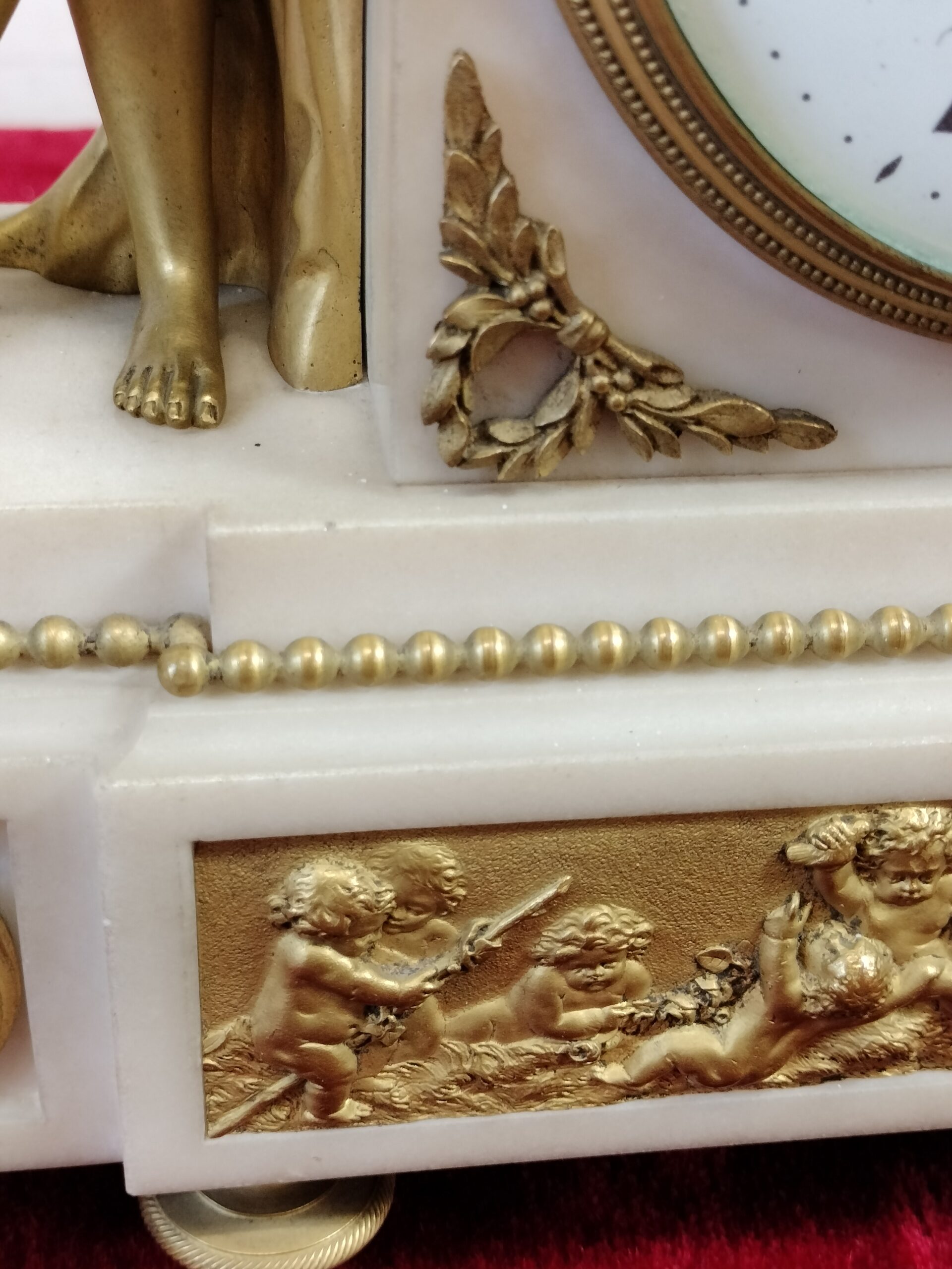 VER IMÁGENES PARA COMPROBAR EL ESTADO REAL.  LAS IMÁGENES FORMAN PARTE DE LA DESCRIPCIÓN.  ANTIGUO RELOJ DE ESTILO LUIS XVI.  BRONZE DORADO Y MÁRMOL.  LAS FIGURAS DE LA PARTE SUPERIOR REPRESENTAN A VENUS CON PUTTI. LA FIGURA DE VENUS SE ENCUENTRA DESUNIDA.  ORNAMENTADO CON UNA PREDELA INFERIOR CON PUTTI.  ESFERA FIRMADA PROLAINE.  MAQUINARIA CON SONERÍA. PÉNDULO APARTE, SIN HILO DE COLGAR. SE INCLUYE LLAVE.  LA MAQUINARIA PRECISA REPASO. BUEN ESTADO GENERAL, VER IMÁGENES.  MEDIDAS:  34 CM ALTO.  32,5 ANCHO X 8,5 LARGO.