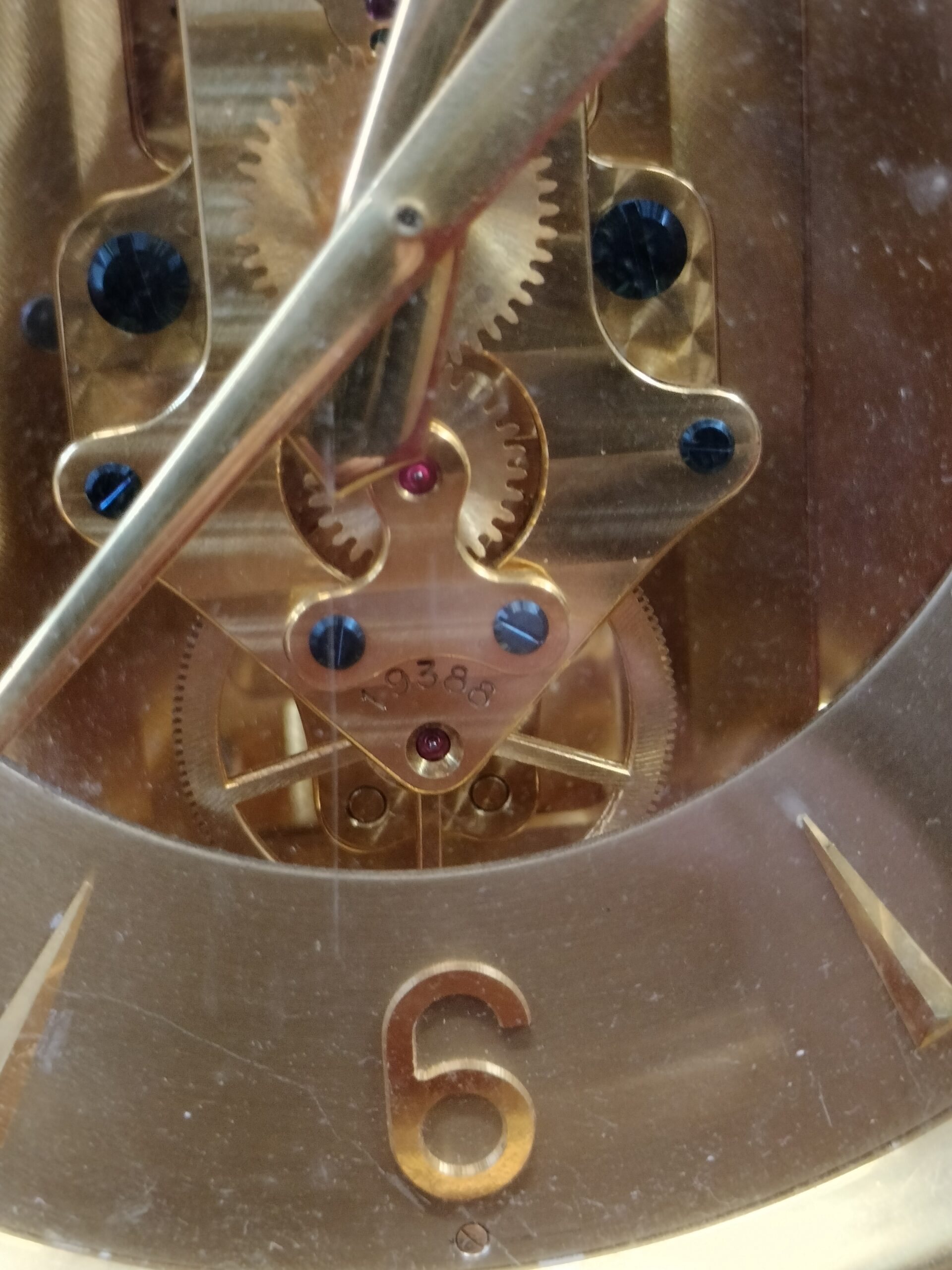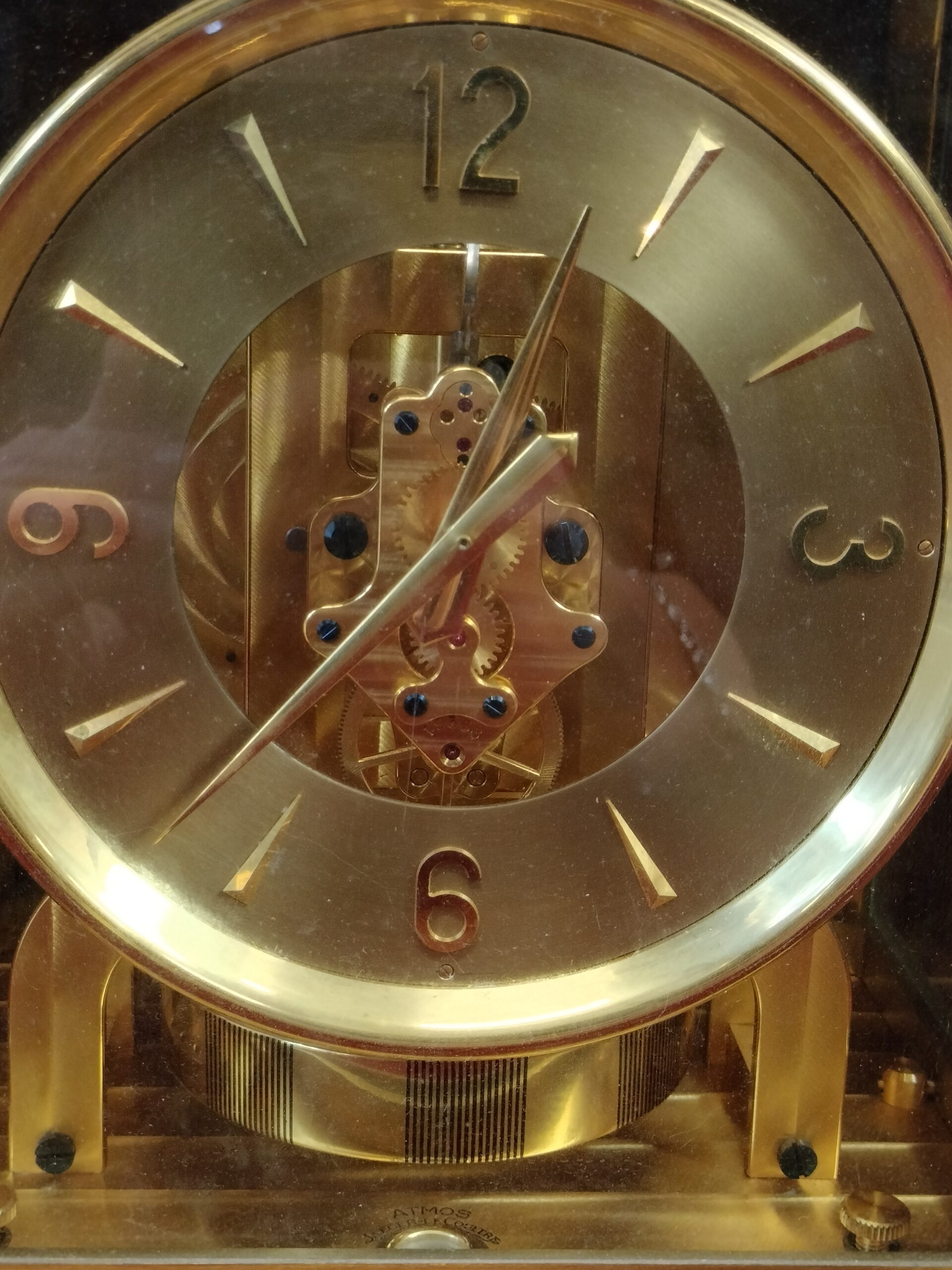 RELOJ DE SOBREMESA ATMOS. JAEGER-LECOULTRE. METAL DORADO Y VIDRIO. SUIZA. CIRCA 1950-60